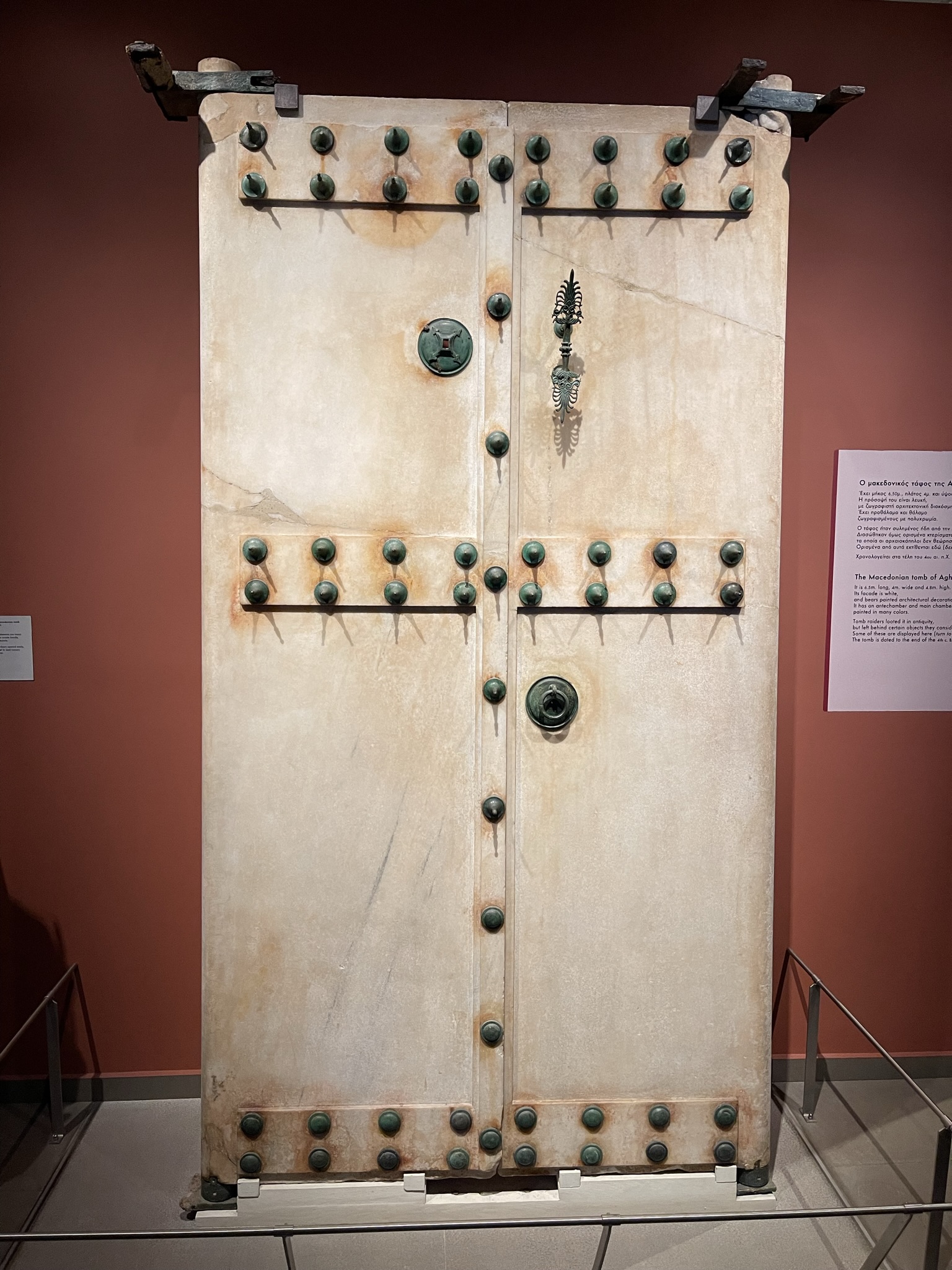 A white stone door with bronze circular decorations lined up in parallel to one another at the Archeological Museum of Thessaloniki