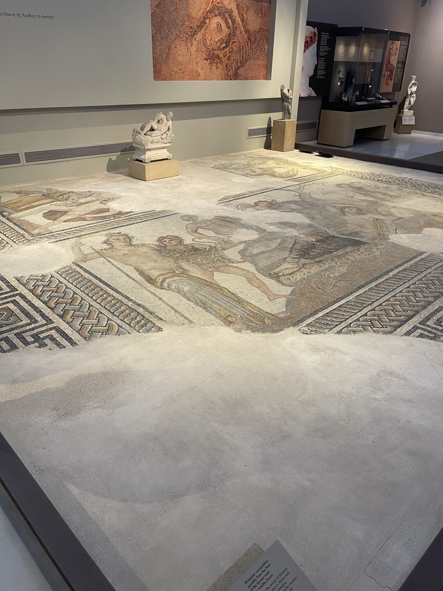 The Mosaic with holes depicts the arrival of Dionysus and his followers in Naxos and the discovery of Ariadne at the Archeological Museum of Thessaloniki