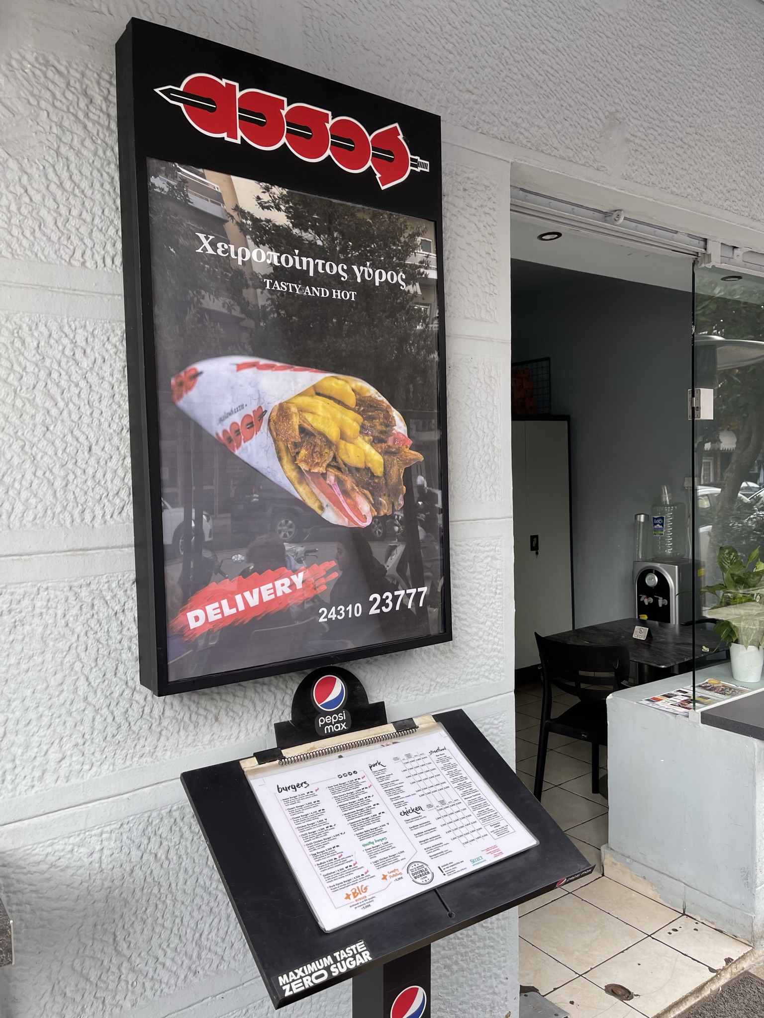 The front entrance of Assos has a menu on a stand and Assos Sign shows a gyro.