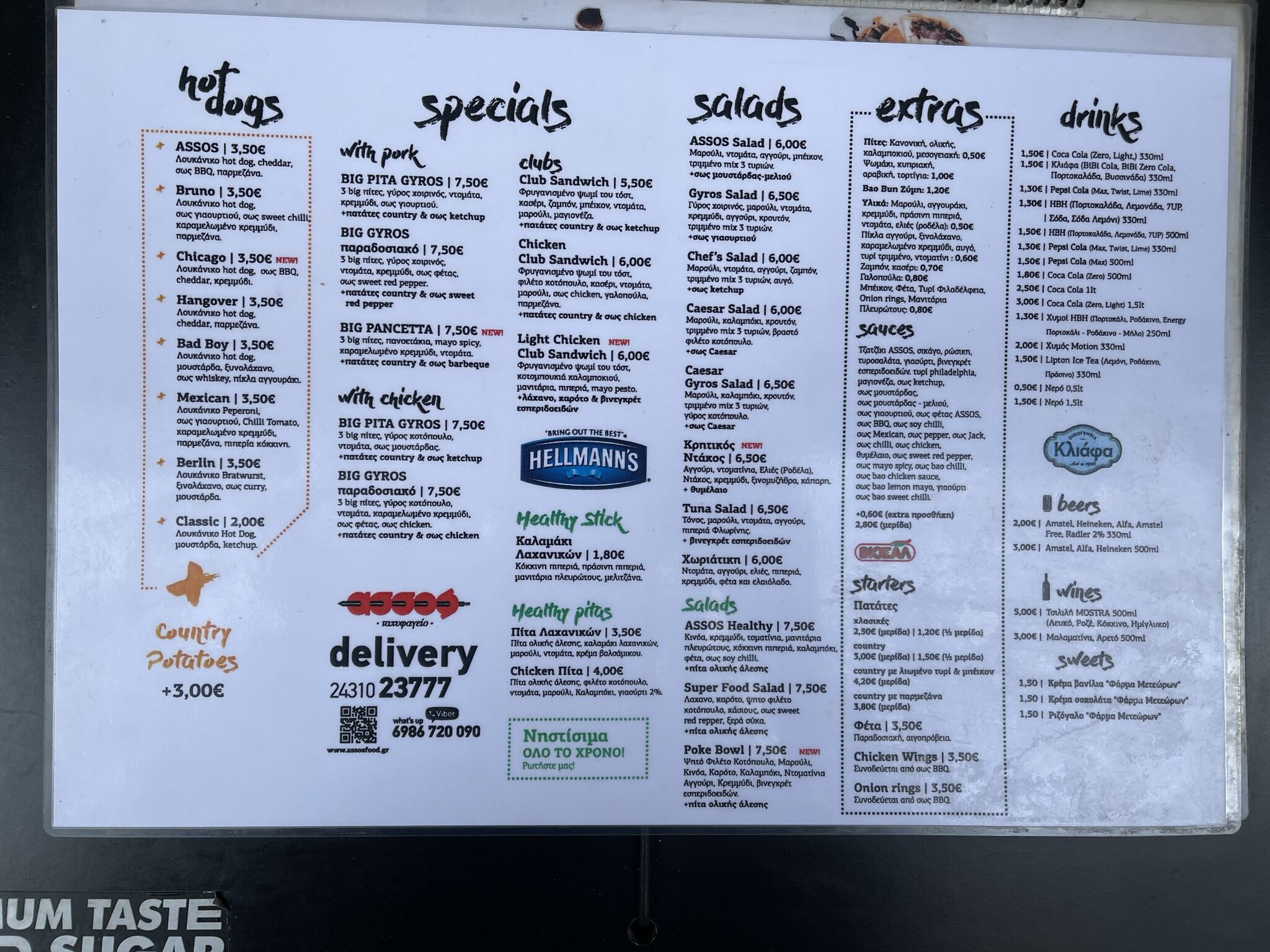 The Assos menu includes hot dogs, specials, salads, extras, and drinks