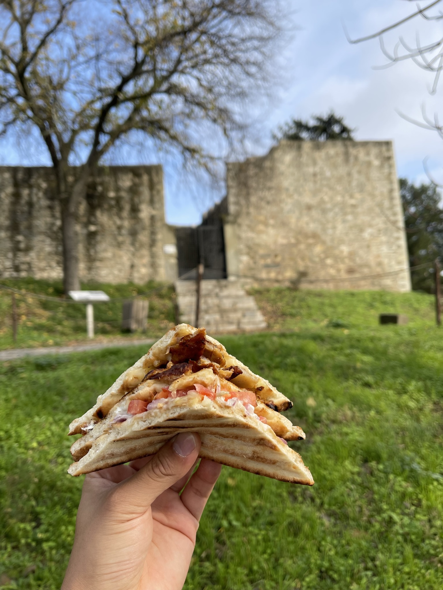 Big Pancetta sandwich with the byzantine castle in the background