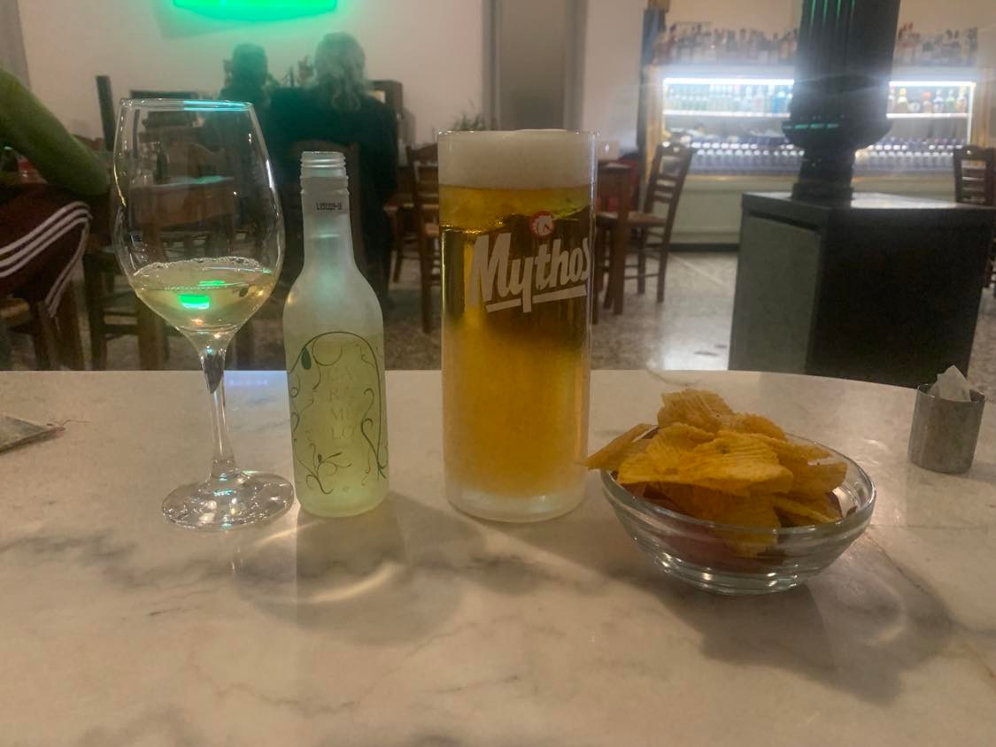 A glass of white wine and a 16oz draft of Mythos beer served with a small bowl of potato chips