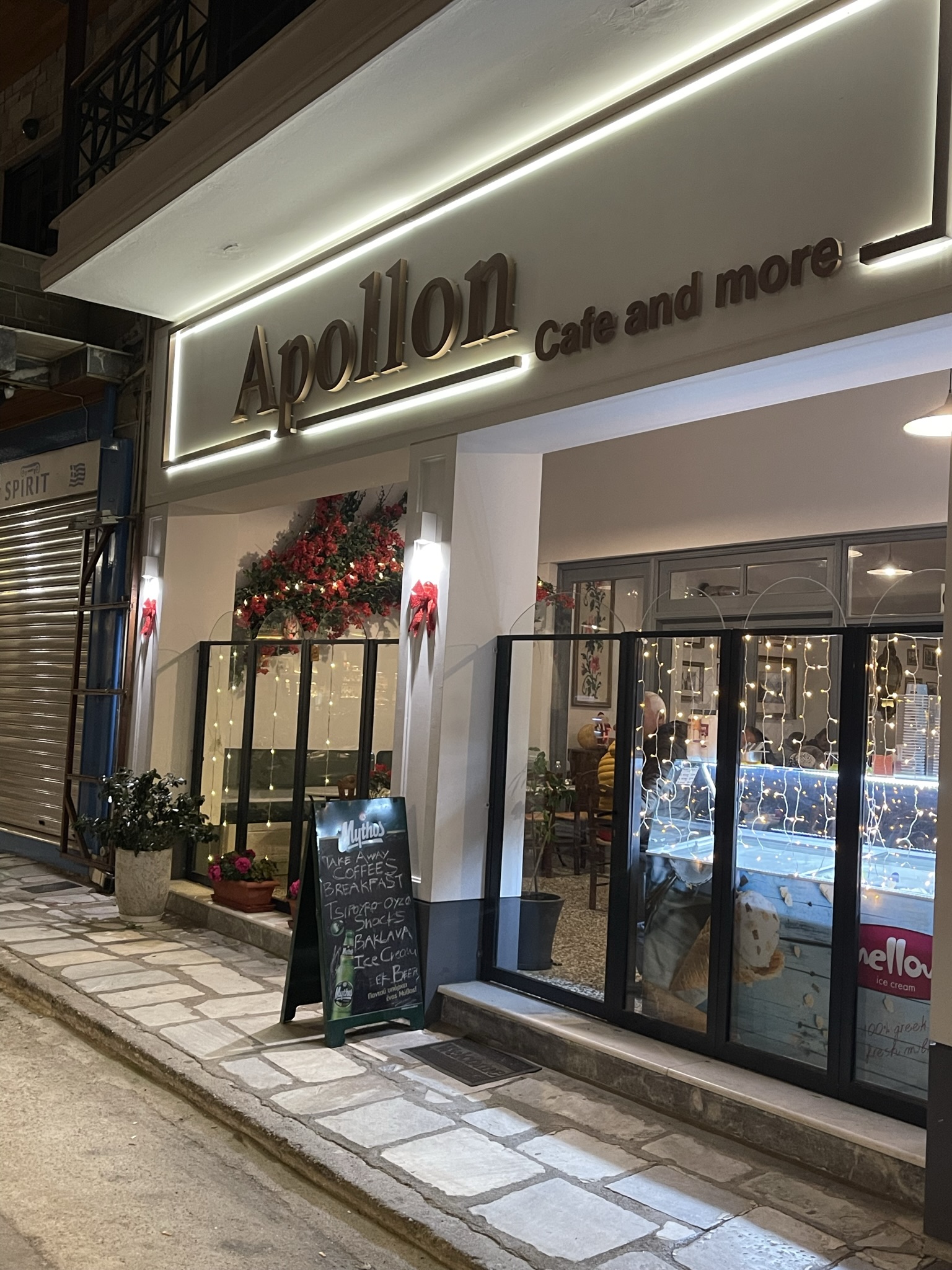 Cafe Apollon Main Entrance is decorated with lights and flowers