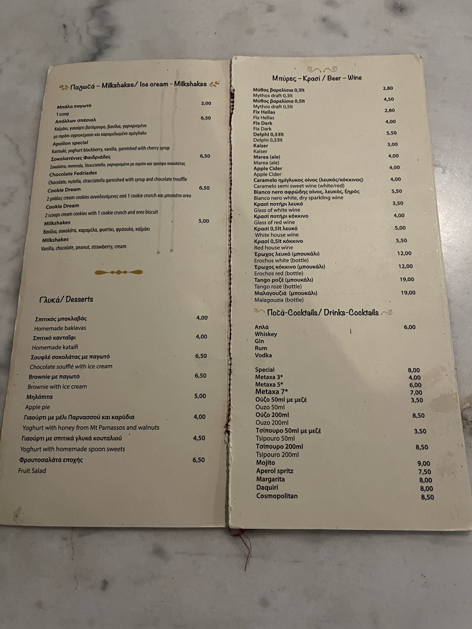 Cafe Apollon menu includes ice cream, desserts, beer, wine and cocktails