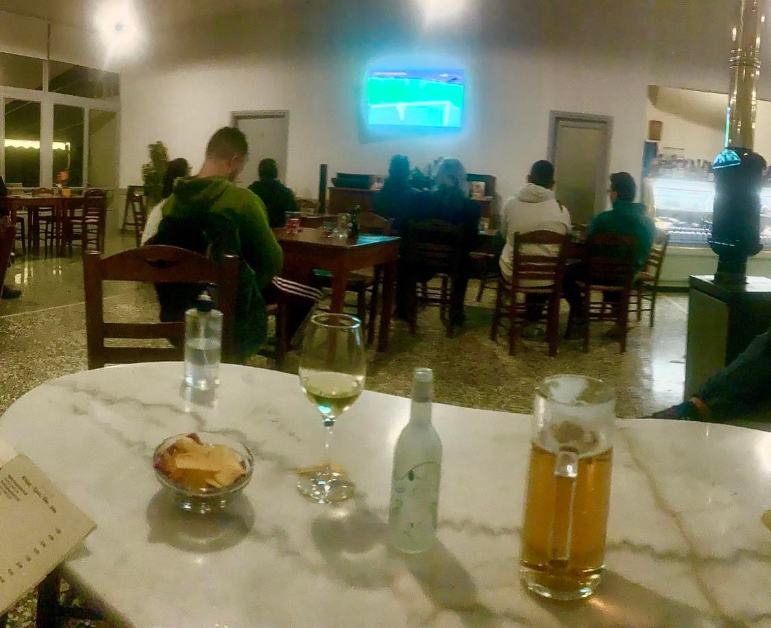The atmosphere was filled with a tense air but with a lot of joy and excitement with each minute the game passed. People shouted in jubilation when there was a goal. When it got to the final penalty kicks, there was so much anticipation for each penalty kick. When the game finally ended, it felt like the trance was released and everyone was free. It was a nice way to enjoy a night in the city of Delphi. We paid 8,50 euros for both drinks.