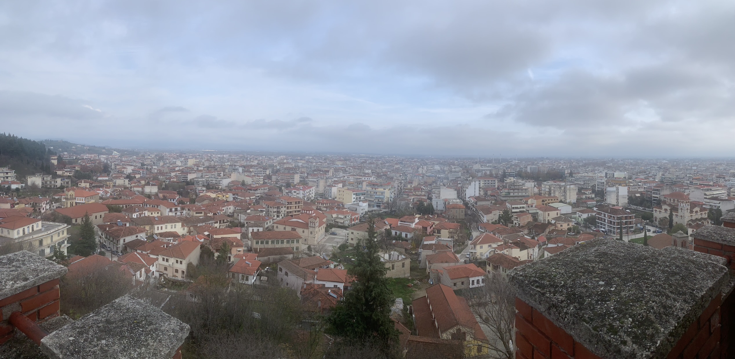 The view of Trikala from the clock tower shows buildings with red roofs