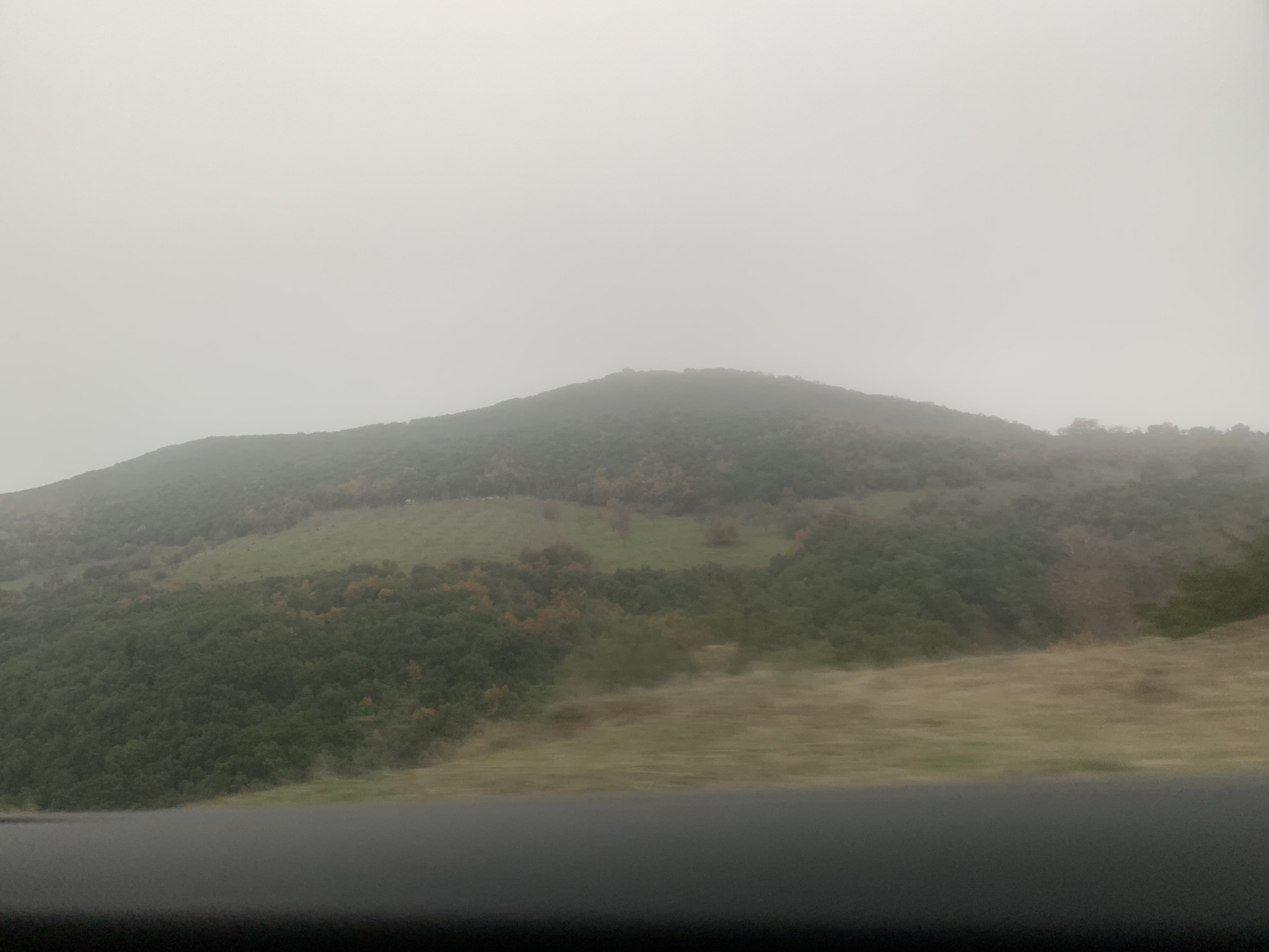 View of the mountain in the thick fog can be seen from the car