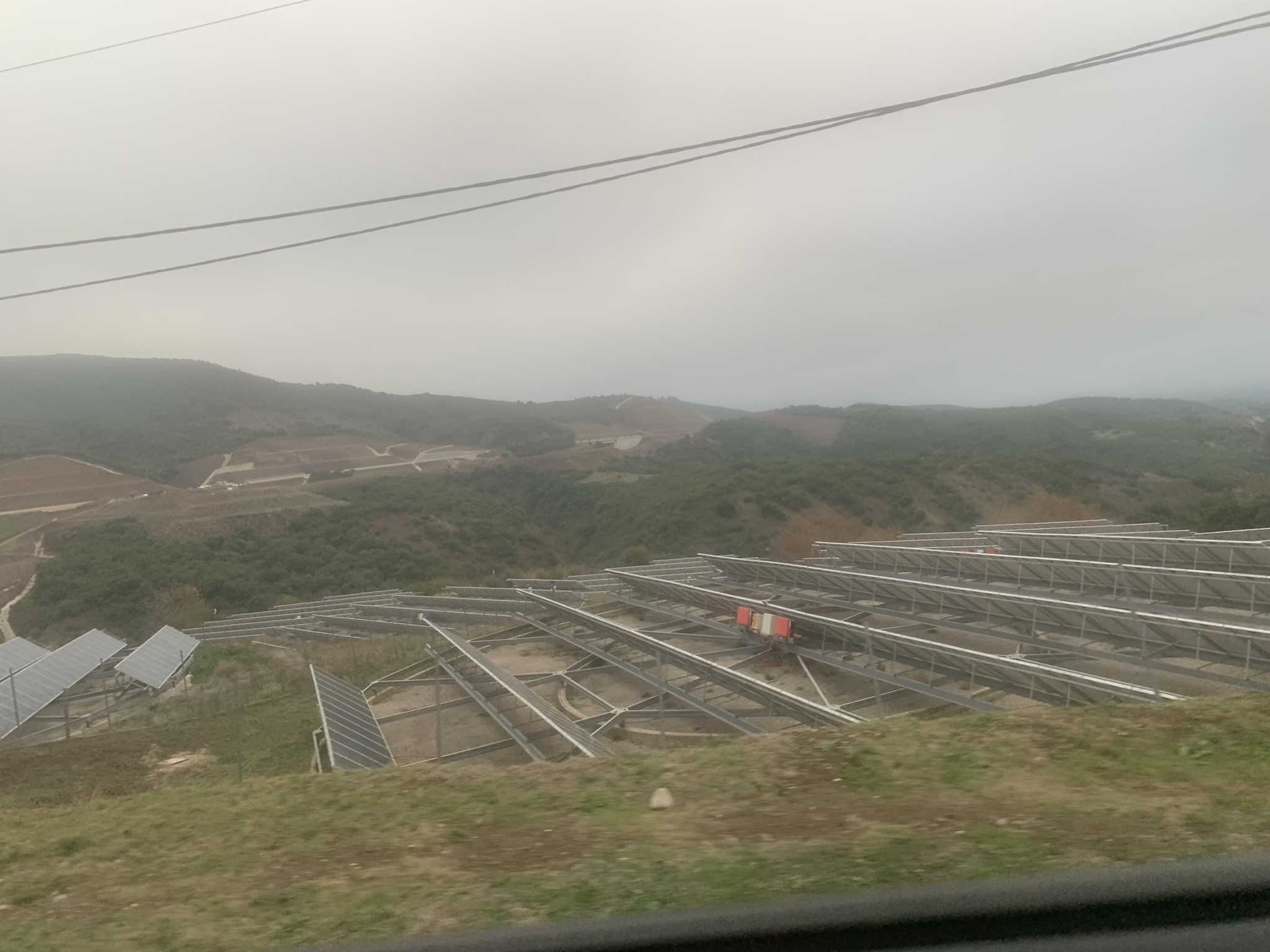 View of solar panels on a cloudy day can be seen from the car