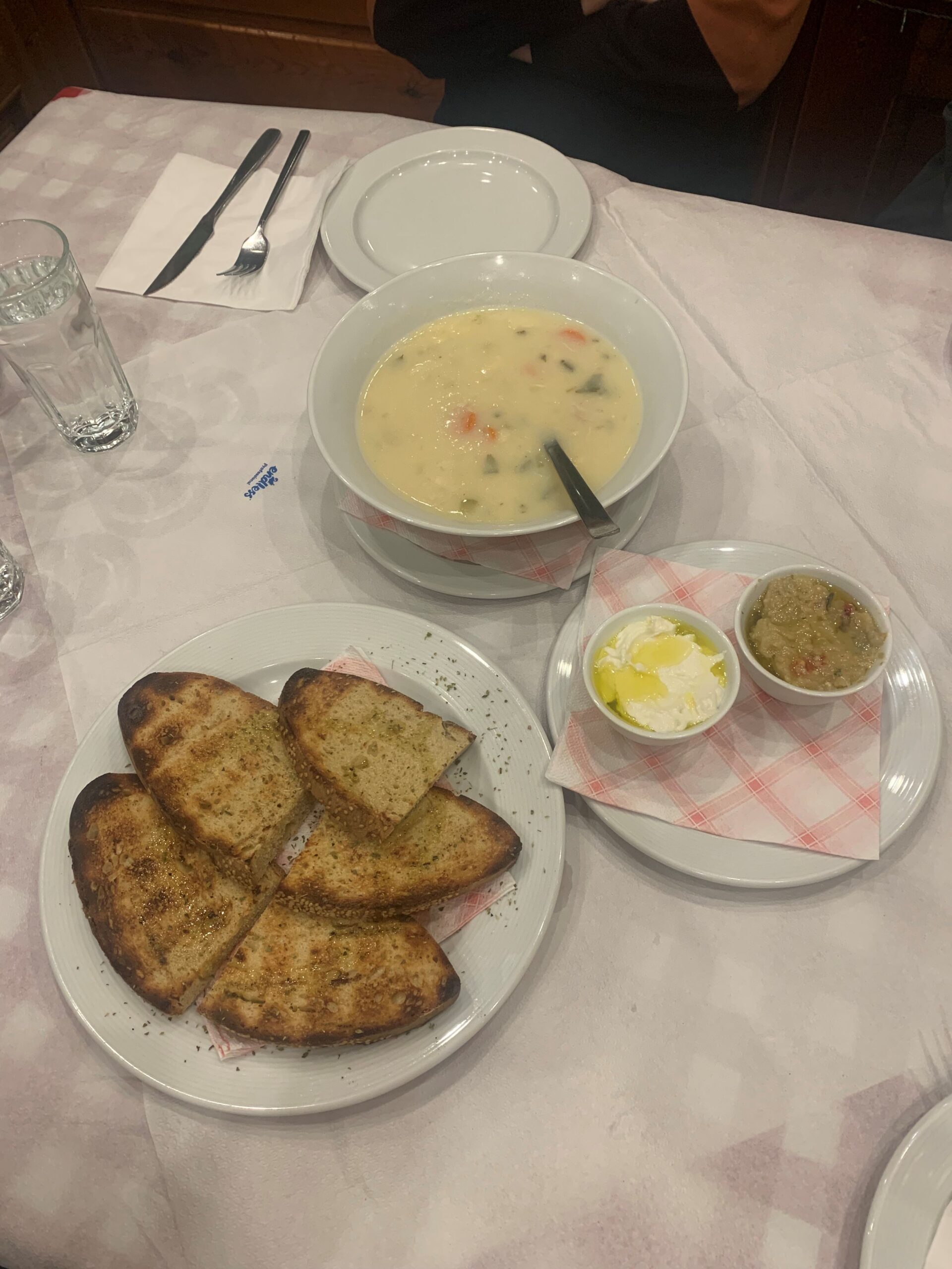 Left corner is grilled bread, top center is lemon chicken soup, and bottom right are small bowls of dill and eggplant sauce
