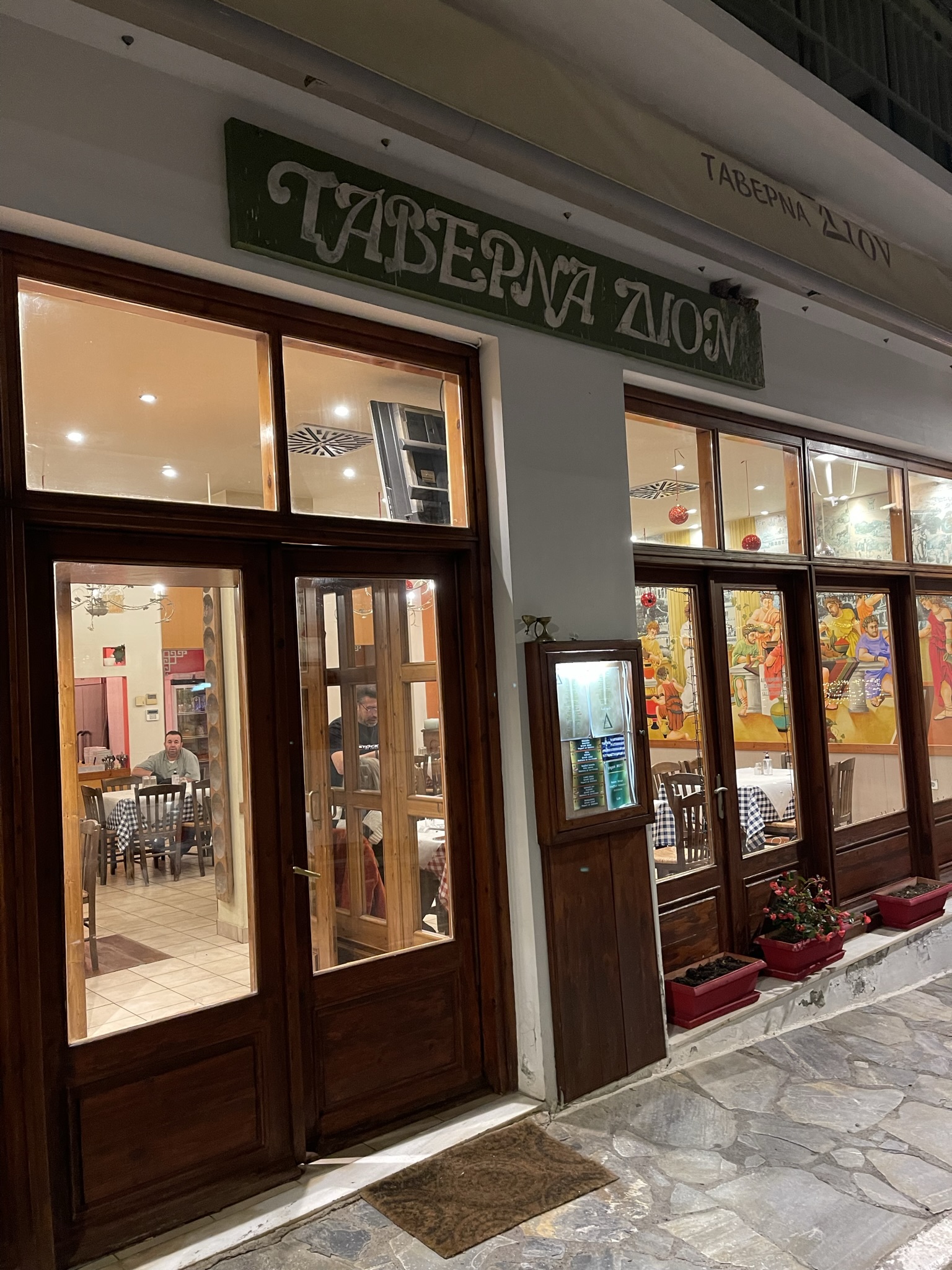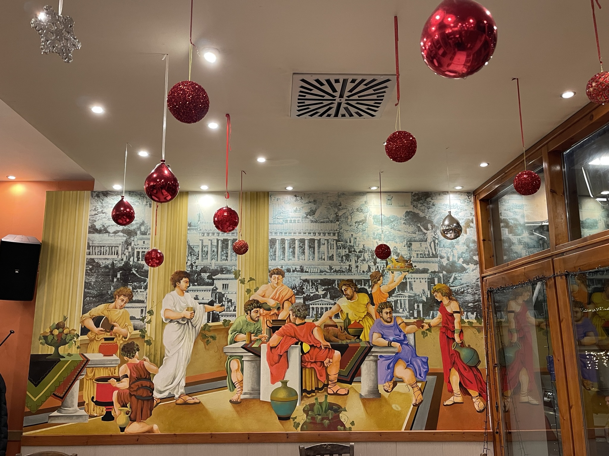 Tavern Dion's restaurant's decoration depicts people eating and drinking