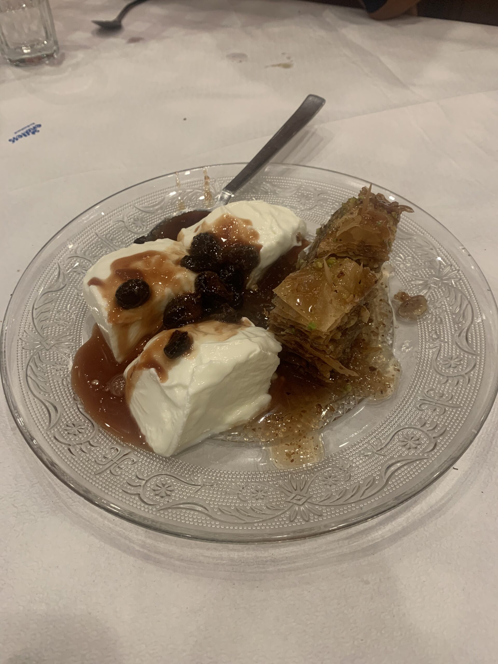 Greek cheese and two baklavas drizzled with honey syrup, nuts, and raisins served on a decorative clear plate