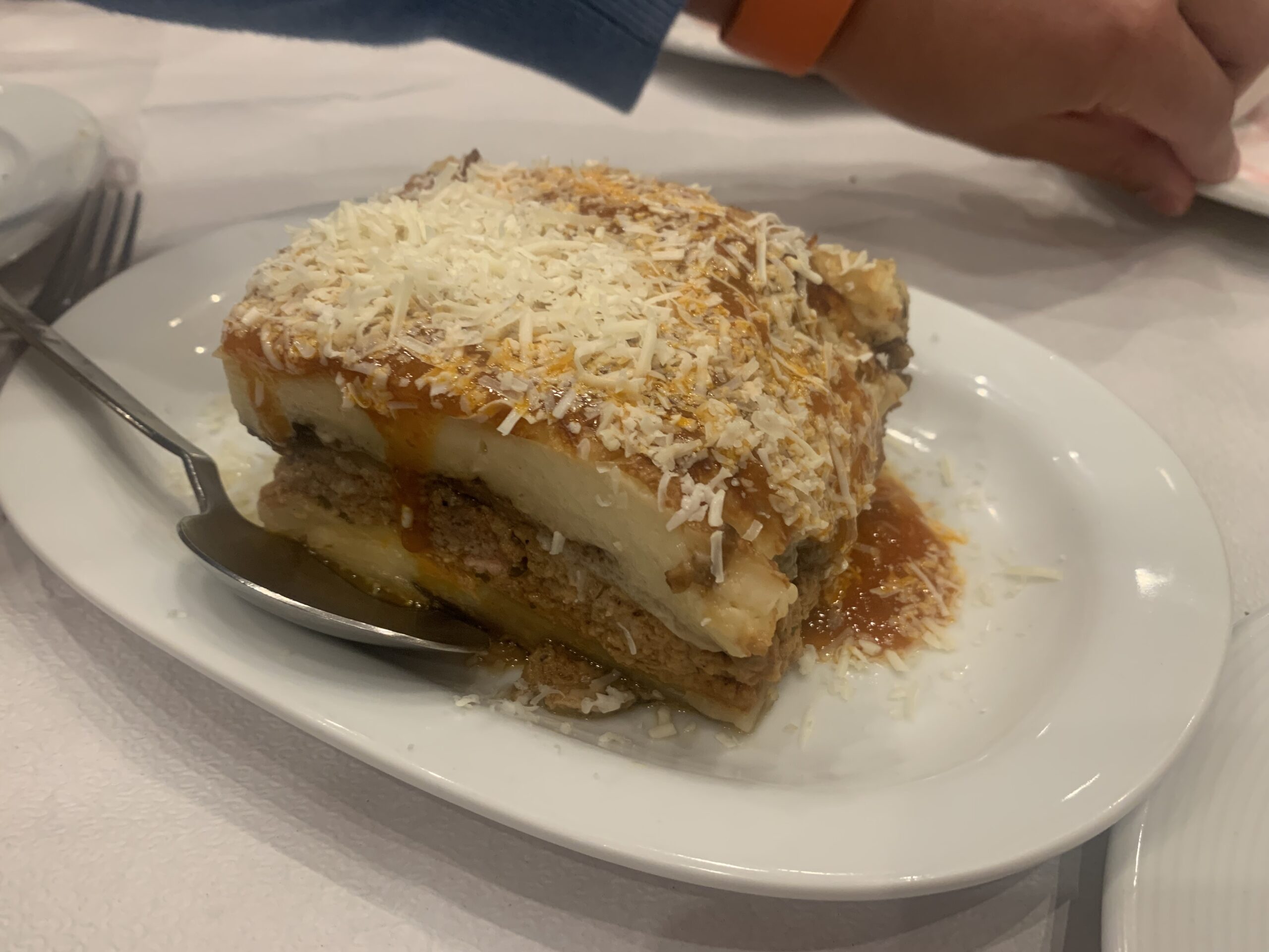 Moussaka served on a white plate and with a metal spoon