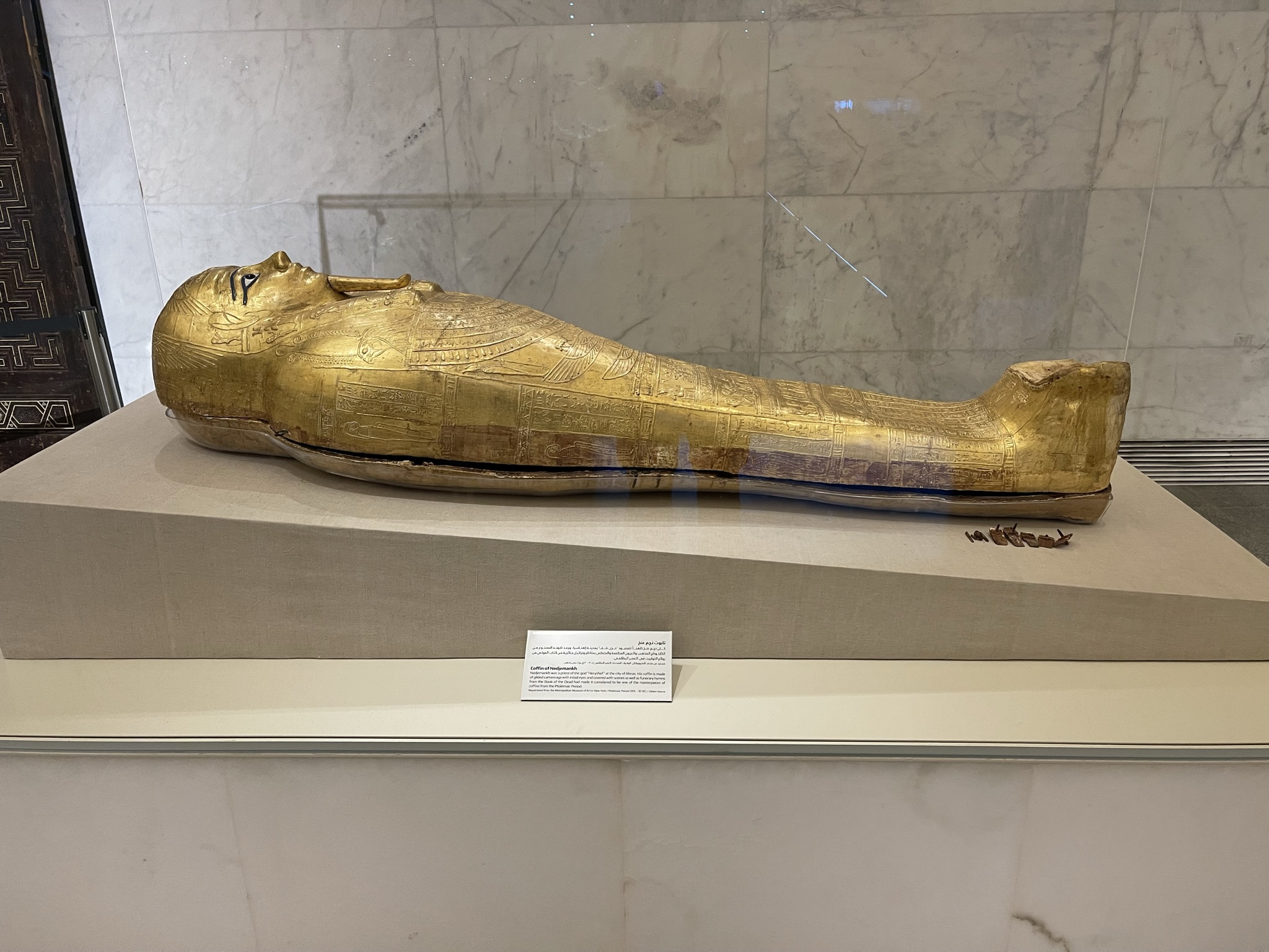 One of my favorite artifacts was the golden Coffin of Nedjemankh that housed an important priest with a very interesting backstory on how the coffin was obtained. The coffin was looted in 2011 during the Arab Spring and was eventually smuggled to a Parisian art dealer who sold it to The New York Metropolitan Museum of Art (The Met) for ~$4M in 2017. The art dealer created an elaborate backstory with falsified papers on how they obtained the coffin dating back to the 1930s; however, The Met realized the provenance papers were forged and returned the coffin to Egypt in 2019.