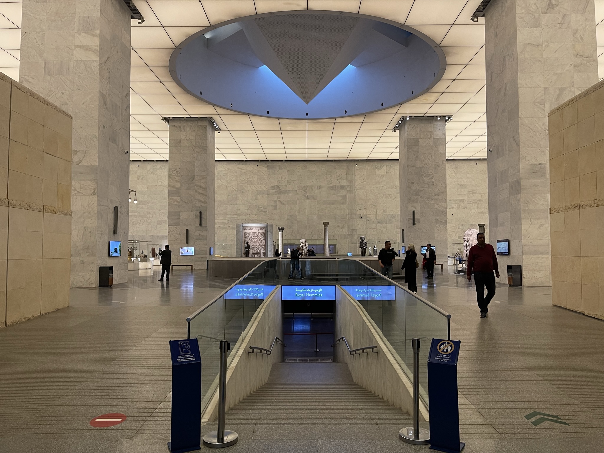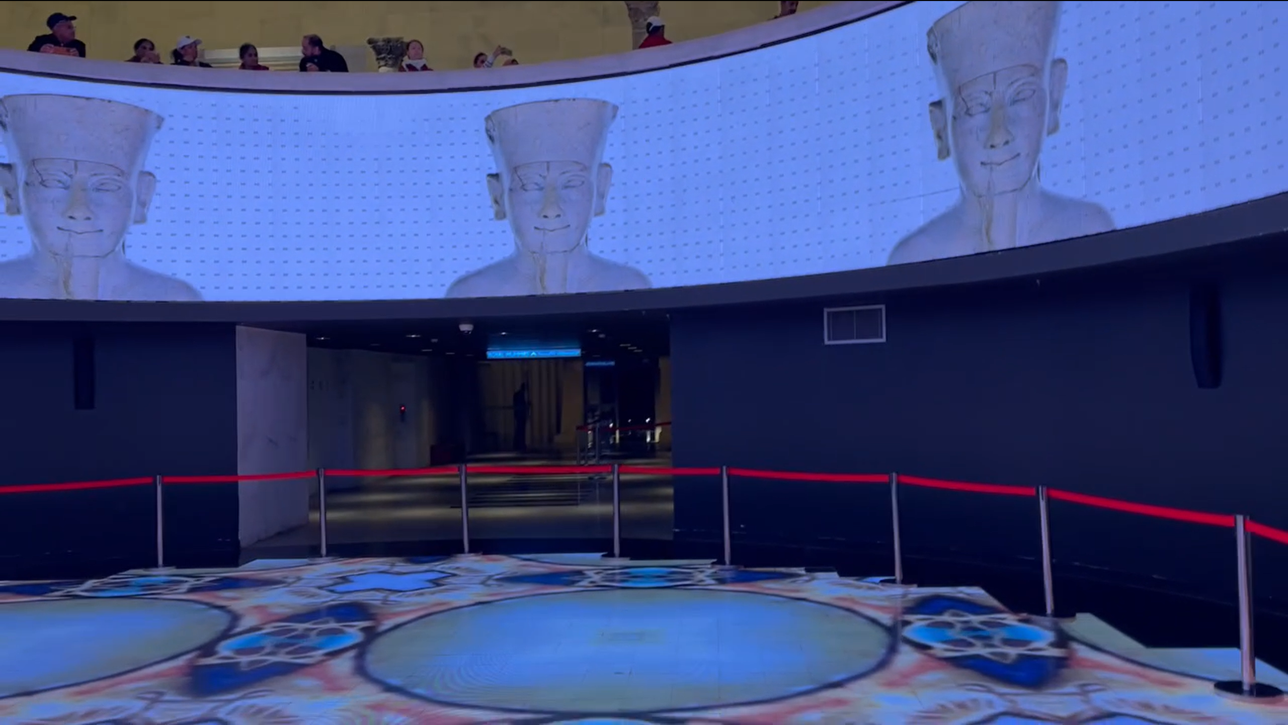 Next, I went to the Main Hall where I was immediately drawn to the large circular section known as “the core.” Within the circle, at the bottom of the open area there were projections showing different patterns and along the wall there were projections of the Royal Mummies. At the top of the building, there was an upside down pyramid, which was truly a sight to behold. The Main exhibit hall shows the evolution of Egyptian civilization featuring statues, jewelry, scrolls, and many other types of artifacts ranging from the ancient Egyptian times to Roman Greco to modern times.