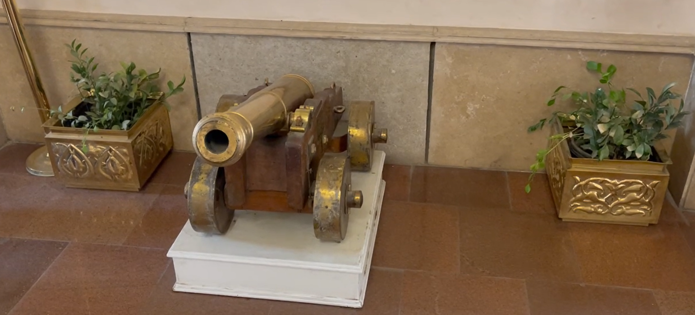 When I entered the lobby of the museum, there was a map displaying the suggested route through the exhibits. Near the map, there were several fascinating artifacts on display, including a golden cannon. After walking past the lobby, I walked into a vast courtyard reminiscent of a presidential palace, which was adorned with rows of cannons, cannon balls, and statues.