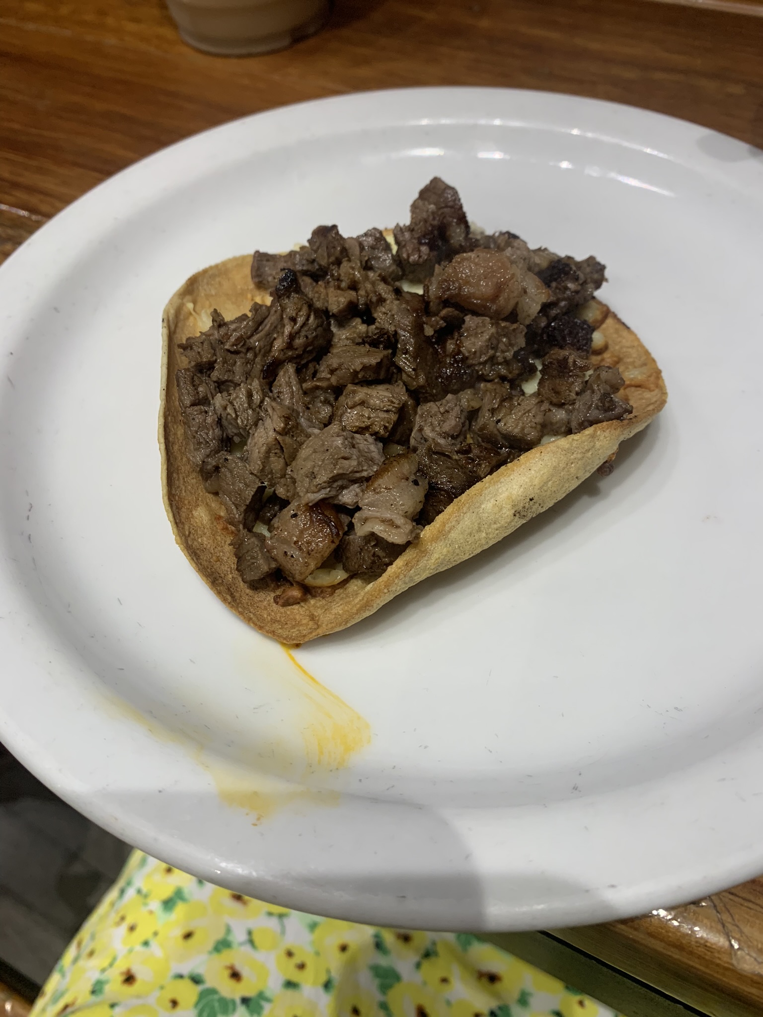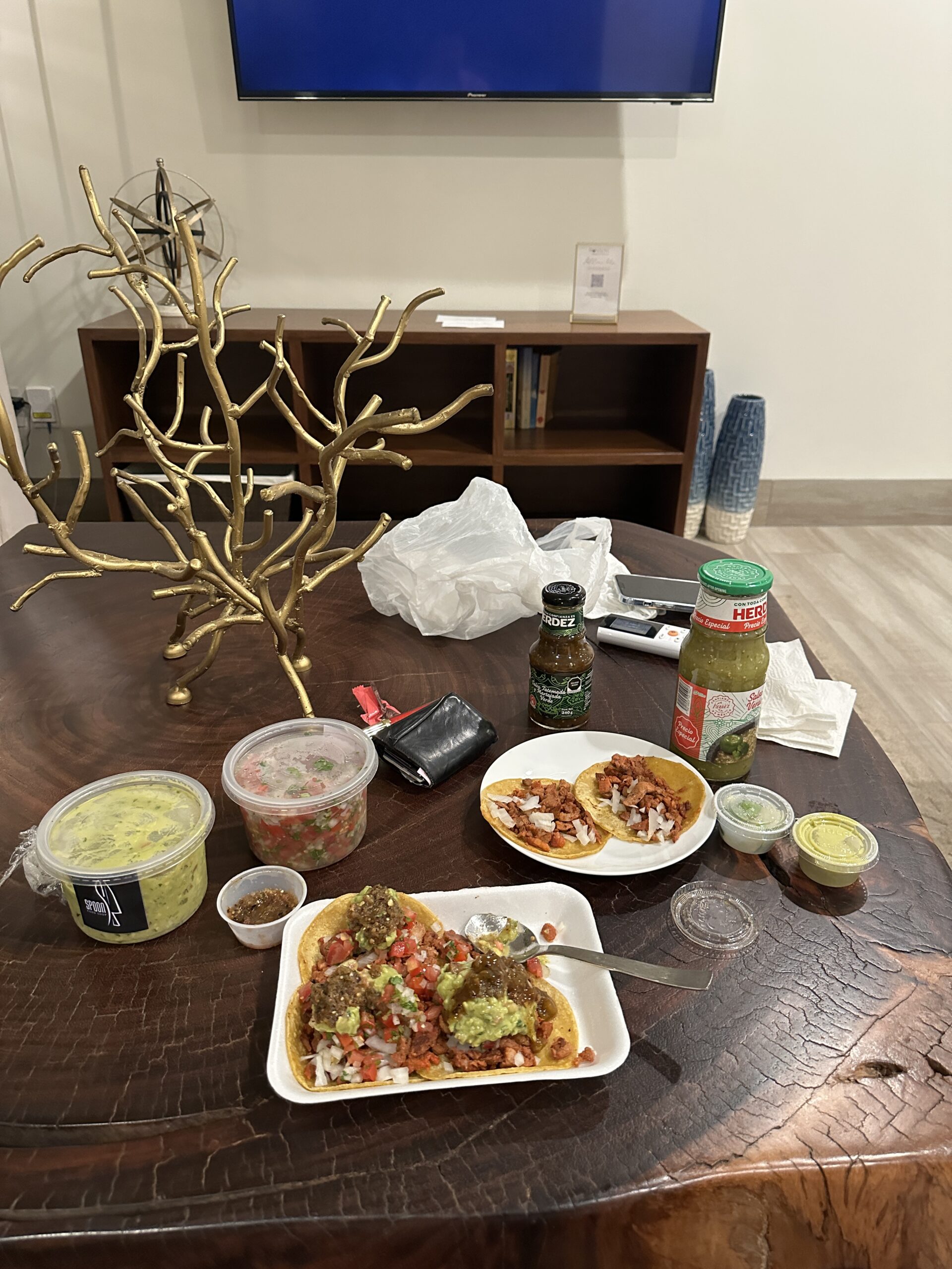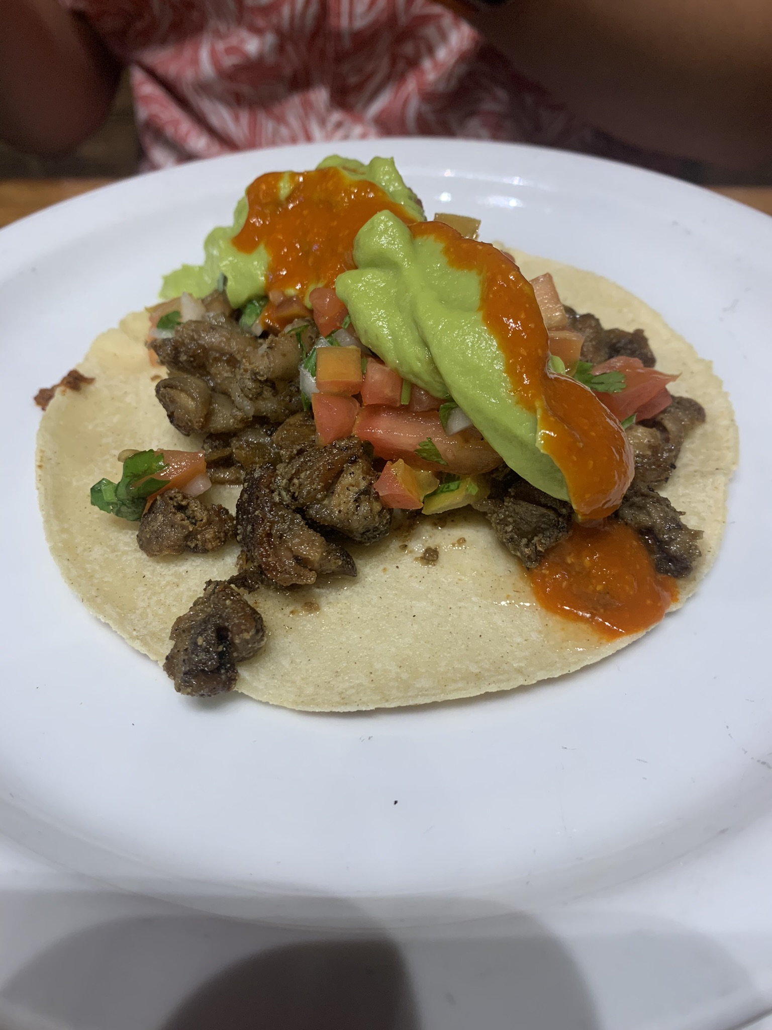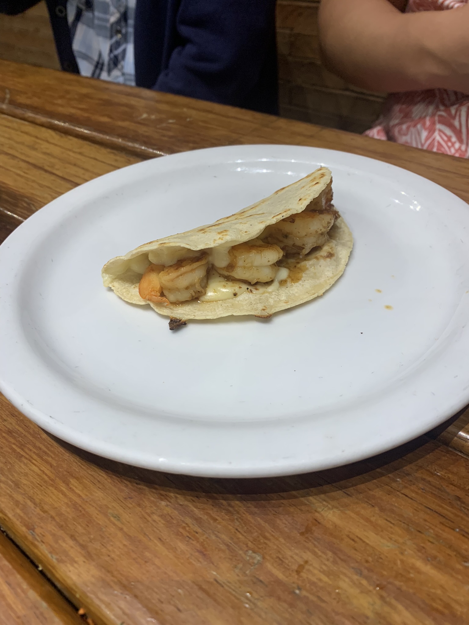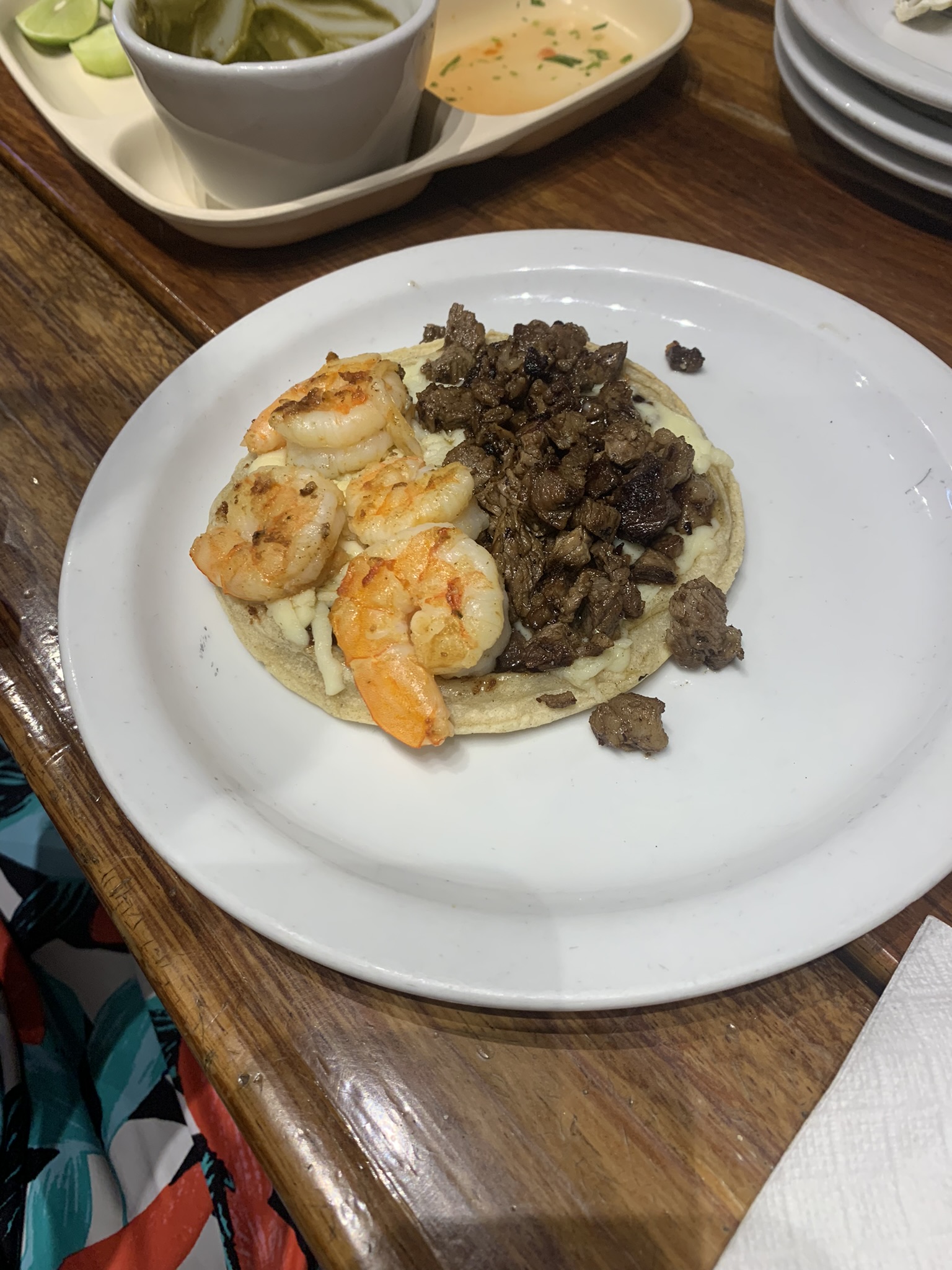 Once we sat down to eat, we ordered a bunch of tacos. I ordered a pastor taco, which is a taco with pork and pineapple, and an asada vampiro, which is a toasted tortilla topped with melted cheese and choice of meat. My brother ordered a quesadilla de camaron, a pastor taco, and a carne asada taco. My brother was unhappy with his quesadilla de camaron because it was as small as a taco and only came with three pieces of shrimp. For the table, the waitress gave us an assortment of salsas including tomatoes, spicy sauces, guacamole, and a bowl of radish and cucumbers. While waiting for the food, I dipped the cucumbers into the guacamole. For drinks, I ordered Jamaica, made from hibiscus and sugar, and my brother ordered Horchata, made from rice, cinnamon, sugar, and milk. I paid $721 pesos ($45 usd) for approximately 12 tacos and 3 drinks.
