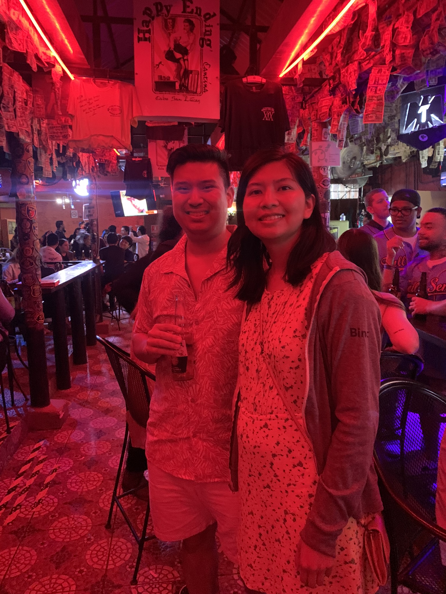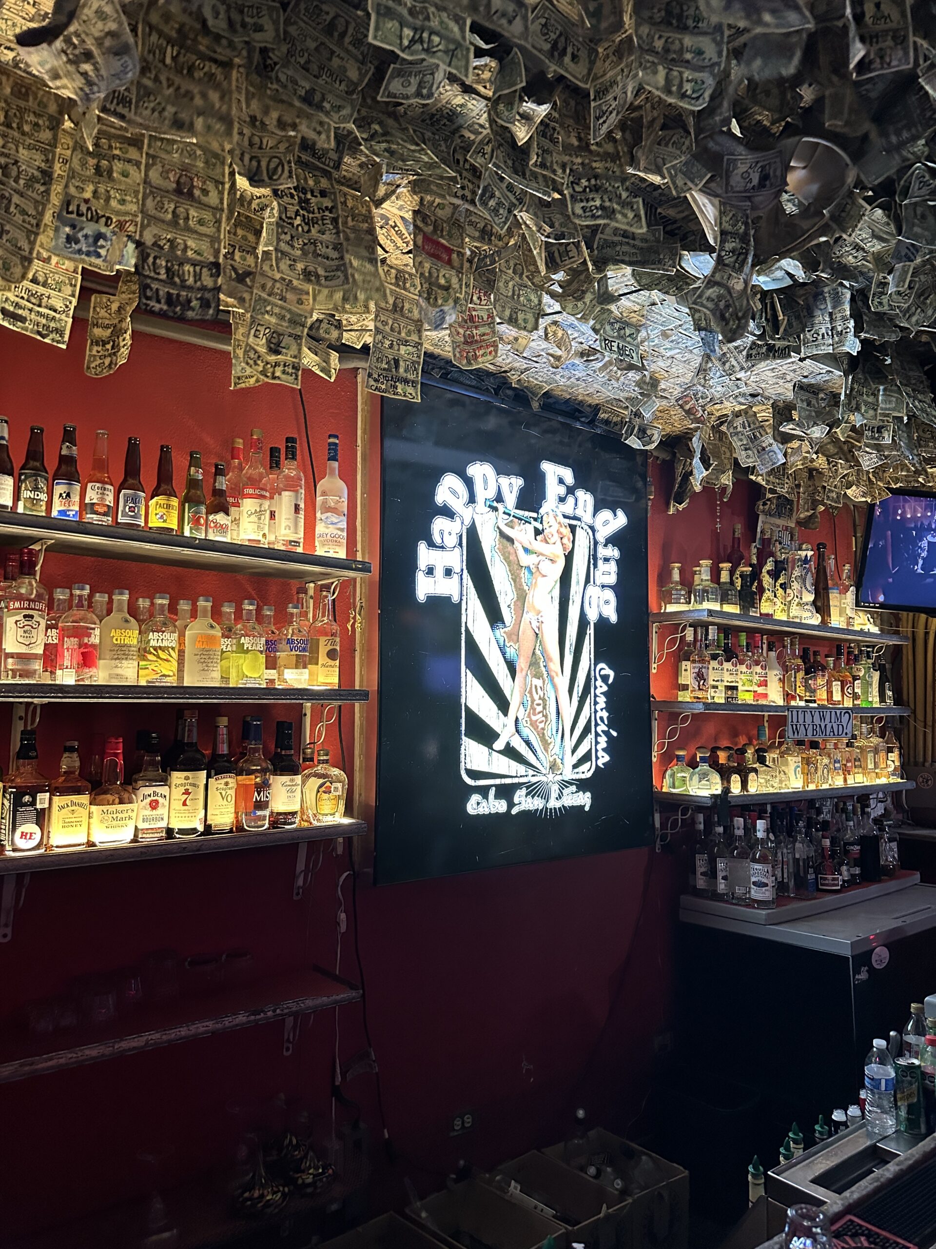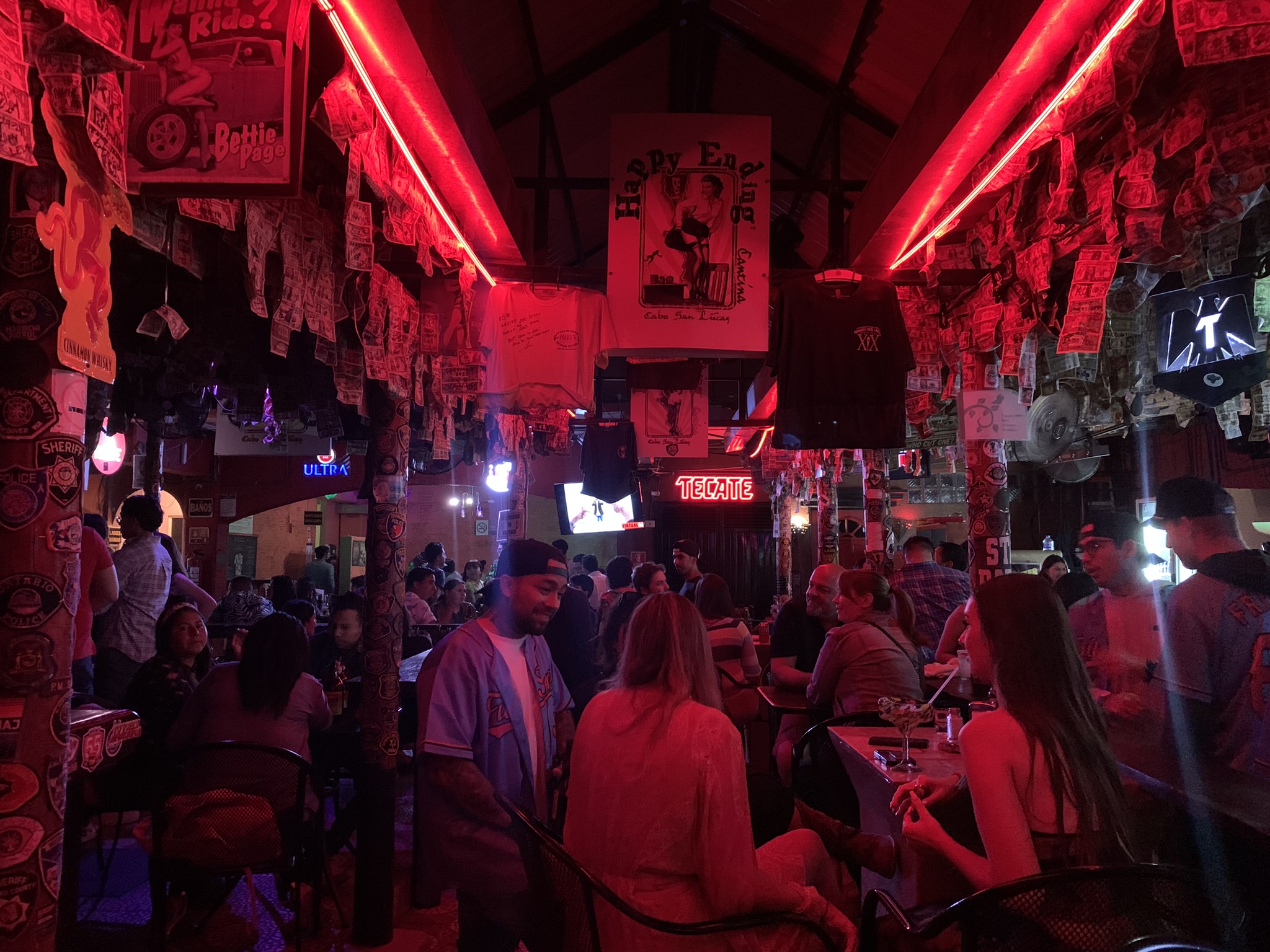 After dinner, we went to a bar called Happy Ending, which is known for cheap drinks. The bar offered a special deal of 2 beers and 2 double shots for only $5 usd. The ambiance had a dark red hue with dollar bills hanging from the ceiling. As we explored the venue further, we saw a back room housing a beer pong table, adding an element of excitement to the overall experience. The lively ambiance was enhanced by Spanish music blasting in the background. Happy Ending was a very unique and enjoyable bar.