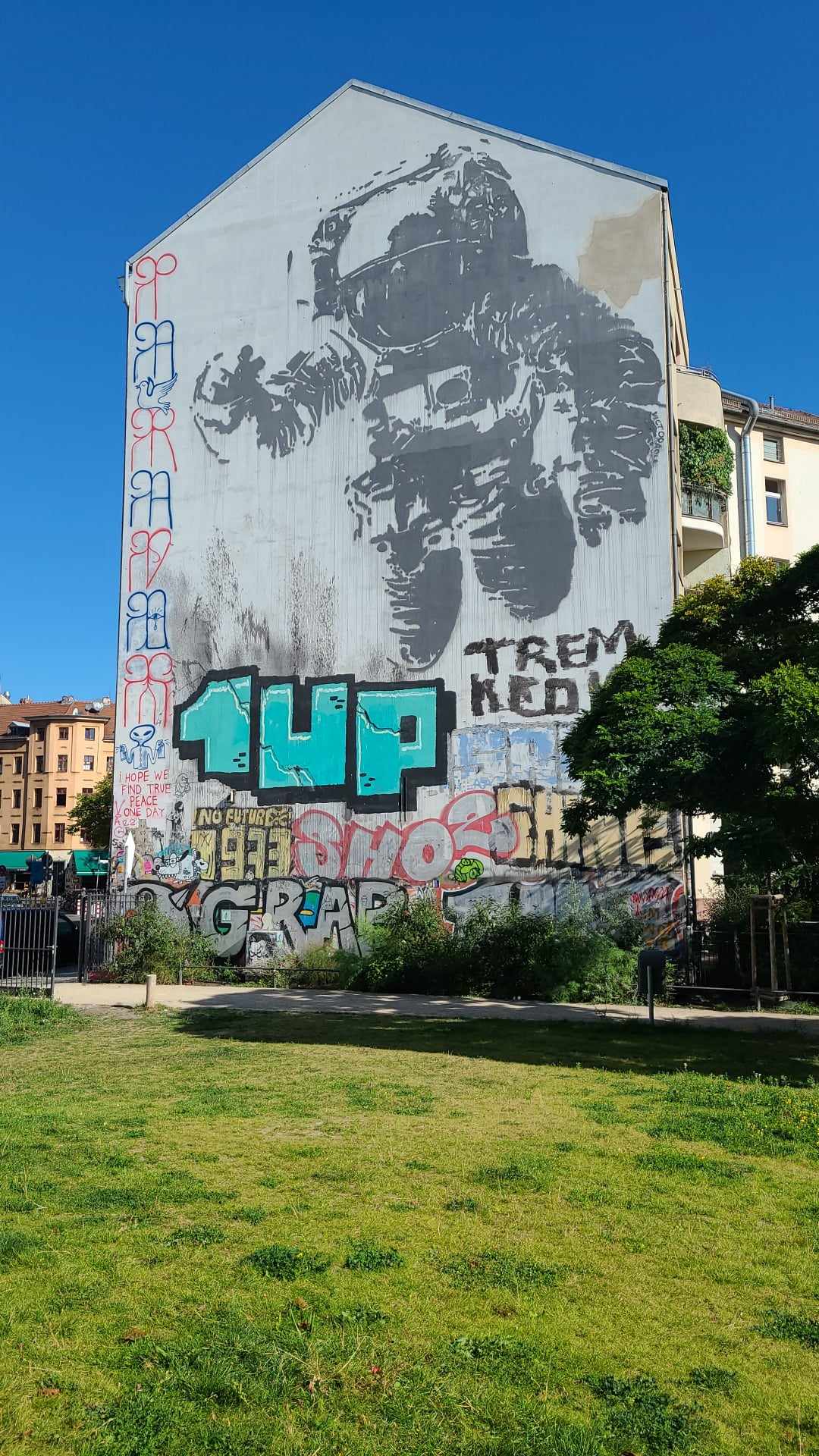 This mural, inspired by the Cold War and the space race between the Soviet Union and the United States, embodies the concept of battling for something beyond Earth—an abstract fight not waged with soldiers but in another dimension. Created in 2007, it stands as one of the oldest and best-preserved artworks in Kreuzberg. Remarkably, it has managed to remain intact and float above the creeping tags that often encroach on street art over time.