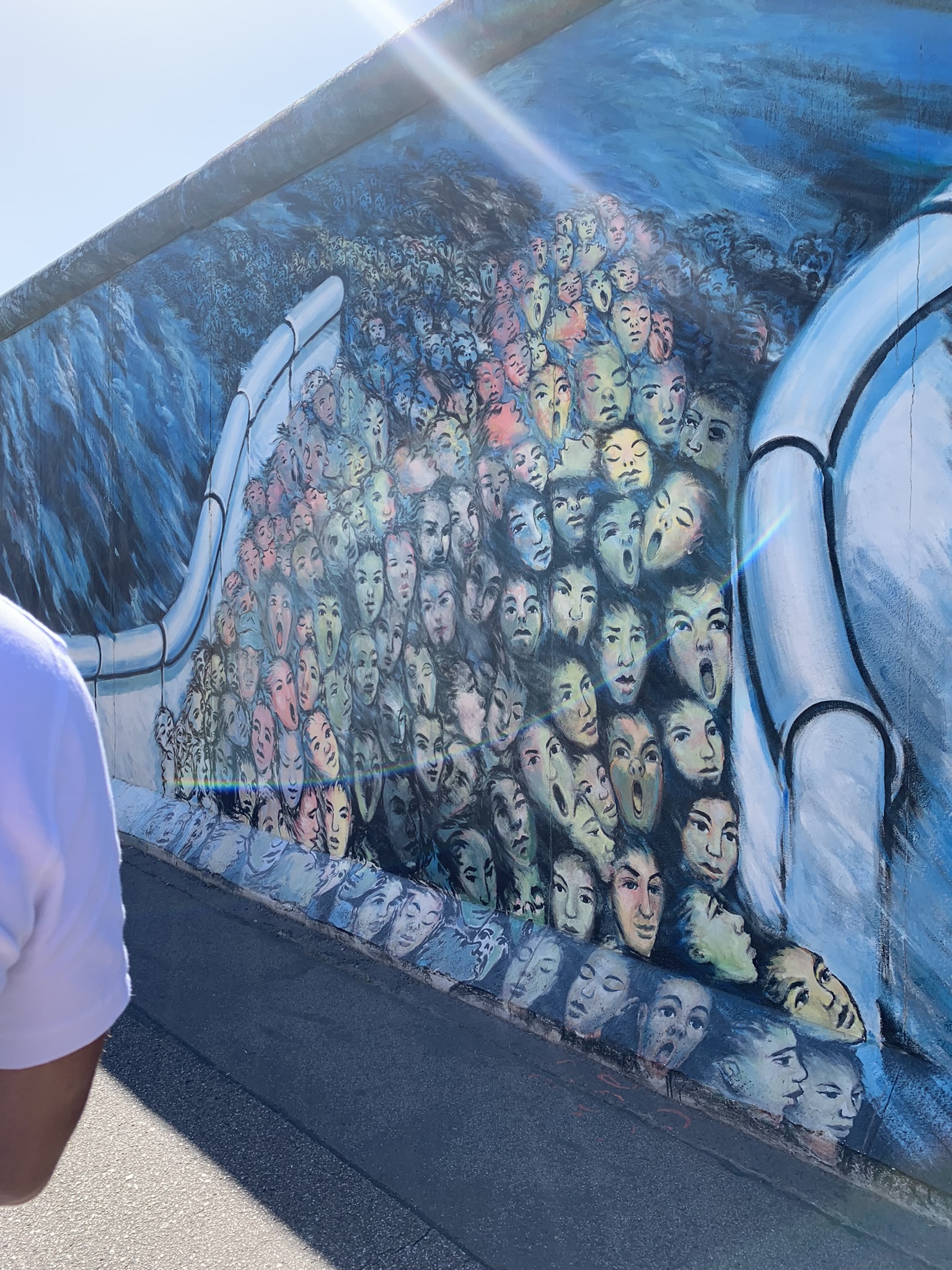 This mural was inspired by the range of emotions Alavi witnessed on the faces of East Germans as he watched the demolition of the Berlin Wall from his apartment in November 1989. It captures the expressions of East Germans who flooded to the West after the Wall fell. In an interview, Alavi recalled seeing East Berliners streaming through “live a wave of water. Some were joyful, some were doubtful, some were afraid they might [have the chance to] cross again.”