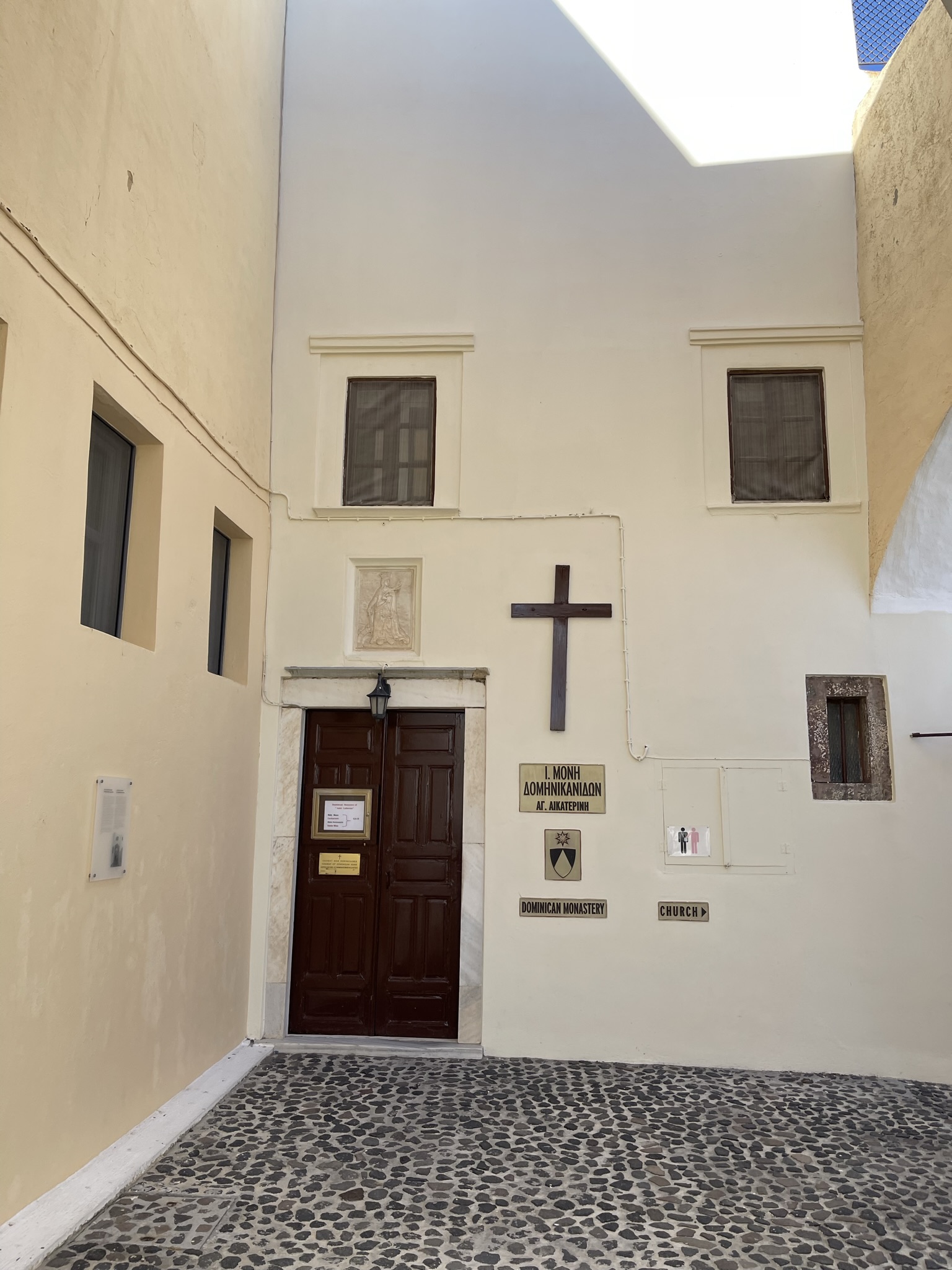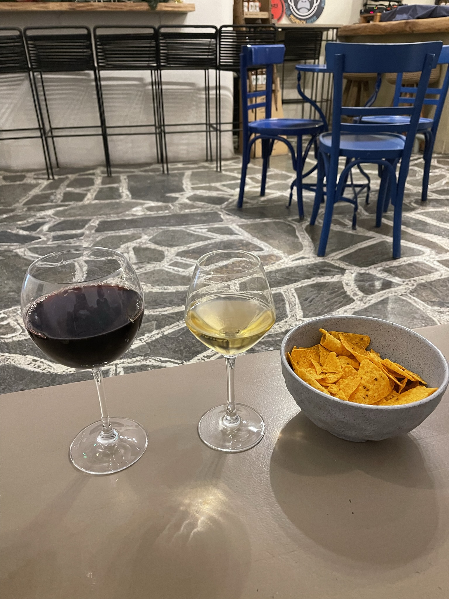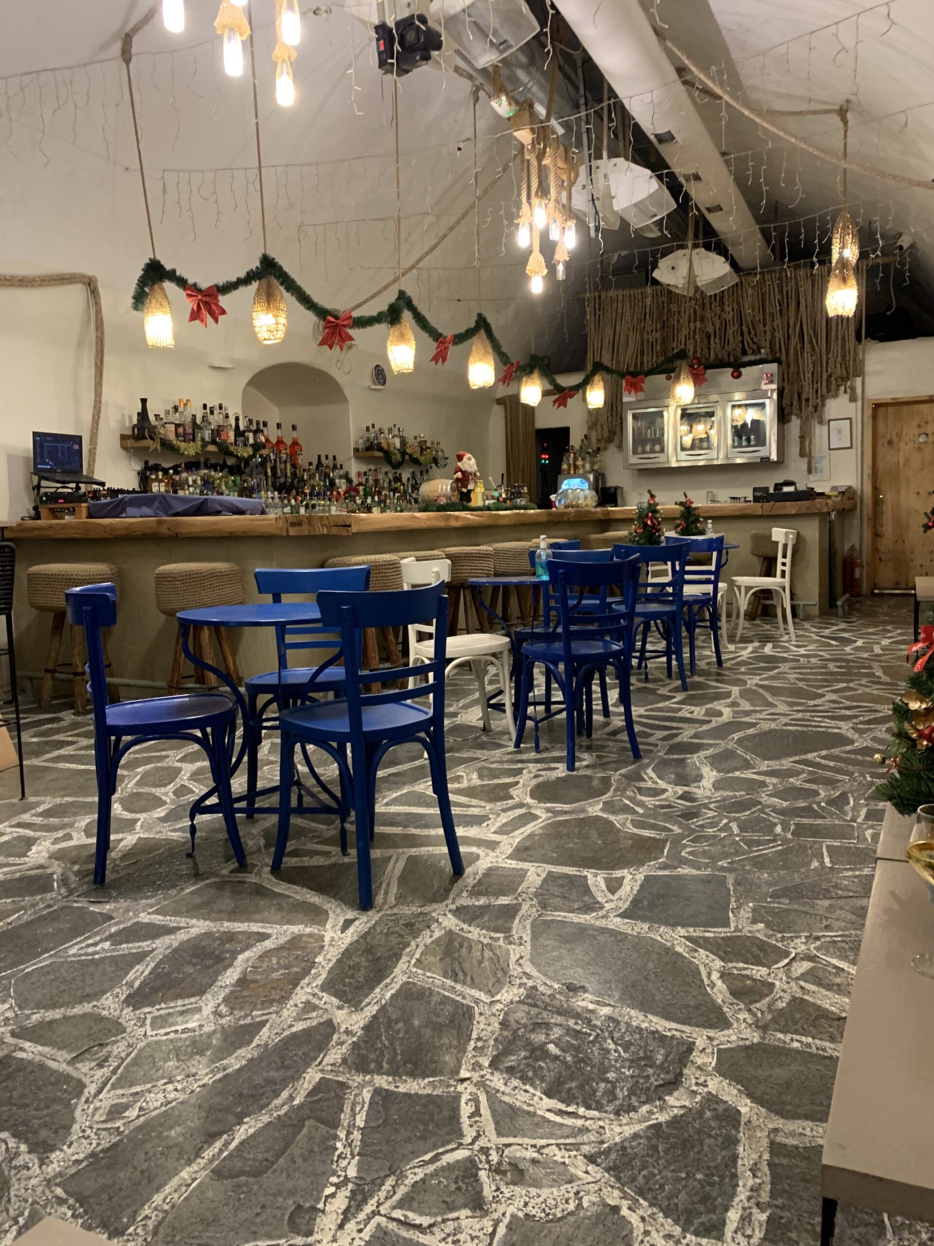 When I walked out of the bakery, my mom waved at us from across the hall and gestured to us to come over. It turns out, my mom and brother found a wine bar! The Stoa Bar Santorini Fira was situated in a cave and decorated with Christmas decorations. Since it was the off season, the menu was limited in the number of wines available. However, we were able to order at least one red wine and one sweet white wine. The drinks were accompanied with Doritos. The owner didn’t mind that we ate the orange cake in the wine bar. The orange cake was delicious. It was a dense cake that was made out of honey and orange. The greek coffee was strong and delicious as well.