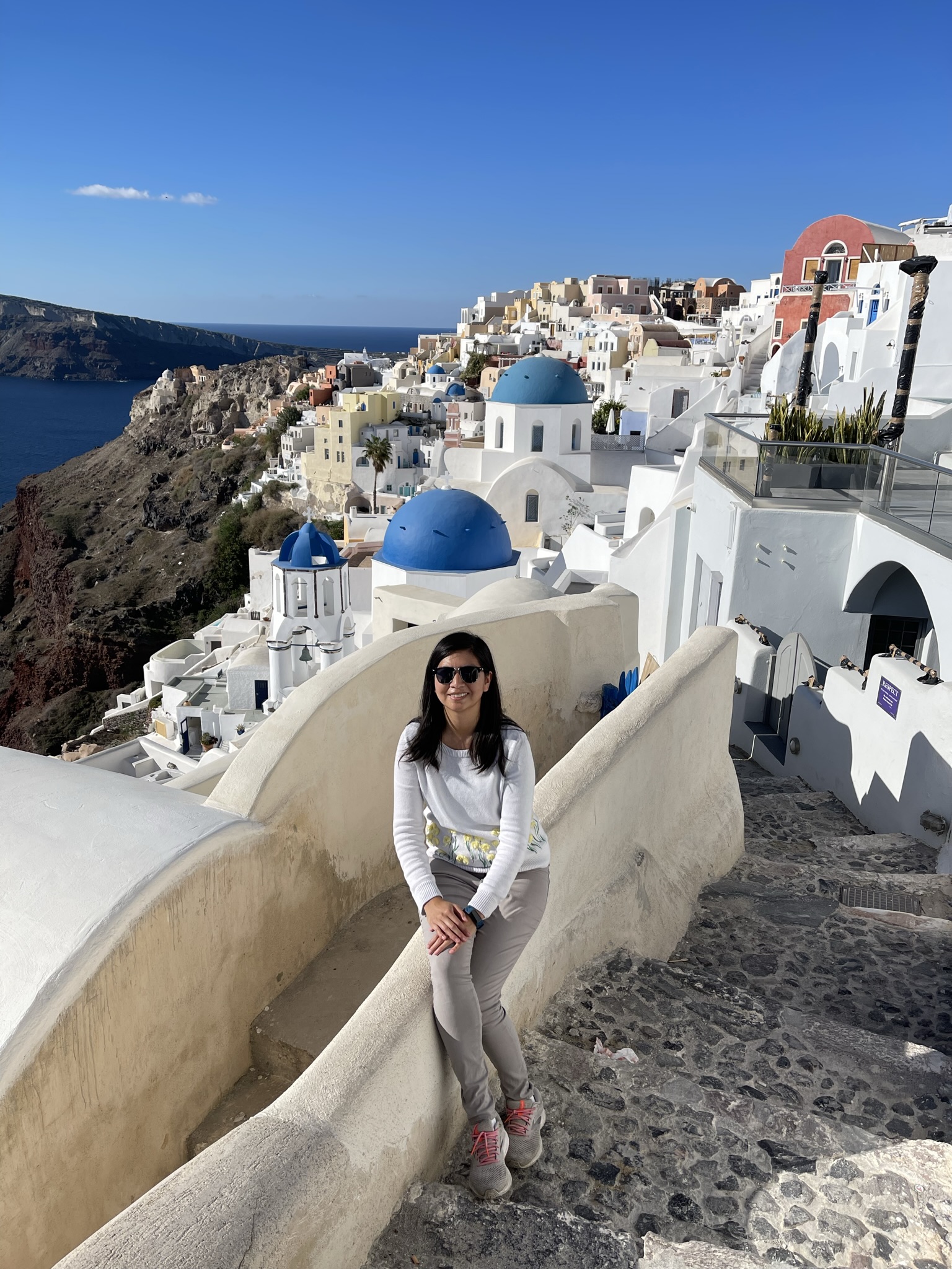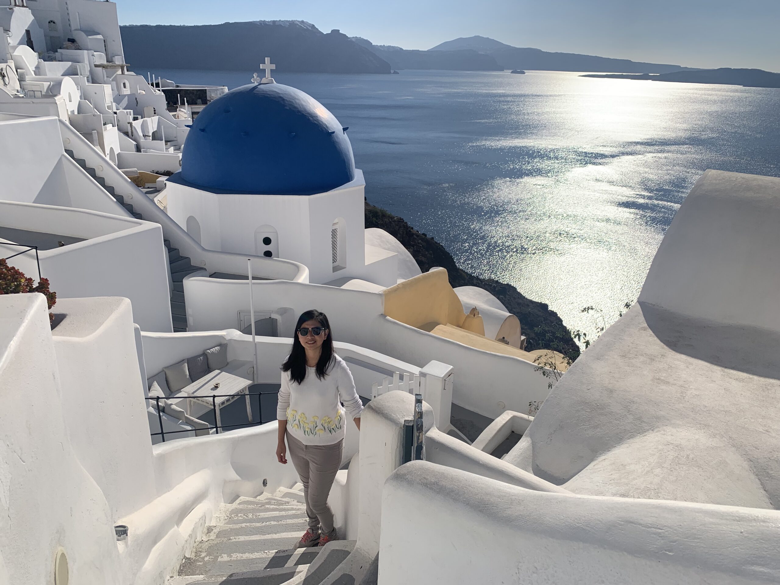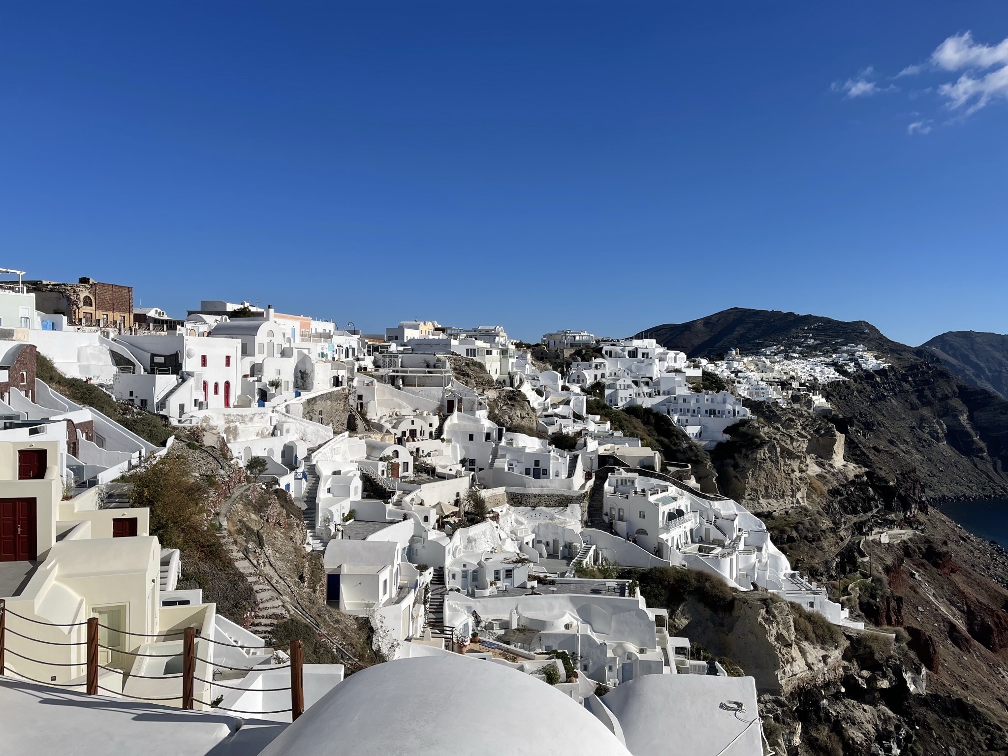 On the 7th day of the 10-day Viking Greek Odyssey Cruise, I arrived in Santorini, Greece. We booked the complimentary shore excursion, Summits & Countryside, where we viewed the famous blue domes in Oia Village and explored the Fira’s vibrant streets.