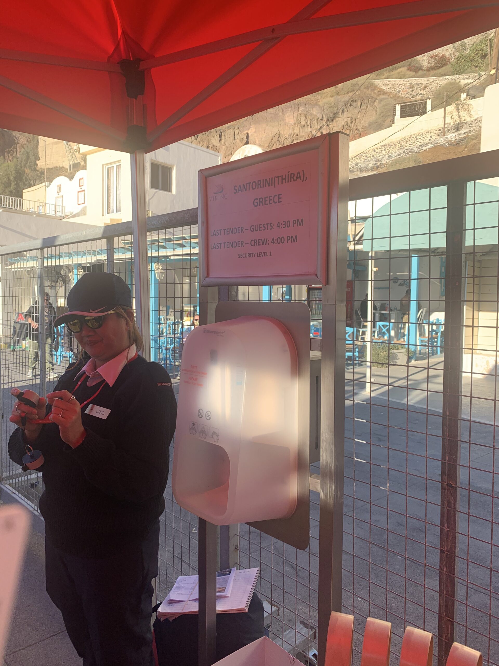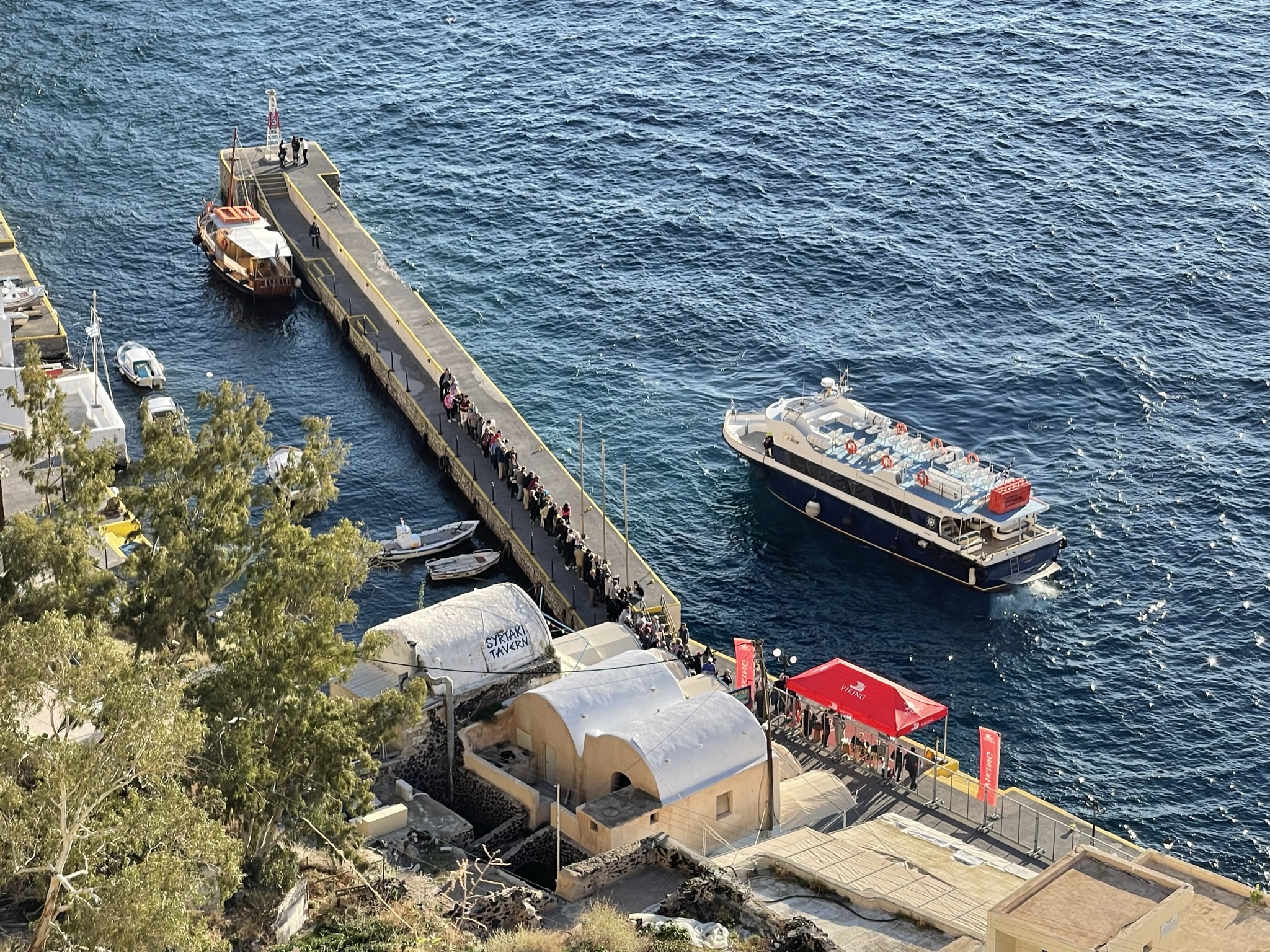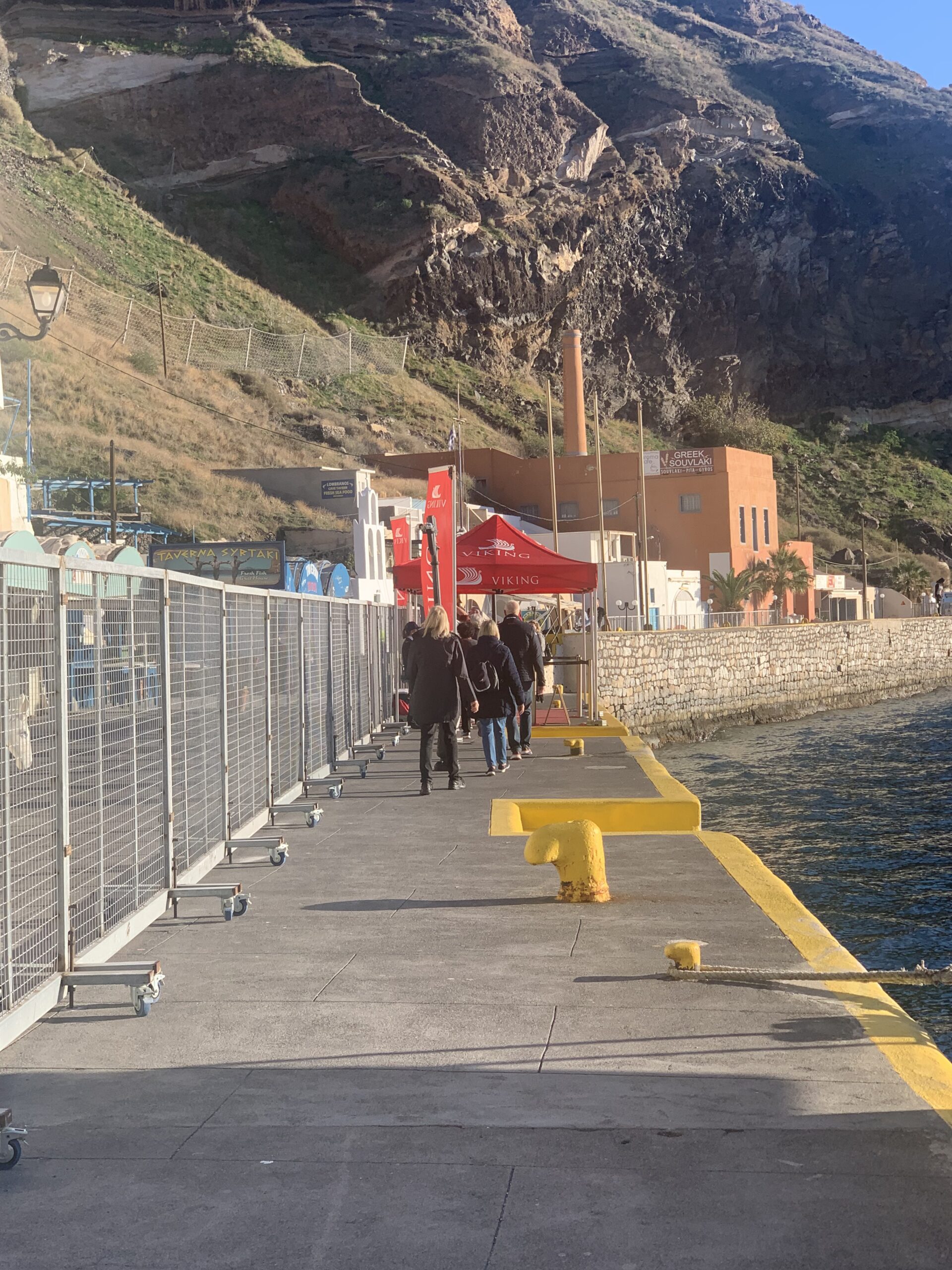 To disembark, we had to take Santorini’s official tender boat to reach the port. It took us roughly 20 minutes on the tender boat to get to the Athinos Ferry Port. After arriving at the port, we proceeded on foot to the bus where we were introduced to our tour guide.