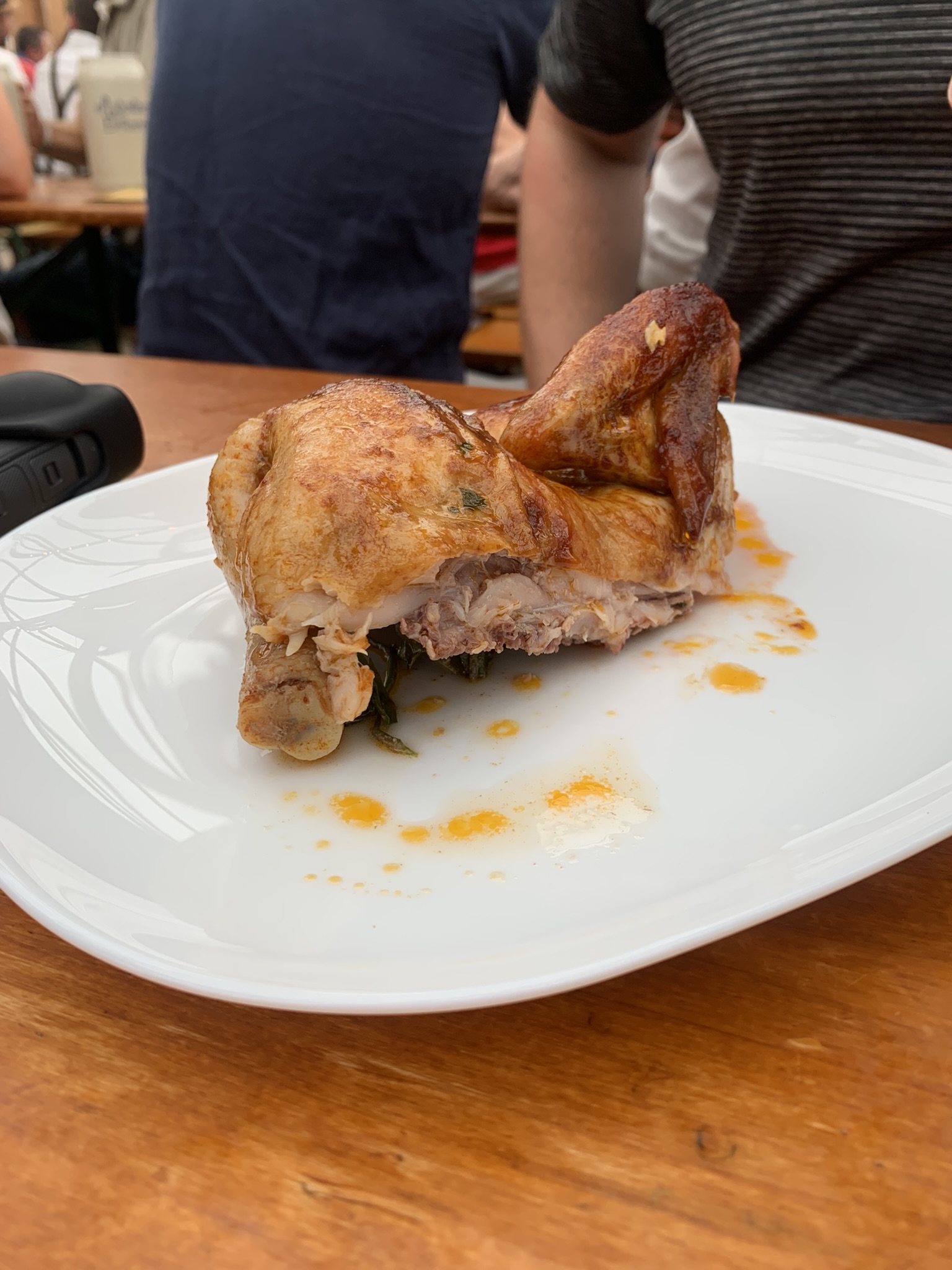 There are 14 large beer tents, each operated by one of Munich’s traditional breweries (e.g., Augustiner, Paulaner, Spaten, Lowenbrau, Hacker-Pschorr, and Hofbrau). These tents offer a variety of refreshments, including Oktoberfest beer (a wheat beer), Radler (beer mixed with lemonade), and non-alcoholic beer, along with traditional Bavarian foods such as half-grilled chicken (my favorite dish!), ox sandwich, or pork knuckles.