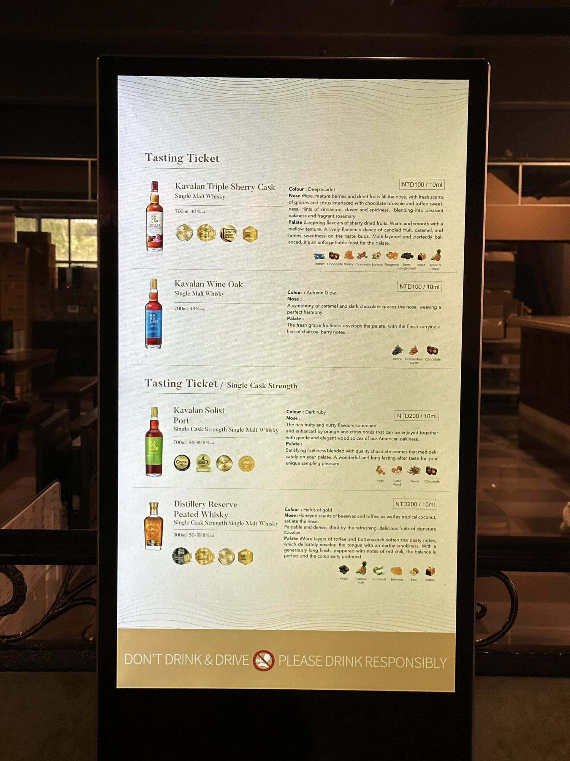 After the tour, you’re welcome to purchase* a tasting flight in the tasting room. Julius and I, being whiskey enthusiasts, decided to sample all four whiskeys (NT $600). However, if you’d prefer a smaller experience, you can opt to order just one to get a taste.
