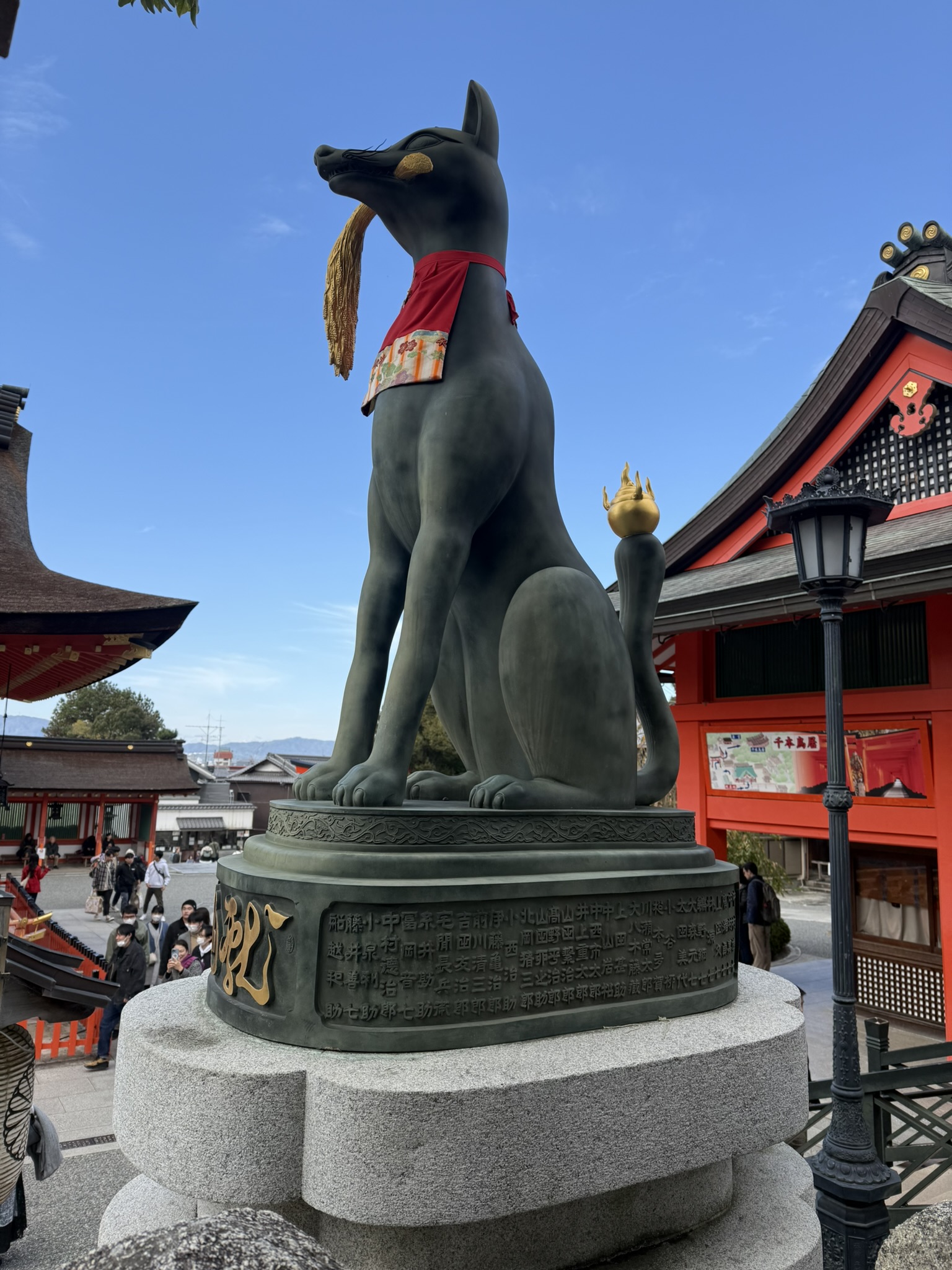 From the metro, head straight to the Fushimi Inari Shrine Tower Gate (large red gate) —walk beneath it and you’ll step directly into the Fushimi Inari Shrine grounds. The main shrine and several vermilion buildings open up ahead; pause to offer a prayer or wander the grounds. Flanking the front of the shrine are two fox statues—messengers of Inari Ōkami—holding a key that symbolizes protection of the rice storehouse (and, by extension, prosperity).