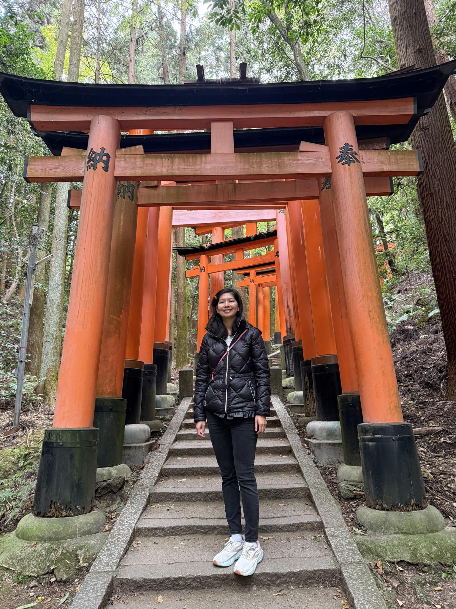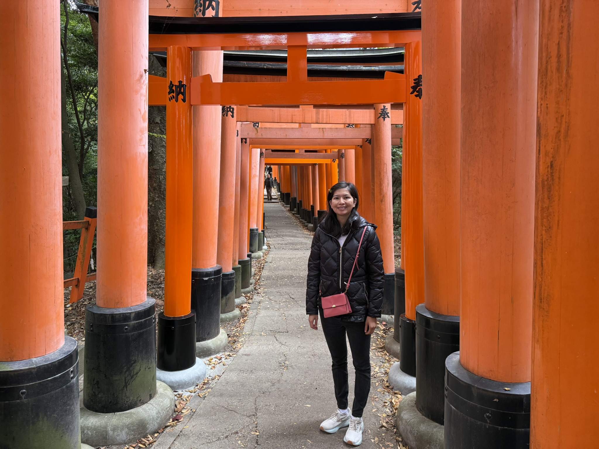 A girl standing in front of torii gates