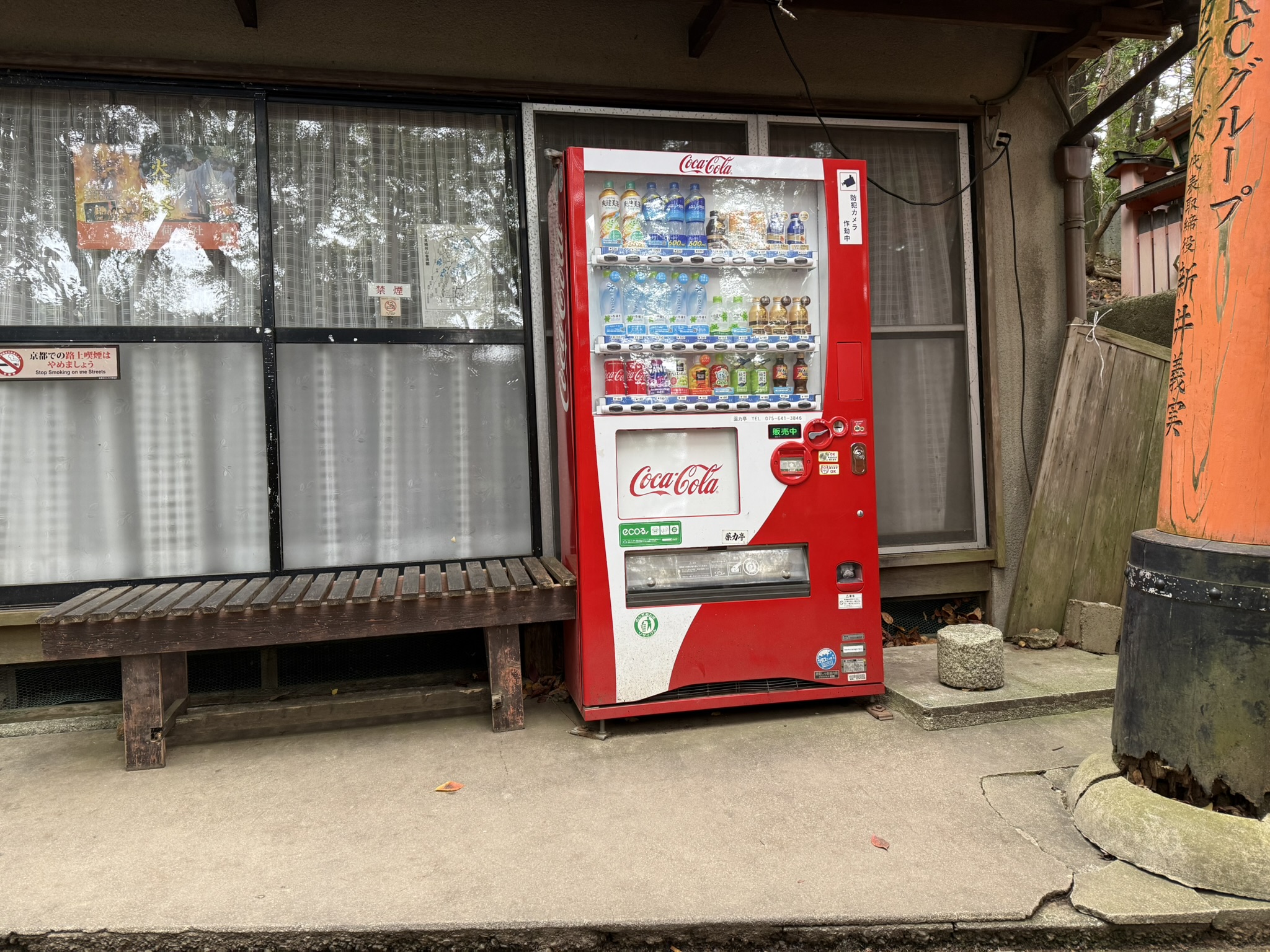 A bench and a vending machine