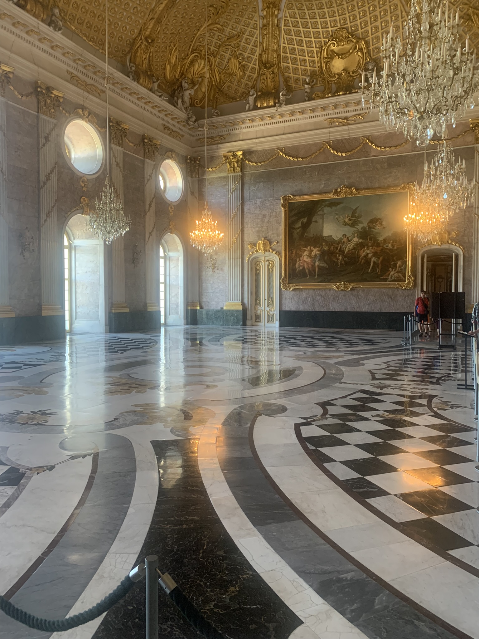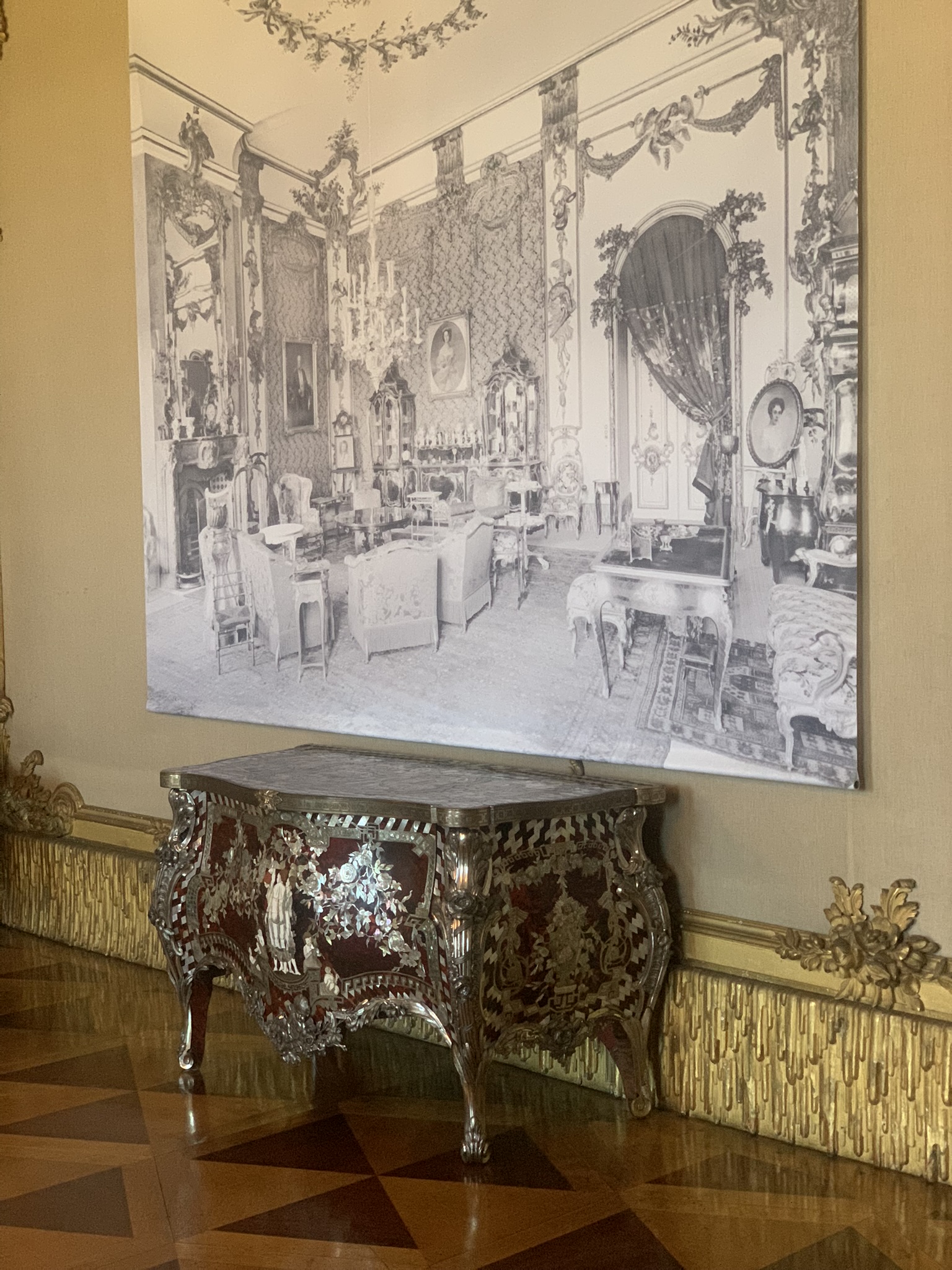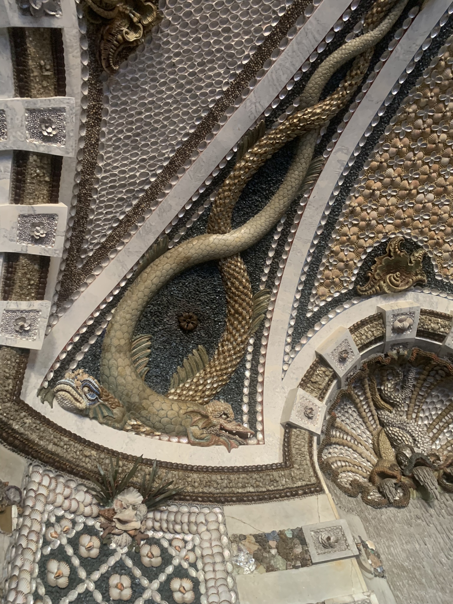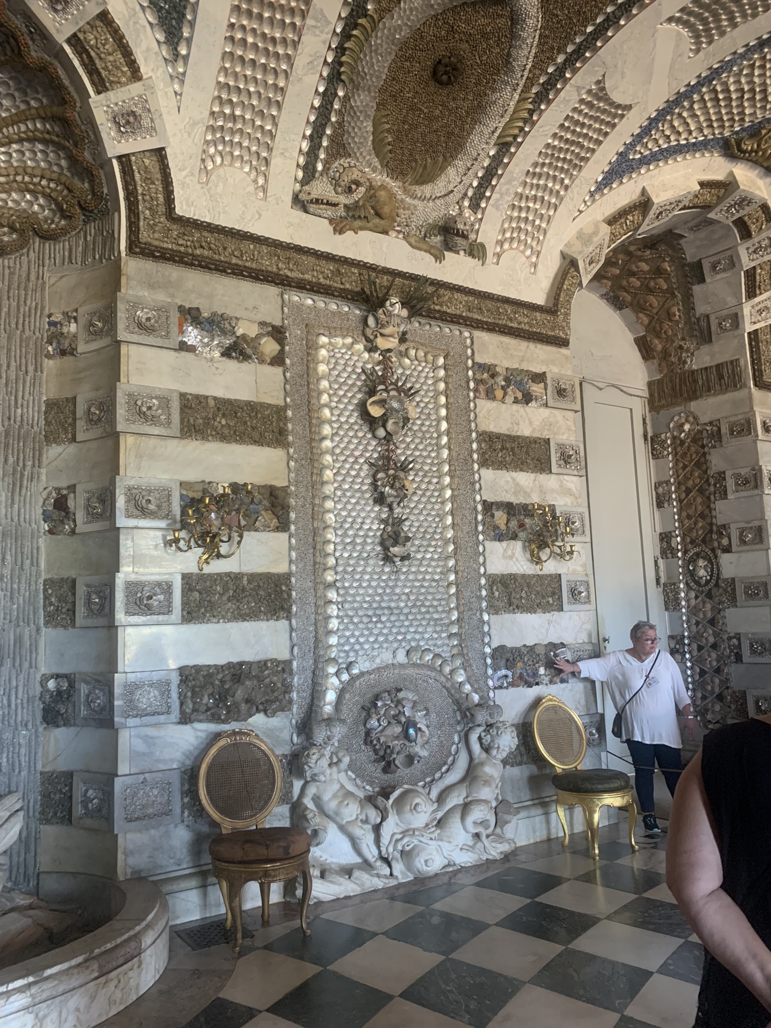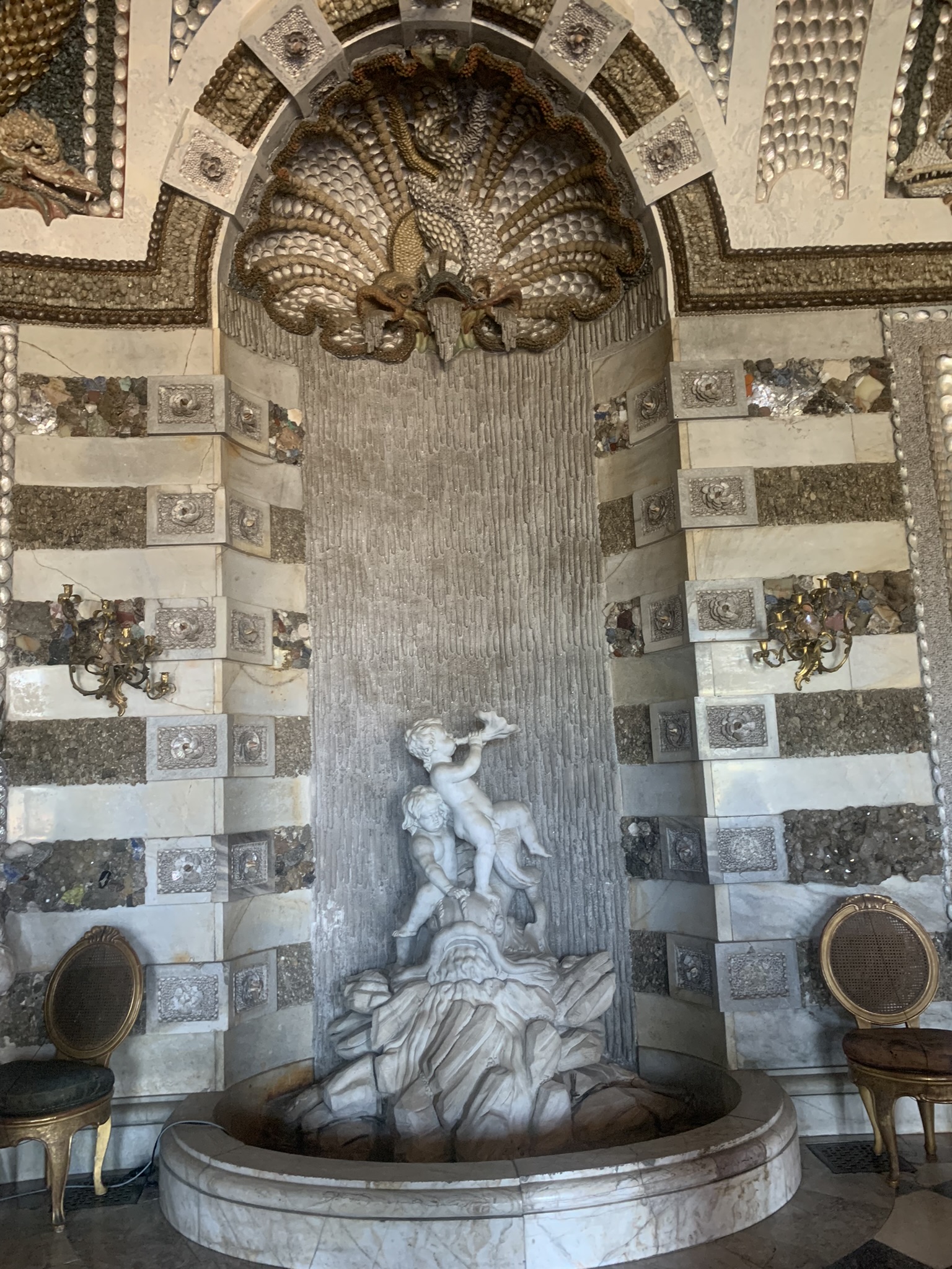 A remarkable example of how indoor spaces can be transformed to evoke the natural world. Its uniqueness lies in the shell and rock work, where the walls are encrusted with shells, stones, marble, quartz, and semi-precious stones. Additionally, the room features numerous sculptures of water nymphs, further enhancing its naturalistic theme. This was my favorite room in the palace due to its innovative indoor architecture.