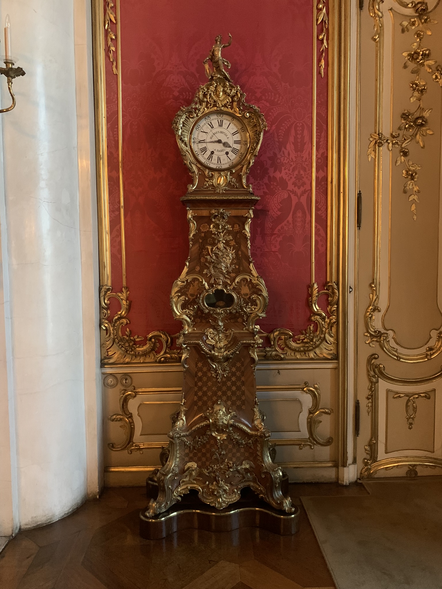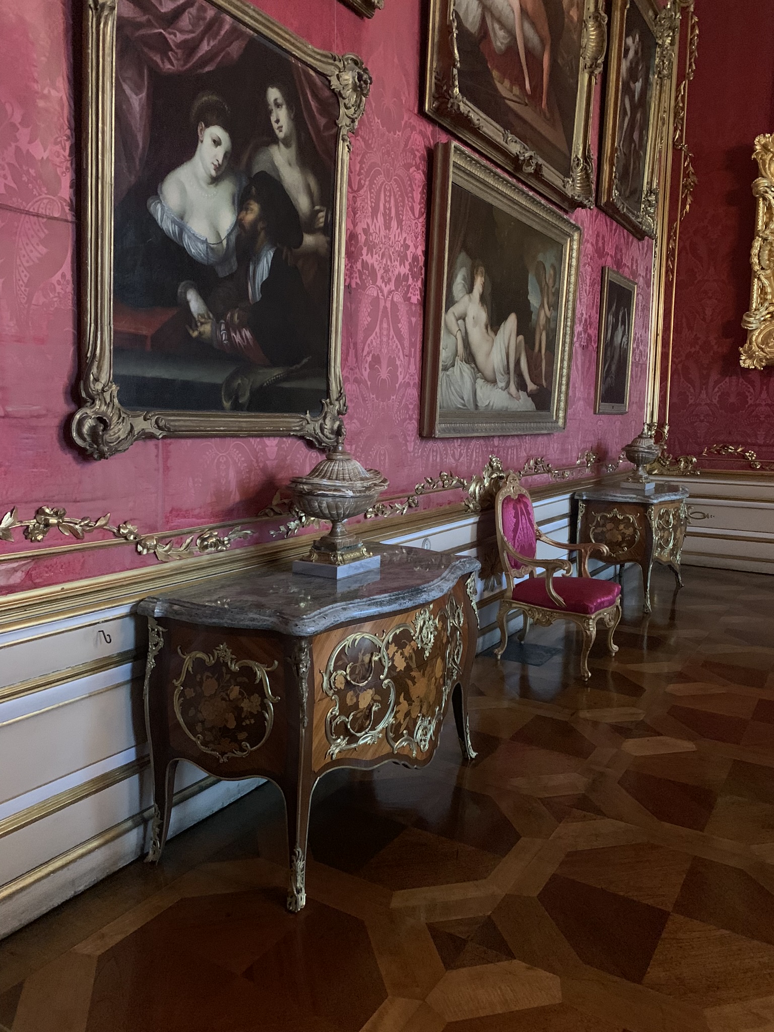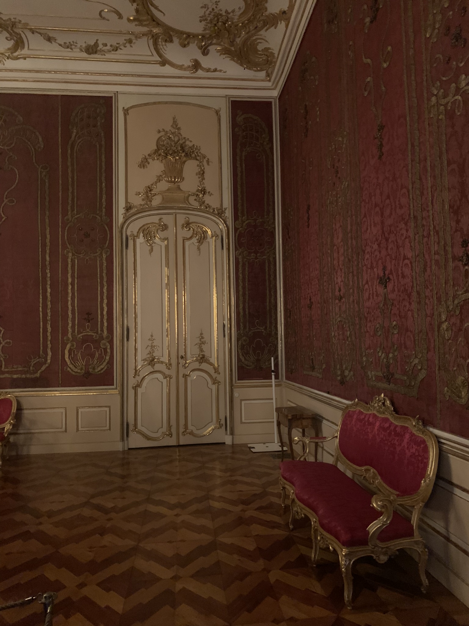 A beautifully decorated chamber that exemplifies the Rococo style. The furniture, with its curved lines, and the chandeliers enhance the room’s opulence. The walls, adorned with red damask fabric, add a sense of warmth and elegance to the space.