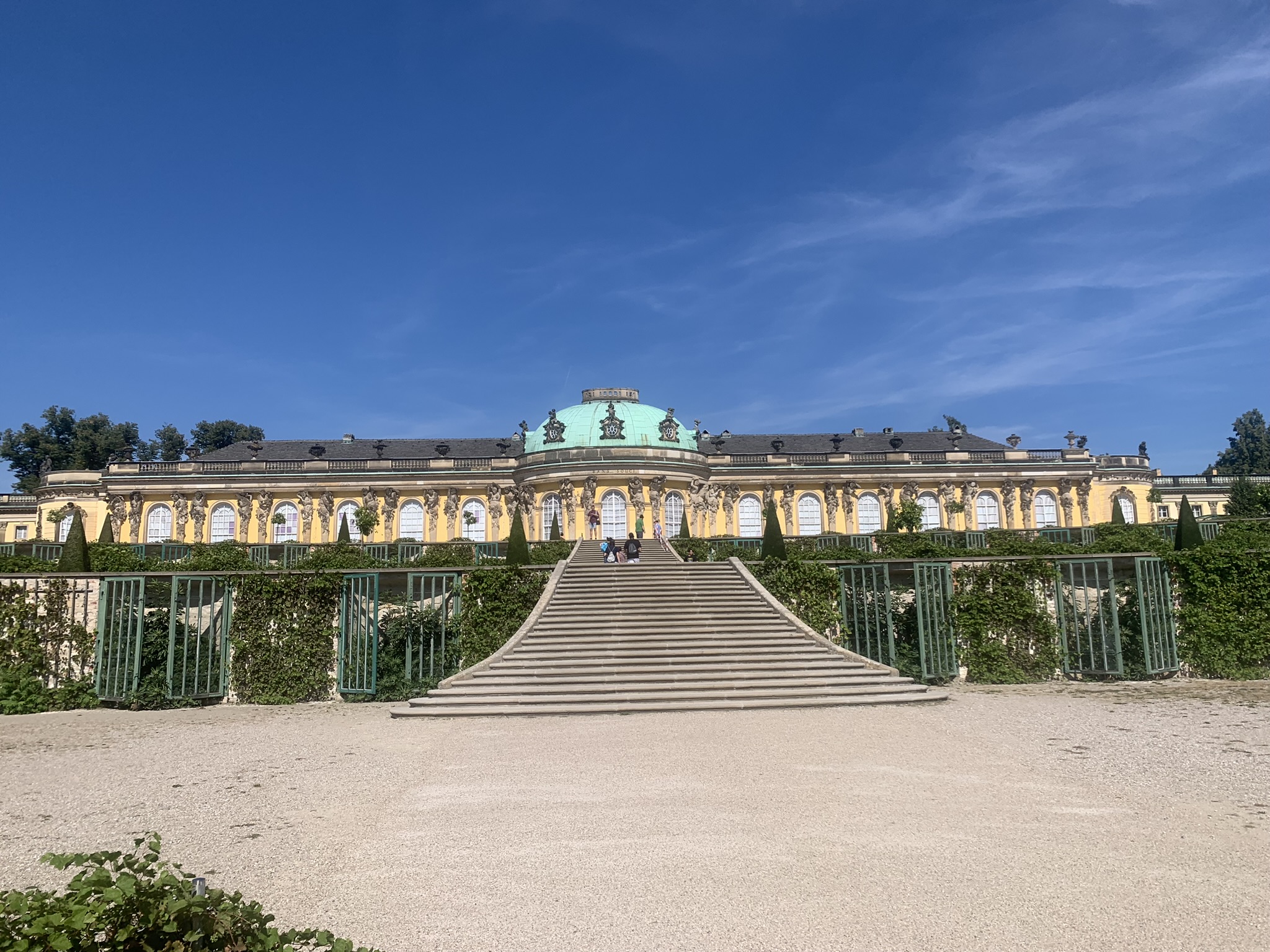 Built between 1745 and 1747 by the architect Georg Wenzeslaus von Knobelsdorff, it is one of the most iconic examples of rococo style.  Its elegant single-story design, adorned with intricate details, seamlessly integrates with the terraced vineyard on which it rests, creating a harmonious blend of architecture and nature. The palace served as a vibrant cultural hub, hosting influential figures such as Voltaire. After Frederick the Great’s death in 1786, Sanssouci remained an important royal residence and ultimately became a lasting symbol of Prussian heritage.
