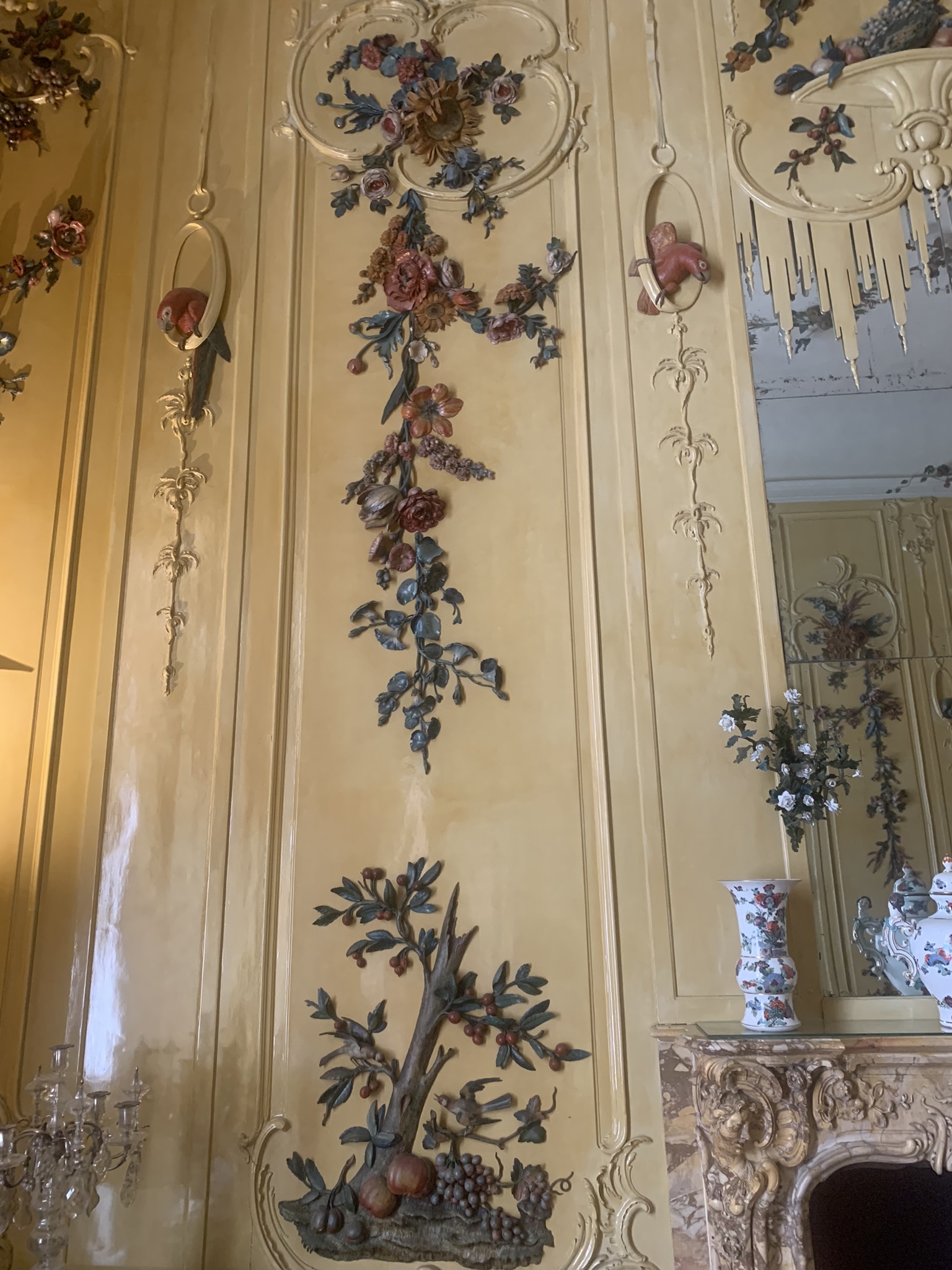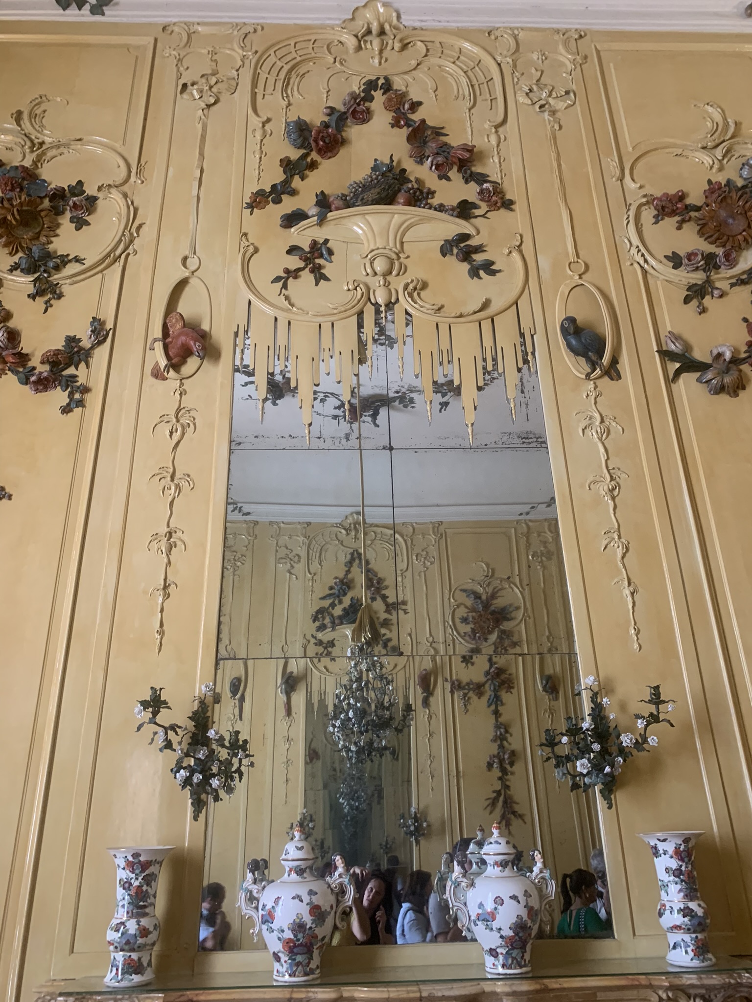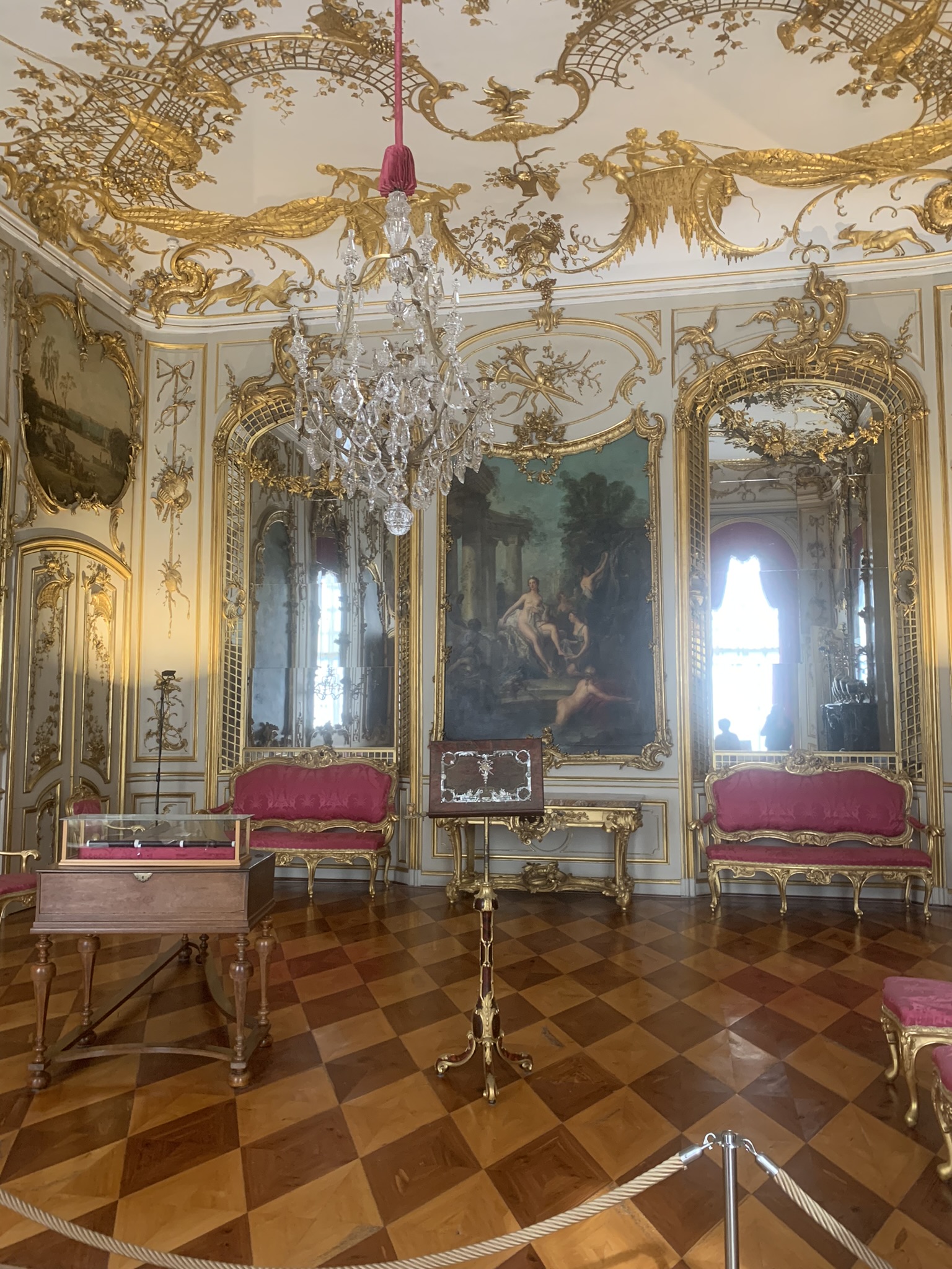 A stunning example of Rococo elegance, designed to reflect Frederick the Great’s love for nature and art. Its uniqueness lies in the pastel color palette, ornate gilded frames around the mirrors, and floral arrangements on the ceiling. This was my favorite room in the palace because it was decorated with natural elements of flowers, birds, and monkey’s.