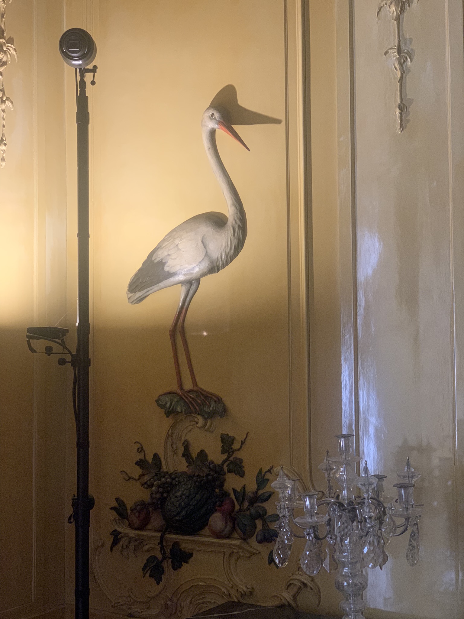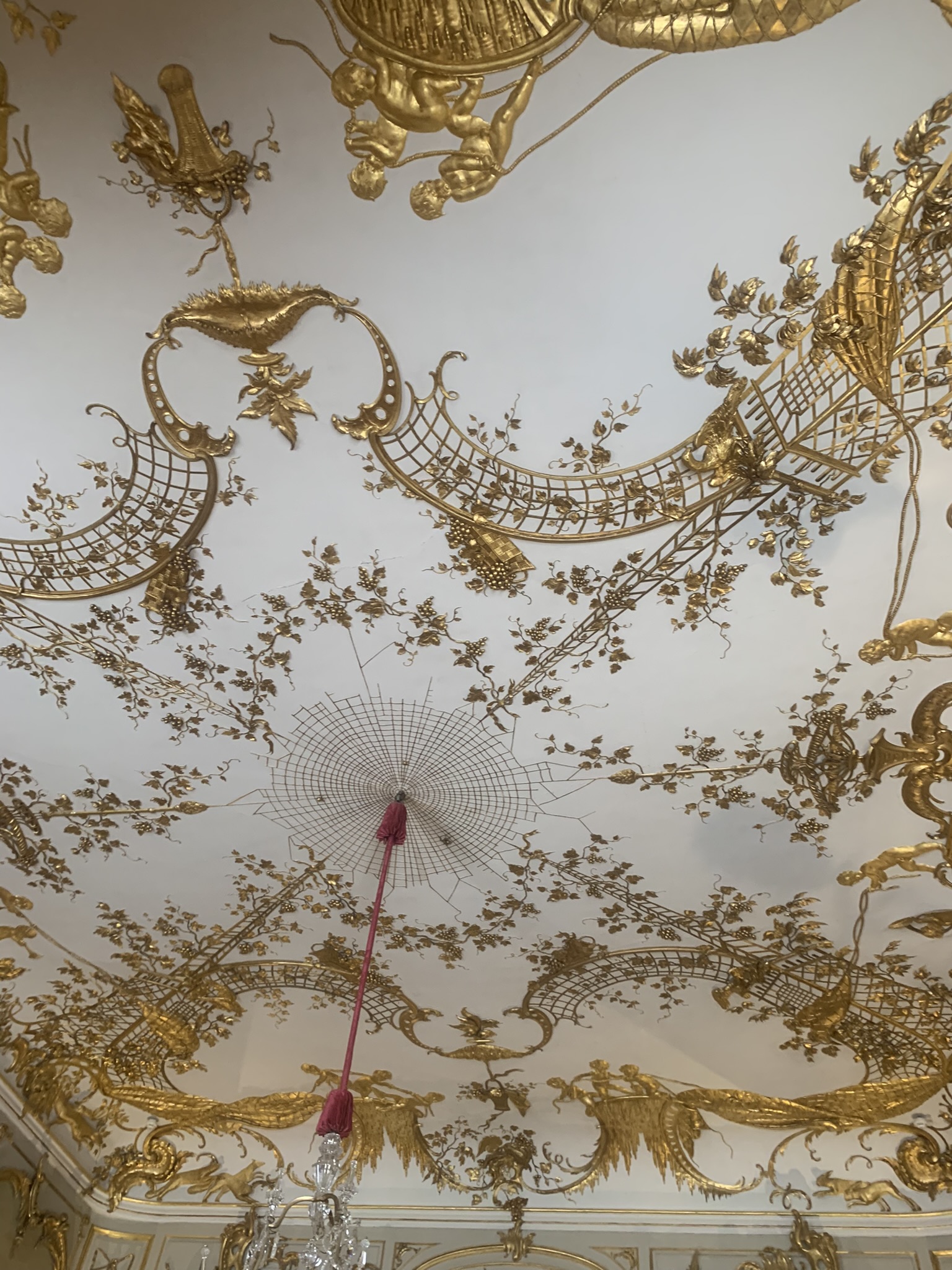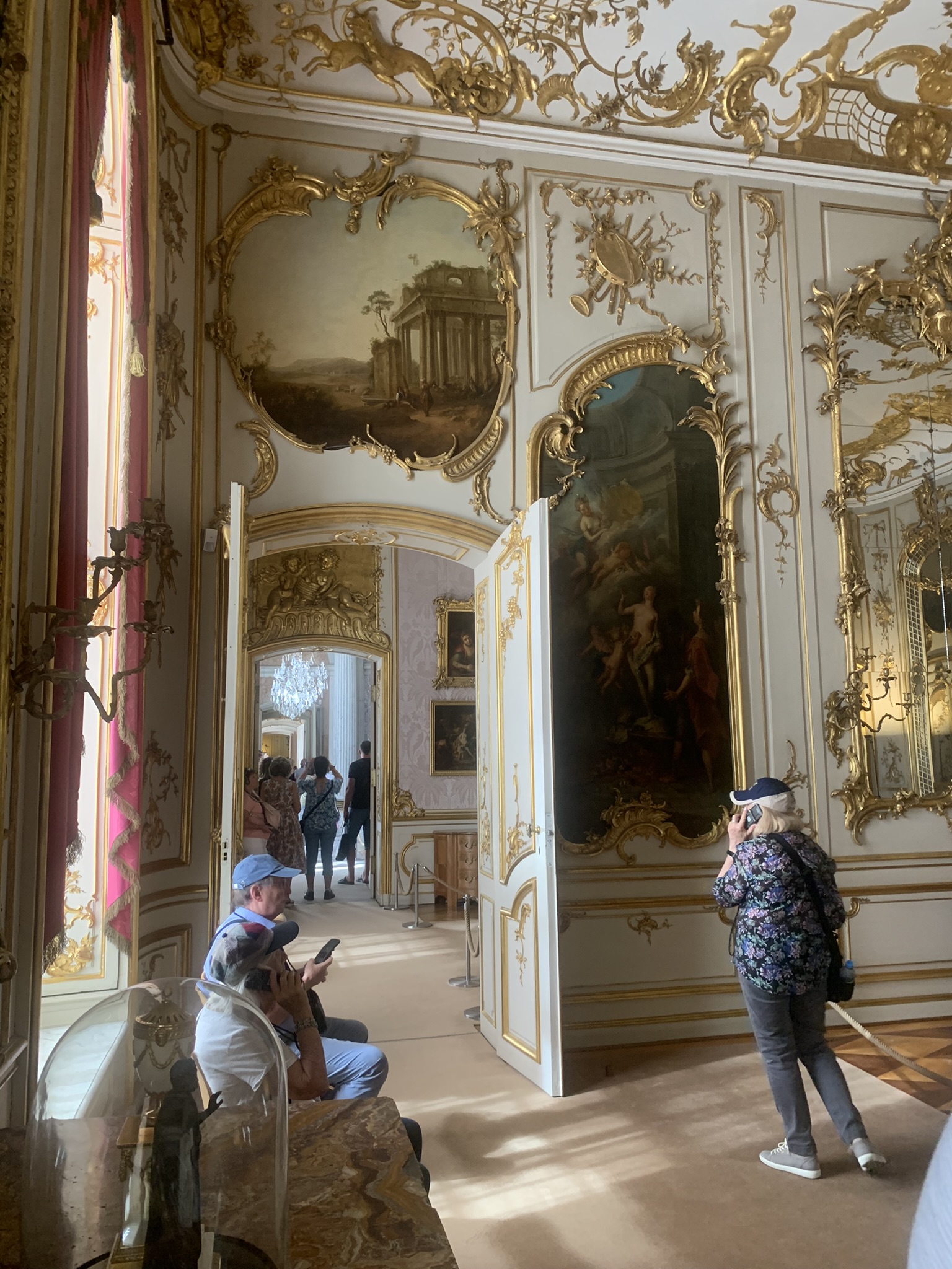 A stunning example of Rococo elegance, designed to reflect Frederick the Great’s love for nature and art. Its uniqueness lies in the pastel color palette, ornate gilded frames around the mirrors, and floral arrangements on the ceiling. This was my favorite room in the palace because it was decorated with natural elements of flowers, birds, and monkey’s.