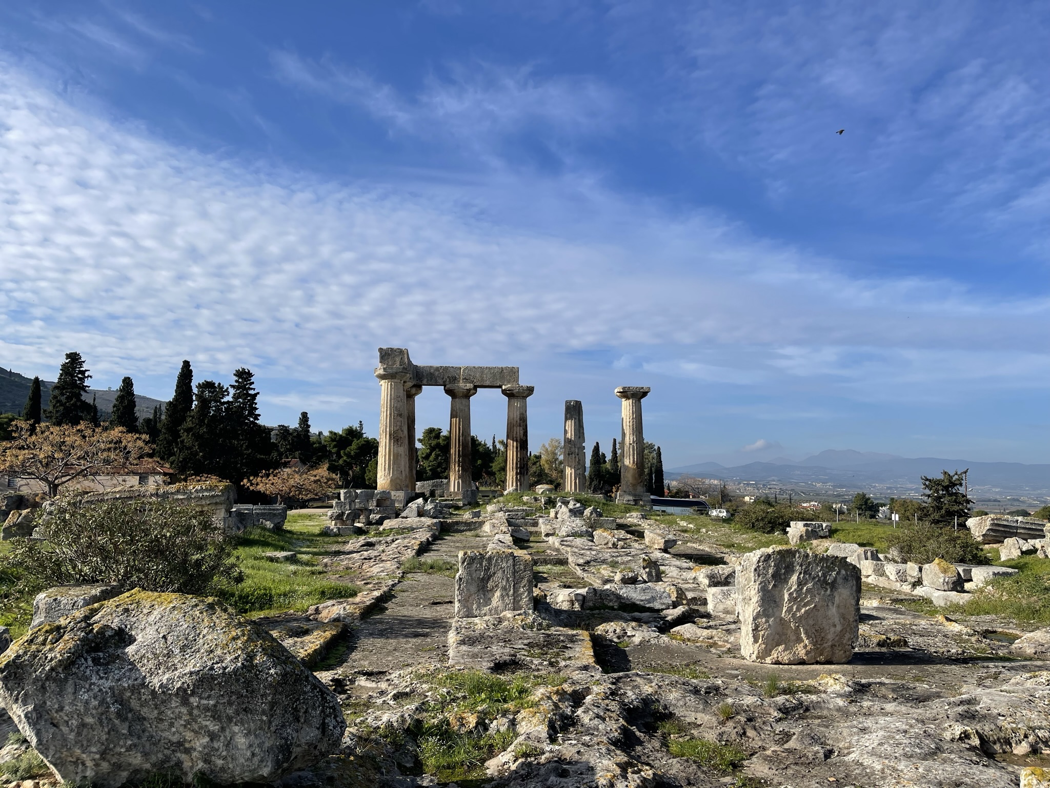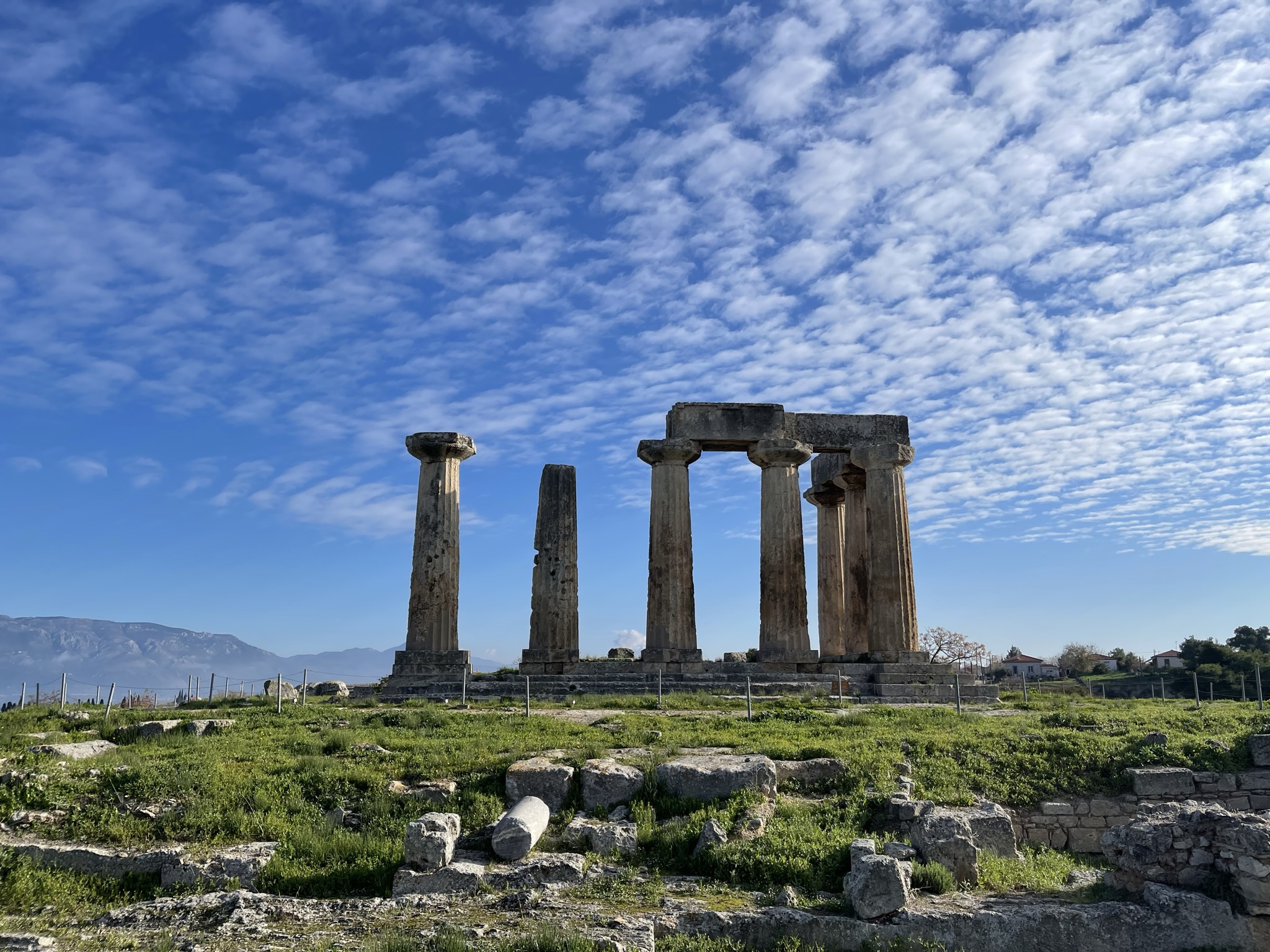 The Temple of Apollo is one of the most significant and striking remnants of this once-flourishing ancient city. Dedicated to Apollo, the god of music, harmony, and light, the temple served as a central place of worship and played a significant role in the religious and social life of Corinth. It was built in the middle of the 6th century B.C. The temple is in Doric order and originally consisted of 38 columns made of monolithic limestone, but only 7 columns remain standing today.