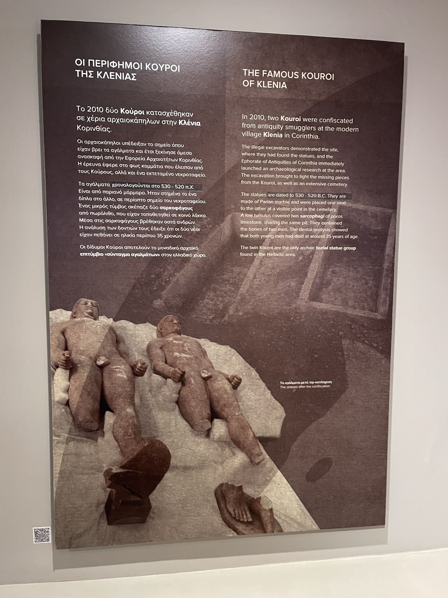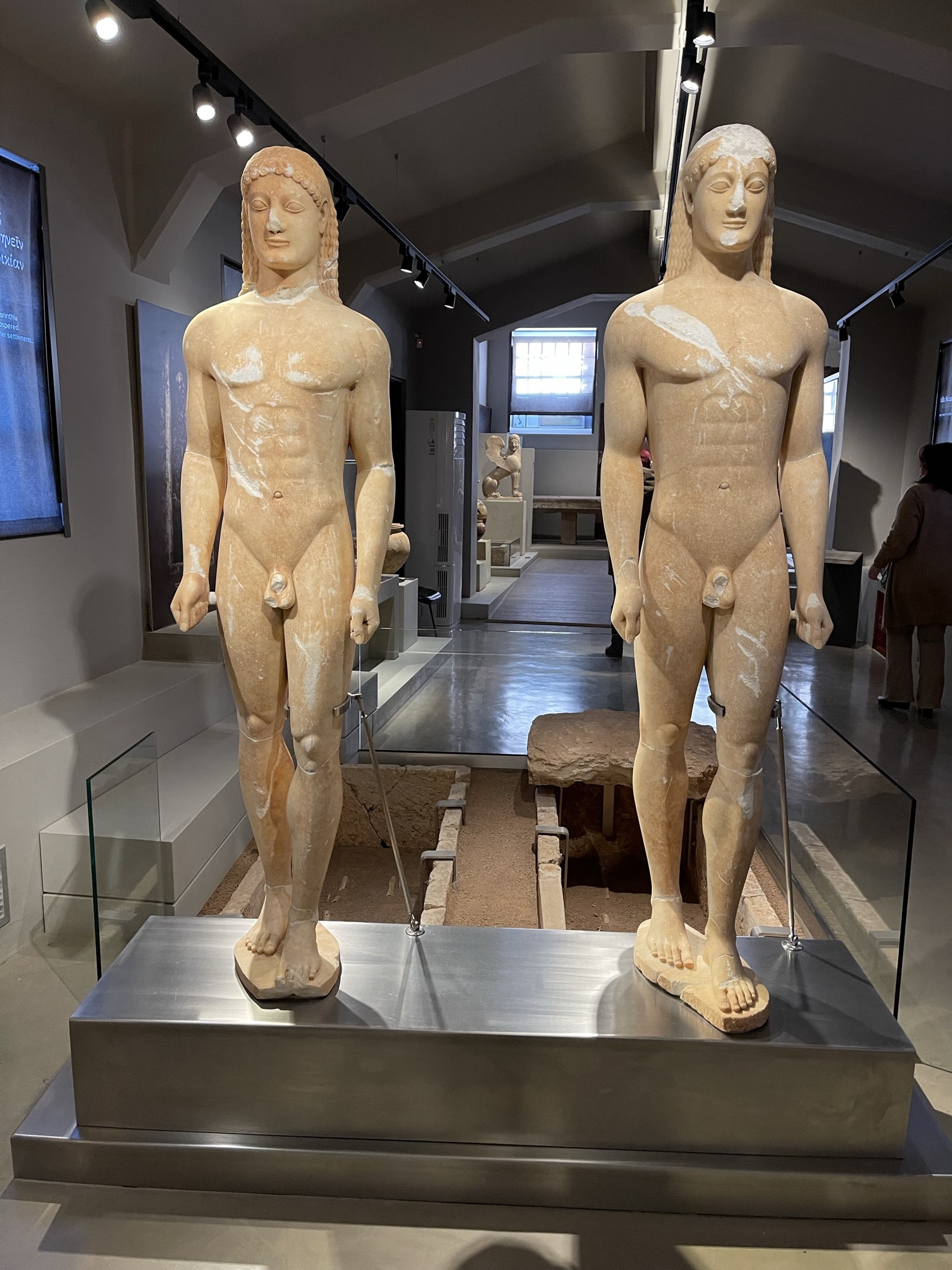 The twin Kouroi statues are dated to 530 – 520 B.C and are the only archaic burial statue group found in the Helladic area. They are made of Parian marble and were placed next to the other at a visible point in the cemetery. The dental analysis showed that both young men had died at around 3 years of age.