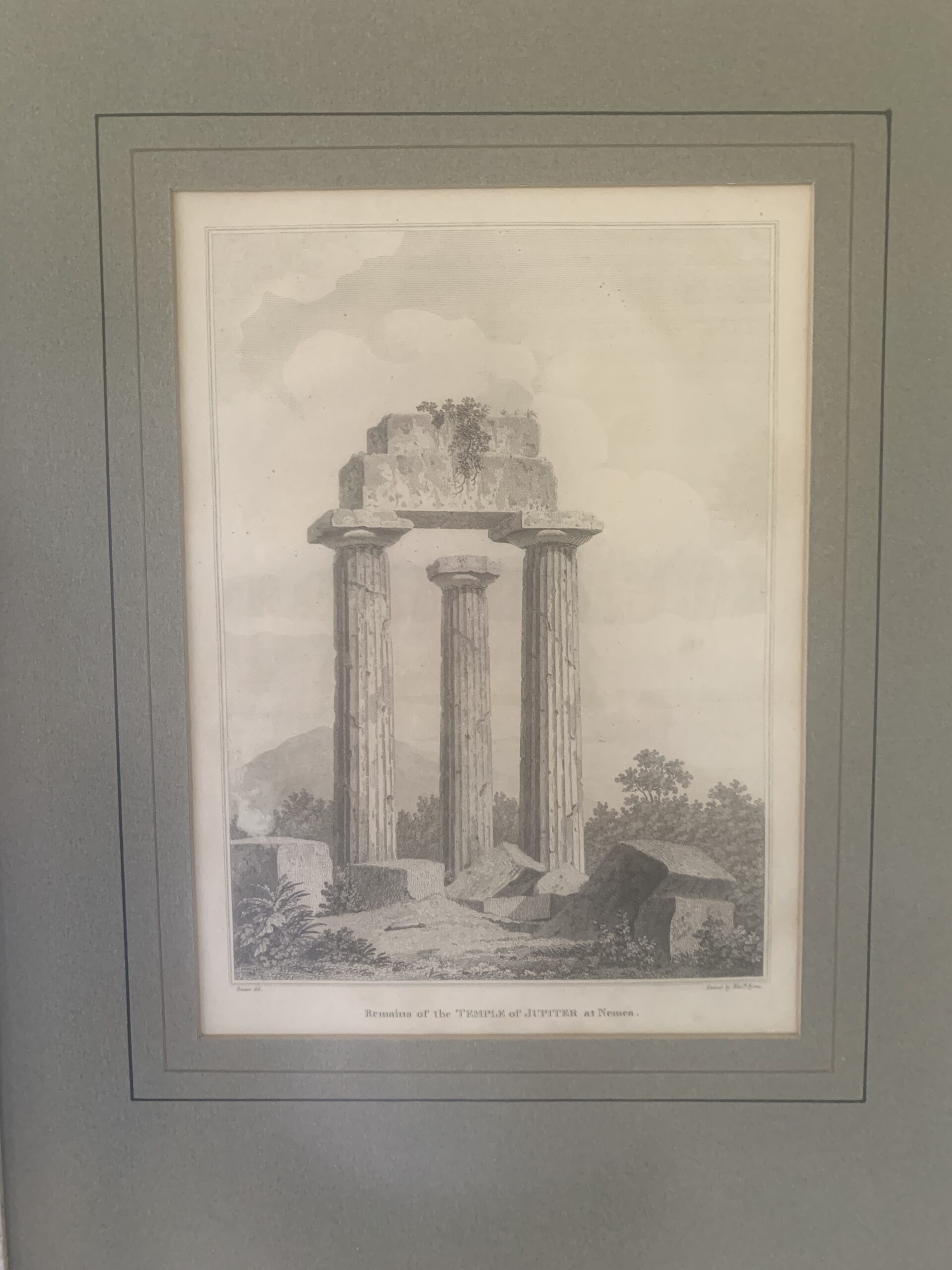 When you enter the museum, you will encounter various portraits and illustrations showcasing the ruins of ancient temples, such as the Temple of the Nemean Zeus. The ruins feature three Doric columns without bases: two of these columns support an entablature while the third holds up just its capital. In the background of the illustration are the inhabitants homes, which are called huts.