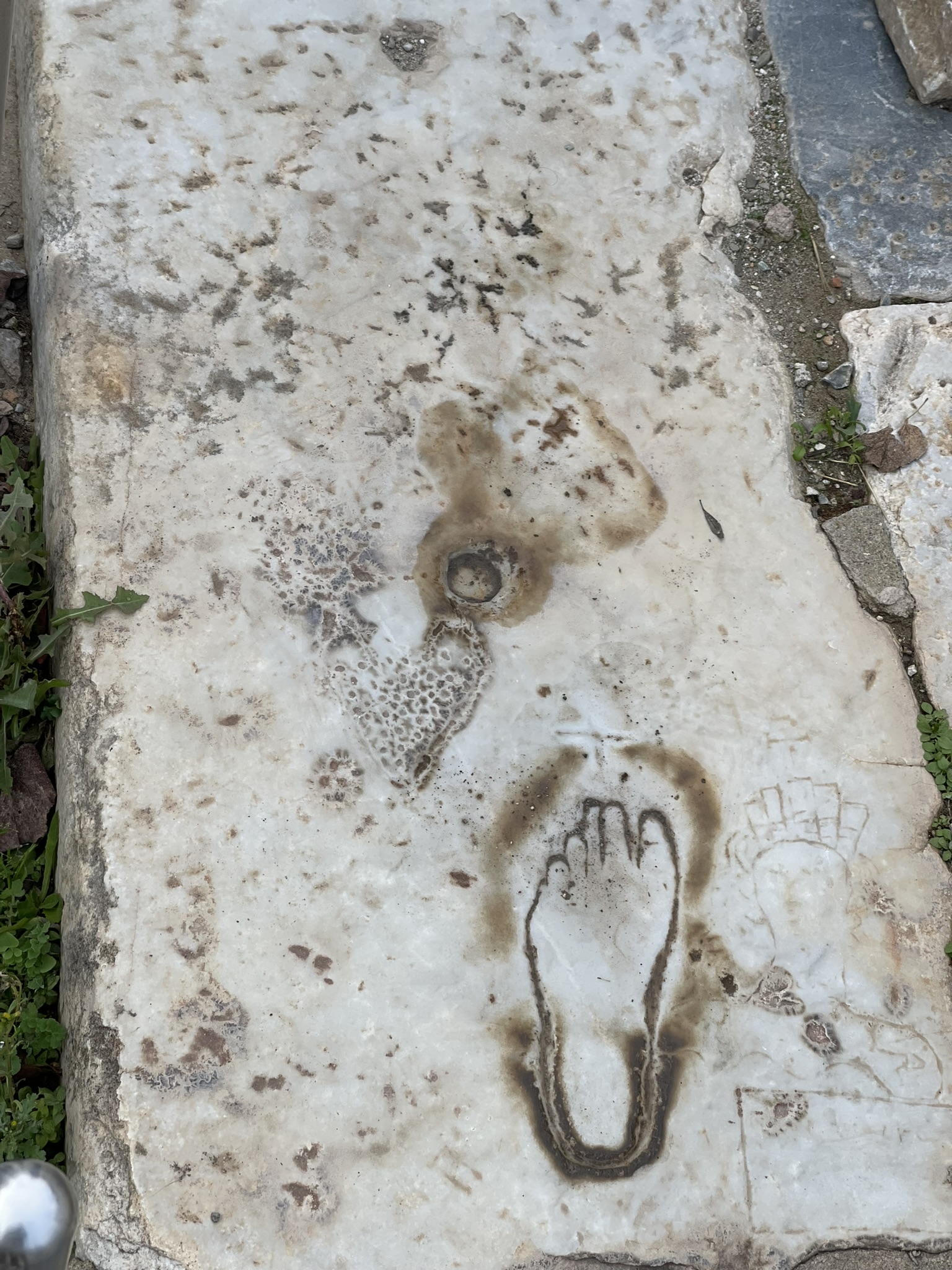 On our fifth stop, I walked on Marble Street, which connects the Celsus Library to the Great Theater. On the marble road, I saw stone carvings of a heart, bird, princess, and left foot that were believed to be an advertisement for the Brothel. The idea is that the footprint shows where one should turn at that point; the woman’s head symbolizes the women waiting in the Brothel, while the heart shows that the women are eager for love. It was interpreted to mean that if you wished to make love and fly like a bird with a beautiful girl, then you should head left to the Brothel.
