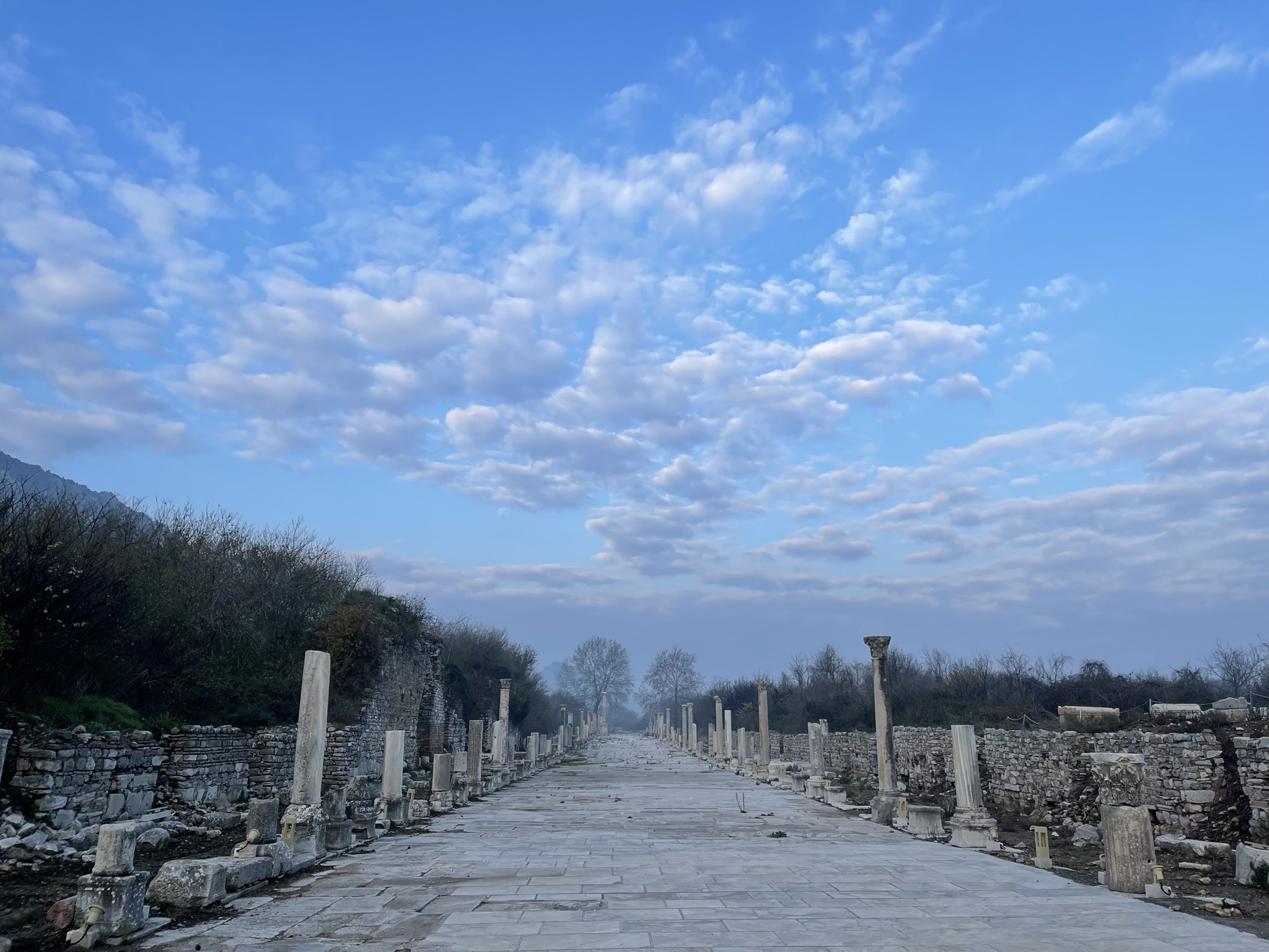 The bus driver dropped me off in a parking lot. I walked ahead and saw there were gift shops selling souvenirs. Then, I walked through a gate to enter the Ephesus Archaeological Site. Upon entering, there was a beautiful lining of trees along a cobblestone road. On the left-hand side, I could see the Great Theater.