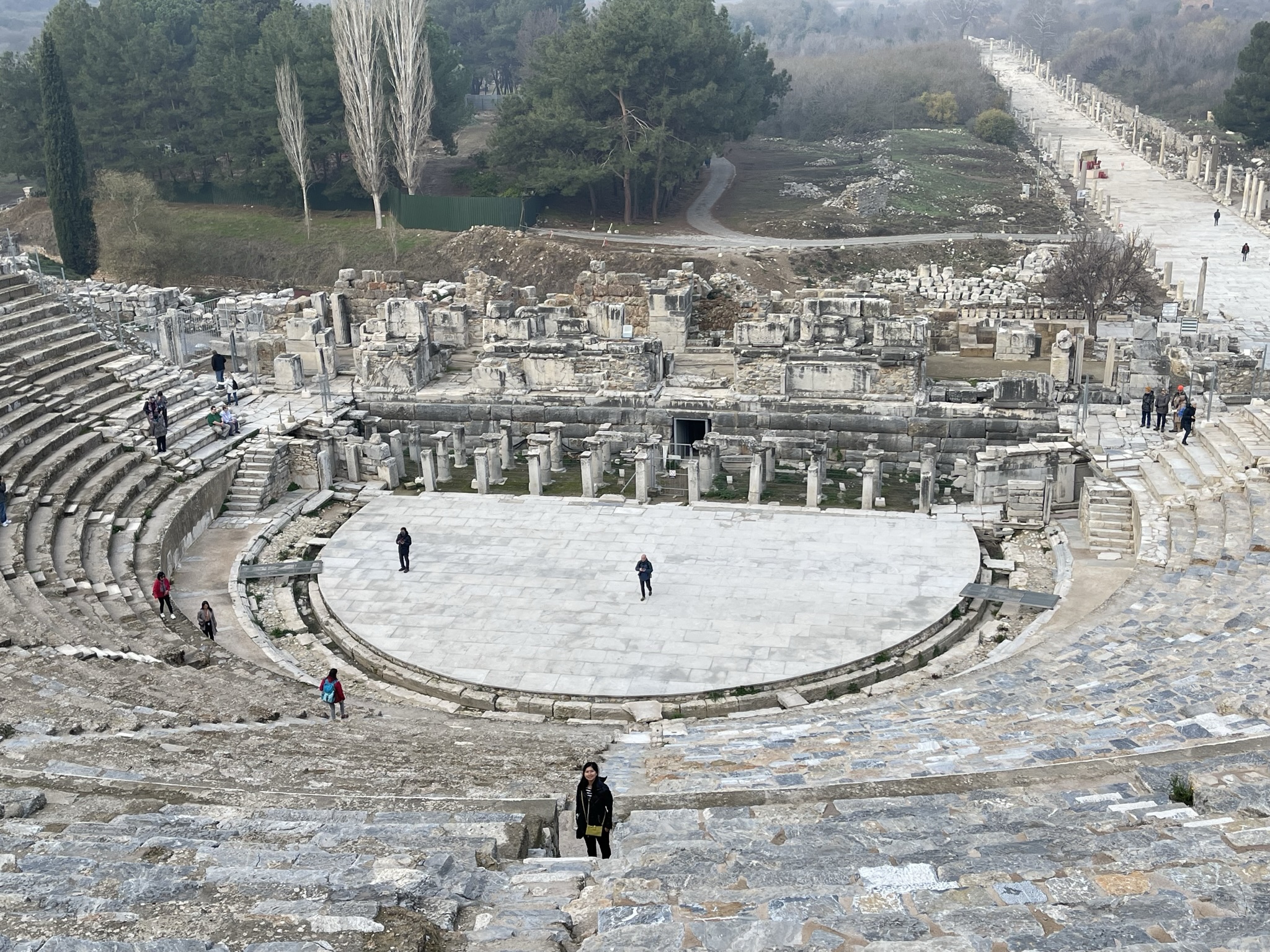 Our last stop was the Great Theater, which is a magnificent theater made of marble that could accommodate up to 25,000 spectators. The size of the theater symbolized Ephesus’s prominence and wealth, reflecting the city’s influential status as cultural and political hub in the ancient world. The theater served as a venue for various forms of entertainment, including theatrical performances, social gatherings, gladiatorial contests, and political meetings.
