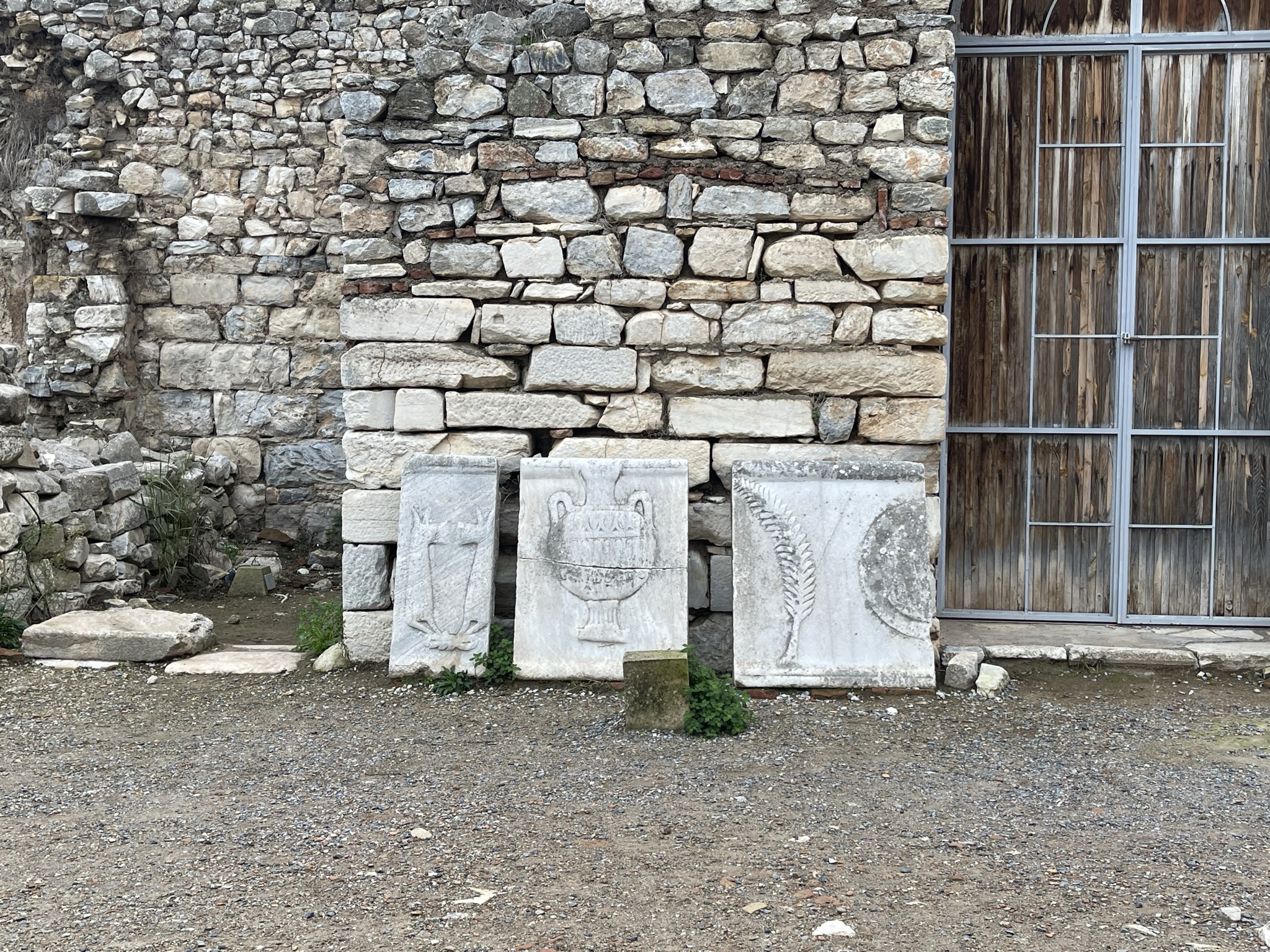 On our second stop, I saw the ruins of the Tetragonos Agora, translated to Commercial marketplace. The columns and partial reconstruction of the stone walls depict where the shops were located. The stores were two stories, the first floor was where the merchants would sell the food and the second floor was used for storage.