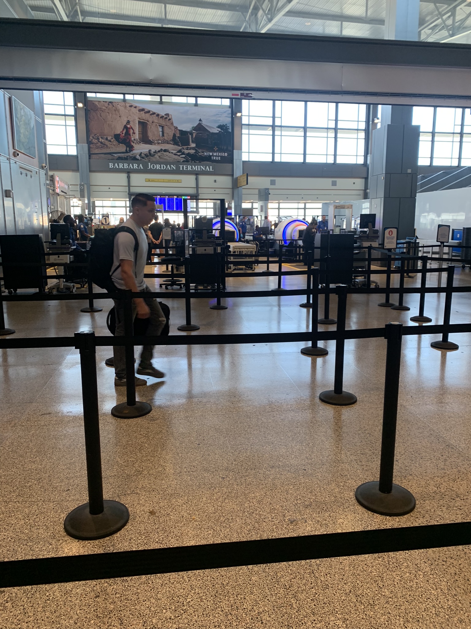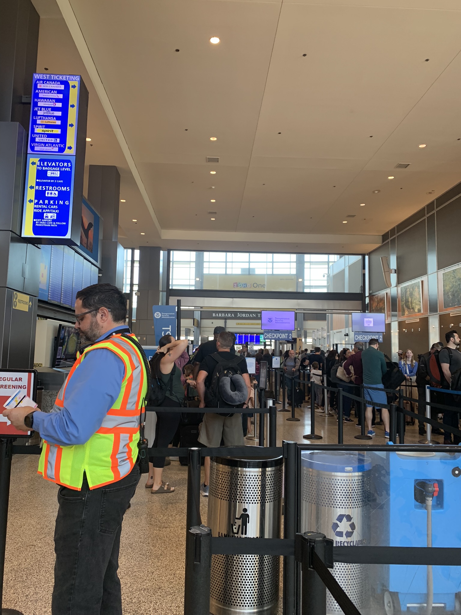 We arrived at the Austin-Bergstrom International Airport two hours early so we could have enough time to buy breakfast before our 10am flight. When we arrived, we were surprised by the long lines at TSA PreCheck and CLEAR at checkpoint 3. A worker told us to go to checkpoint 1, which was on the other side of the airport for a shorter line. I ended up going through Checkpoint 2E, which had no line. It took me less than 5 minutes to get through security. The workers told me that there was a big line just minutes before and that I just missed all the fun.