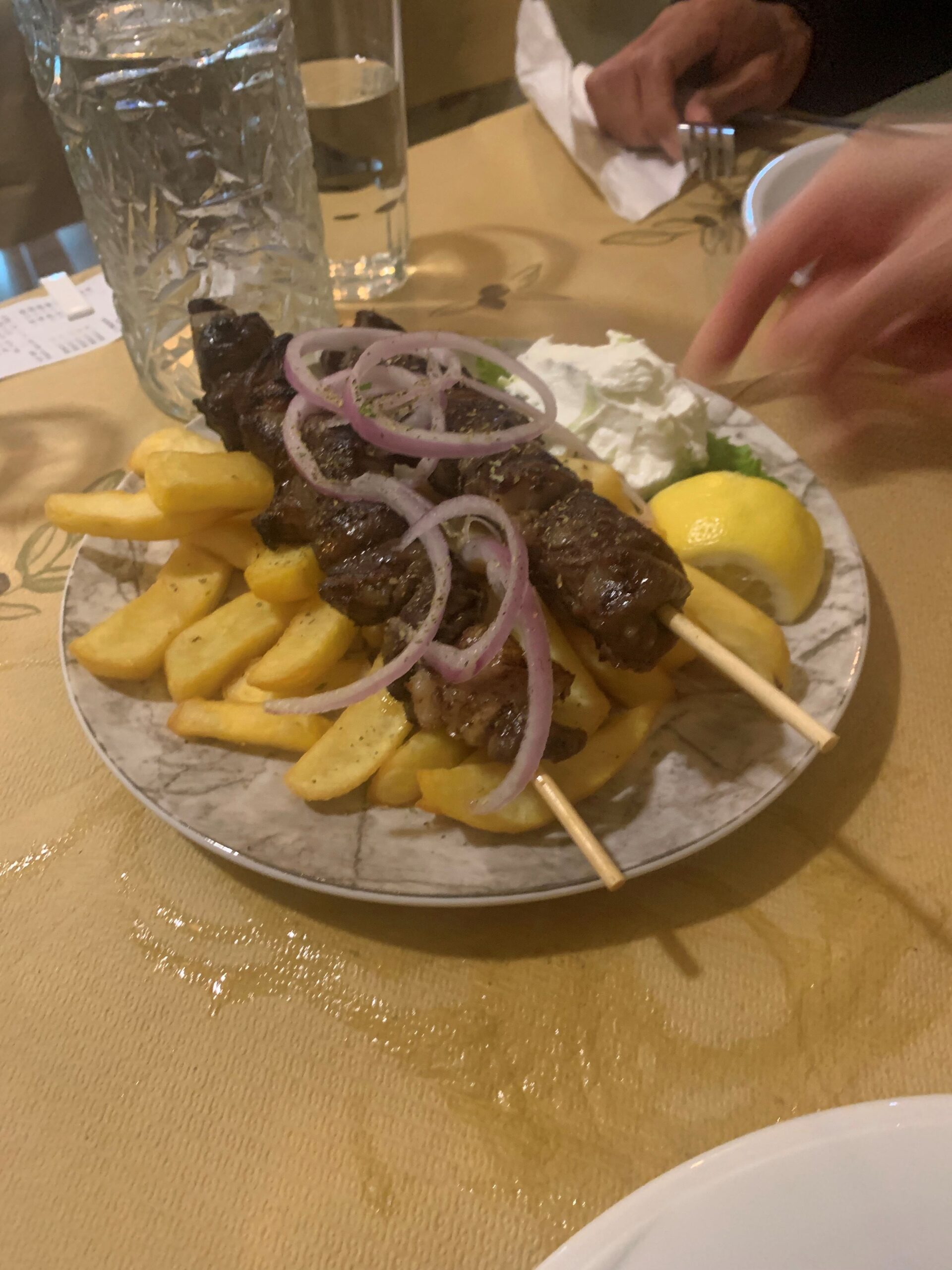 Lamb Souvlaki served on top of french fries, lemon wedges and cream