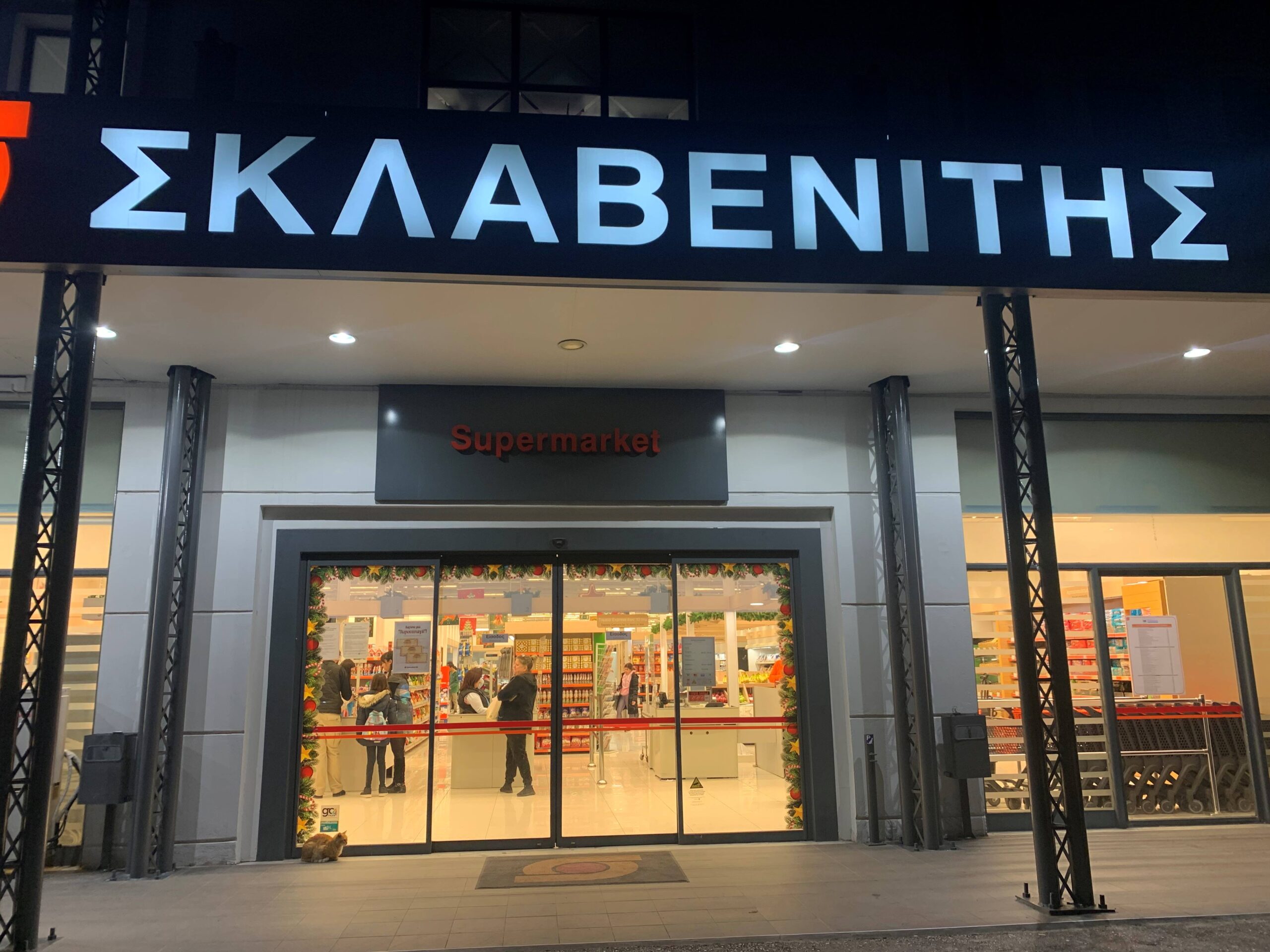 Supermarket front entrance is brightly lit and has sliding doors