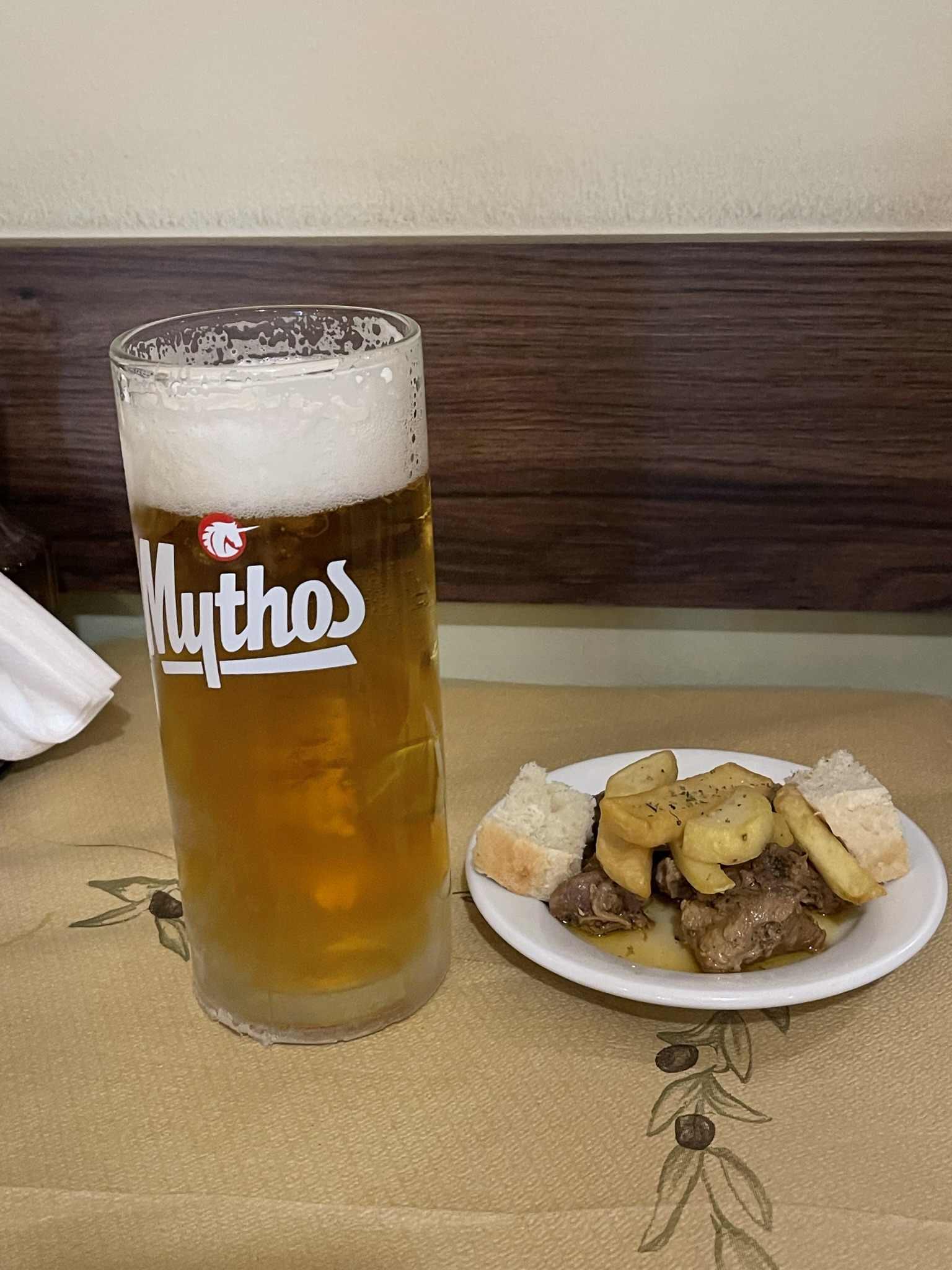 Mythos beer with a small plate of pork souvlaki