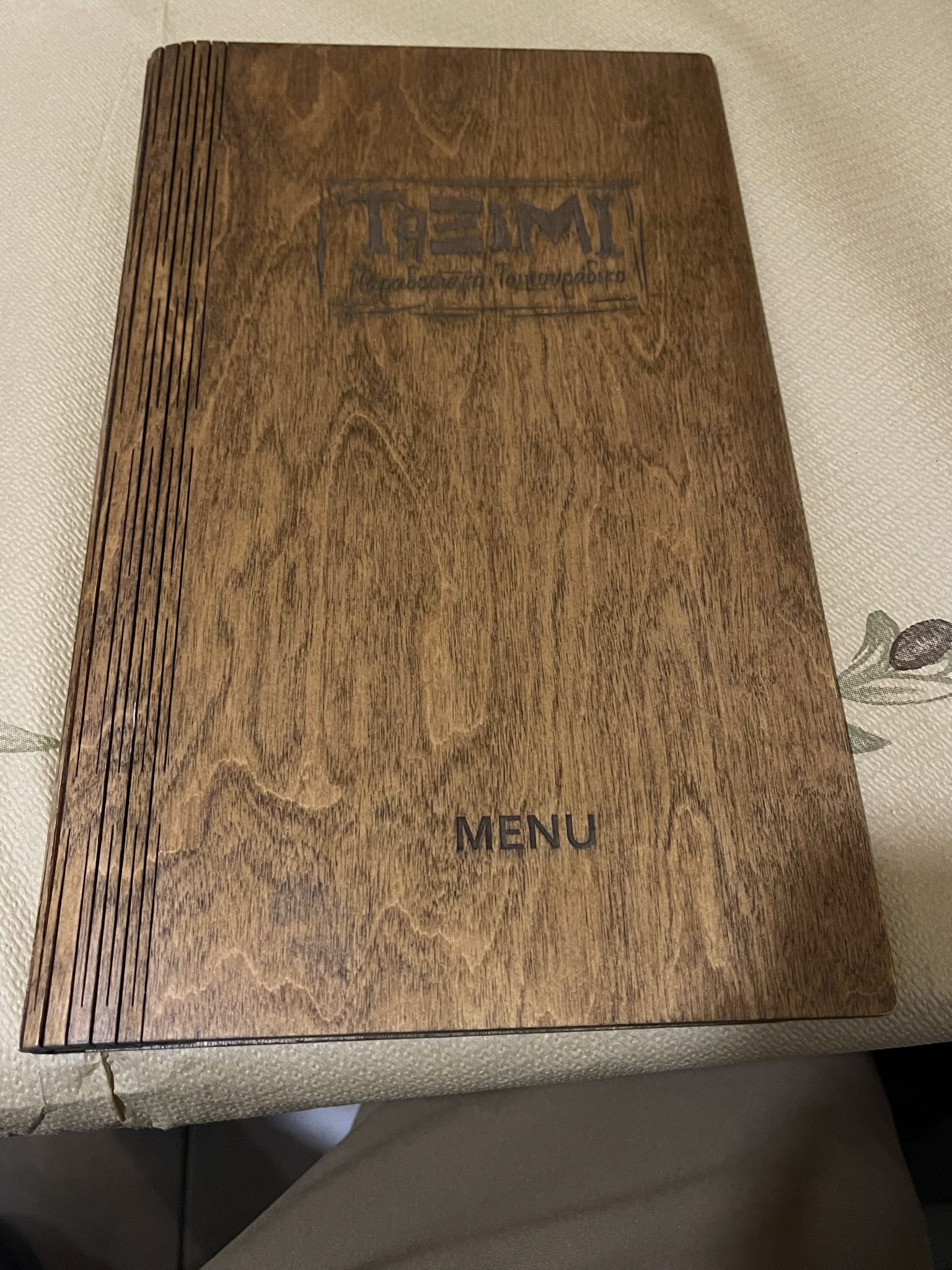 The taksimi tavern's cover menu is made of faux wood