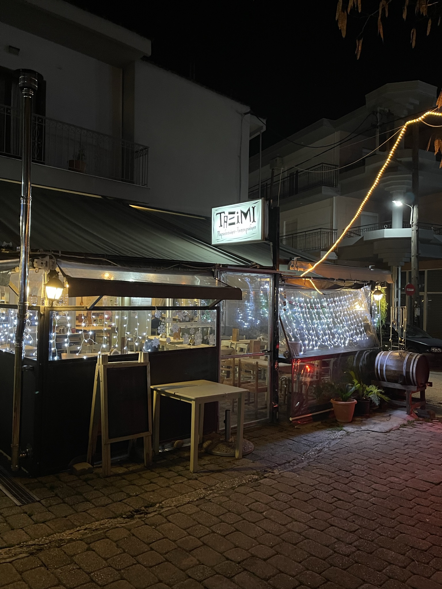 Taksimi Tavern's entrance is lighted up with fairy lights and a sign.
