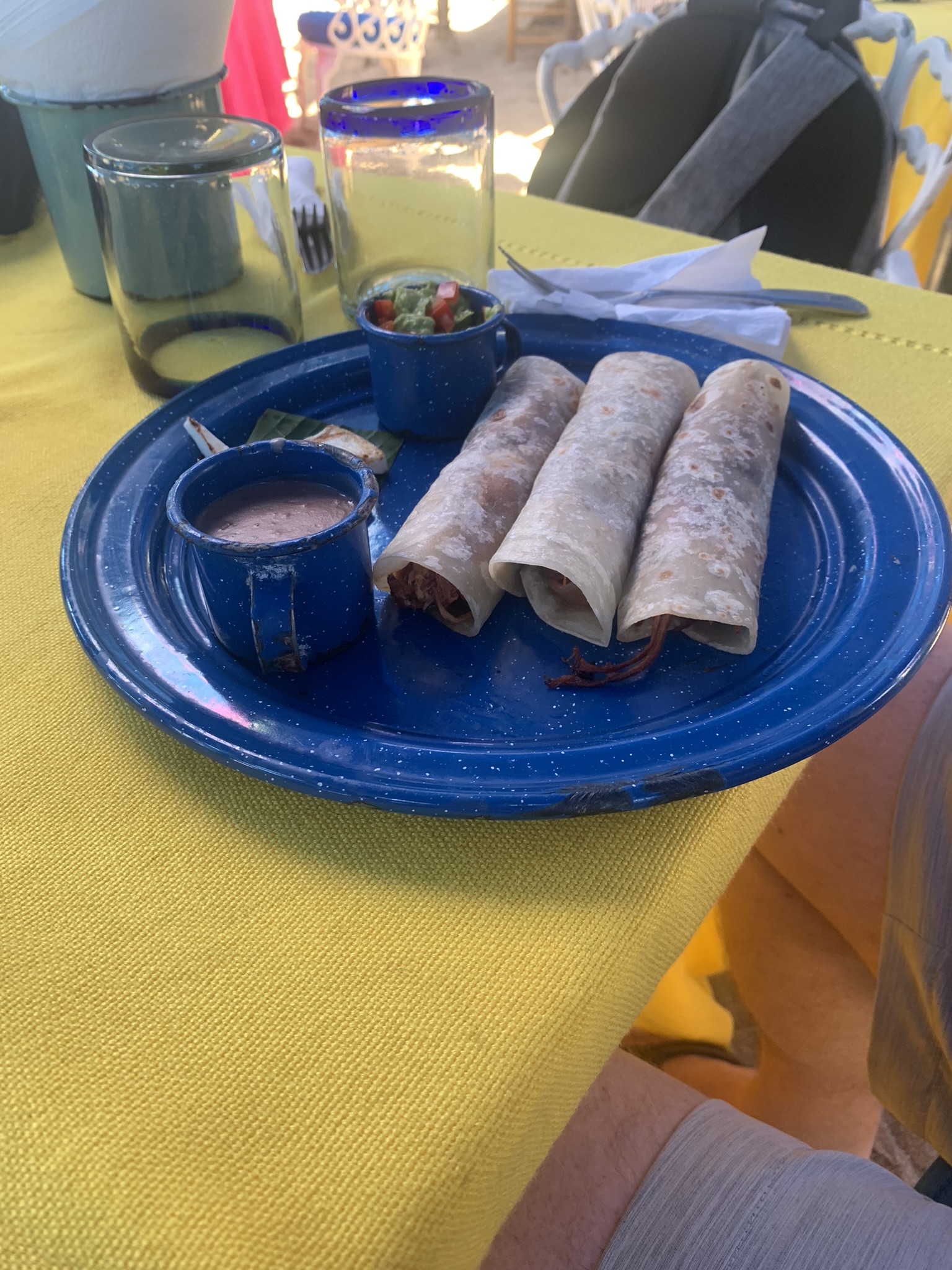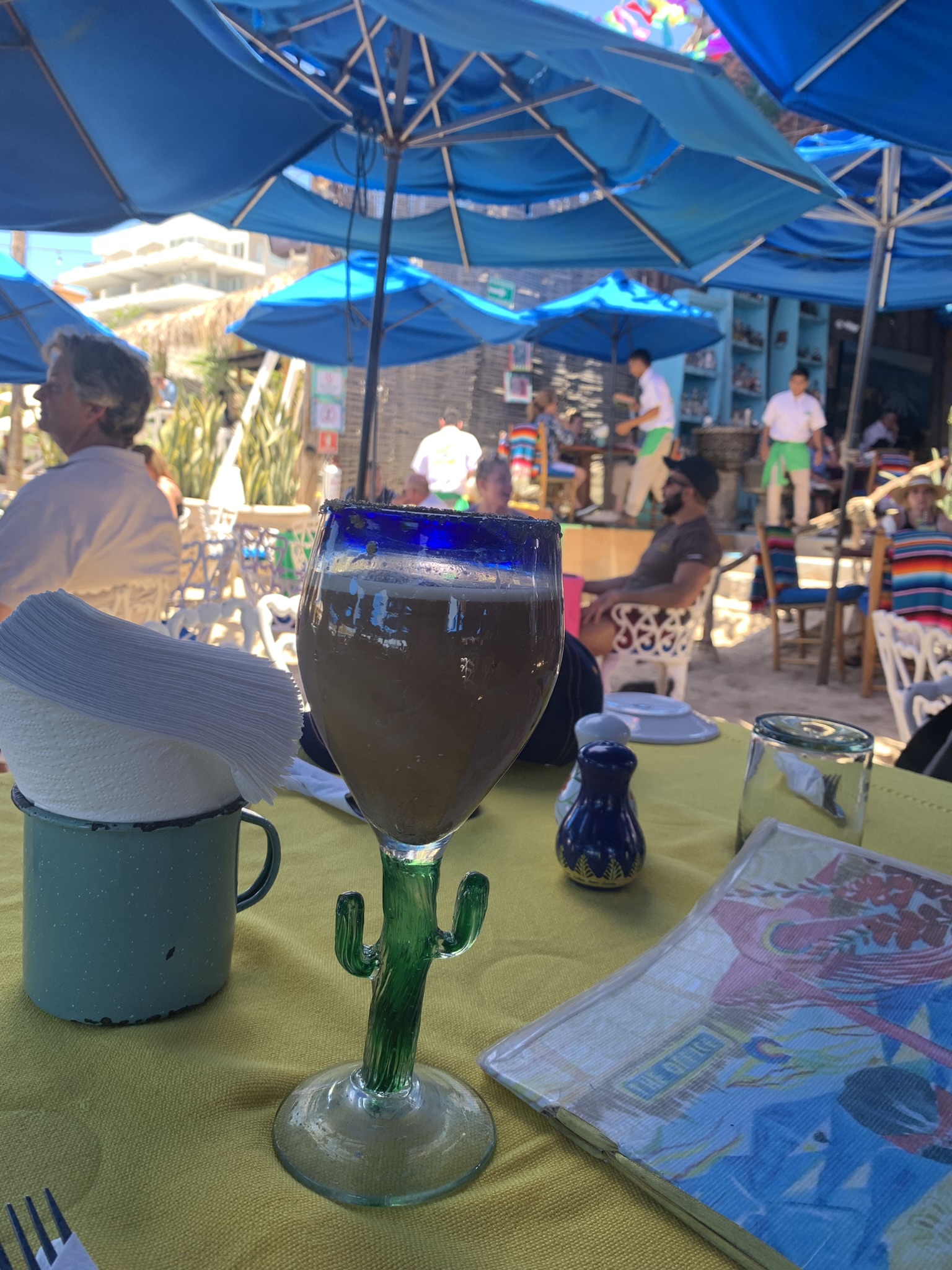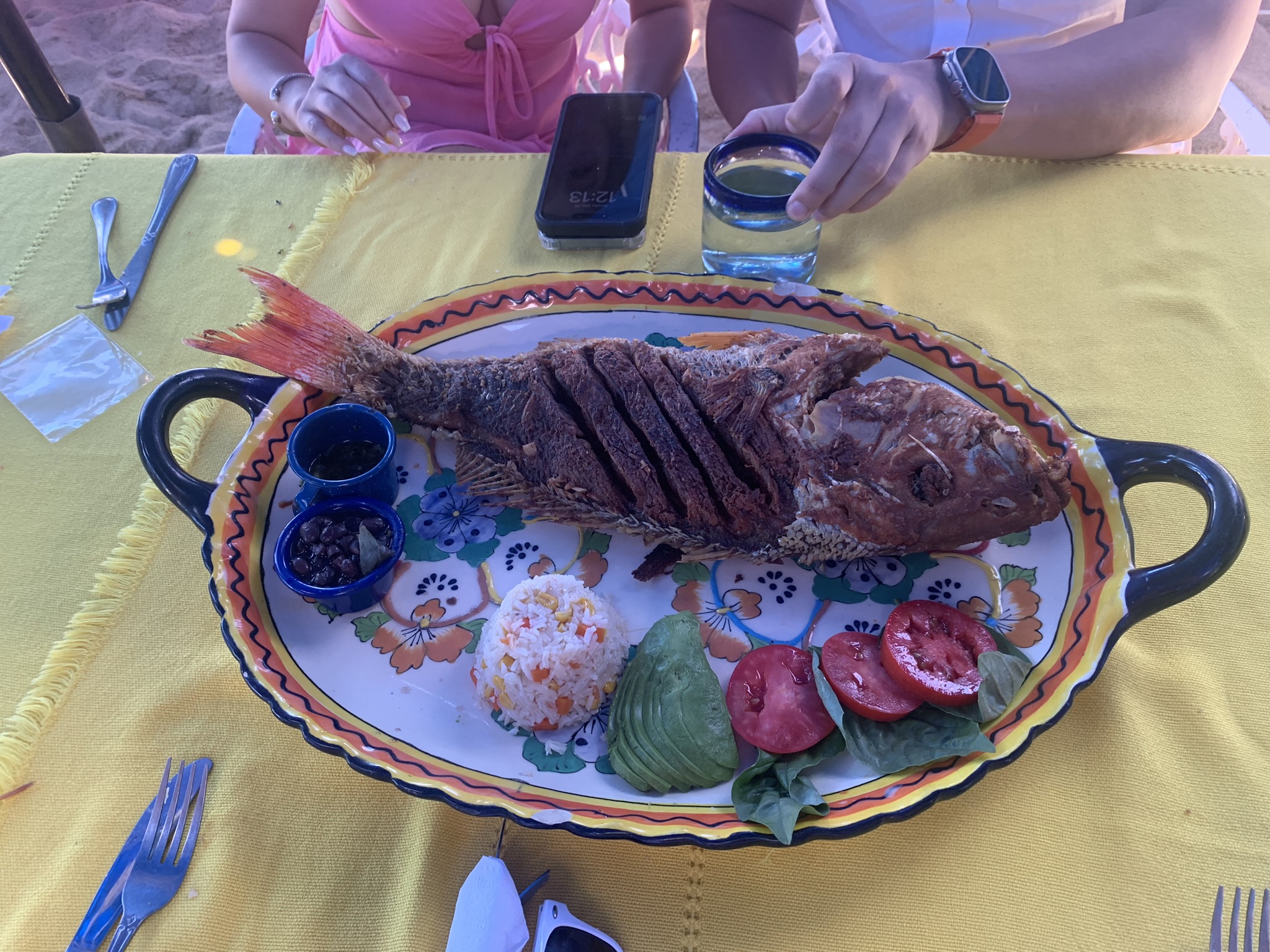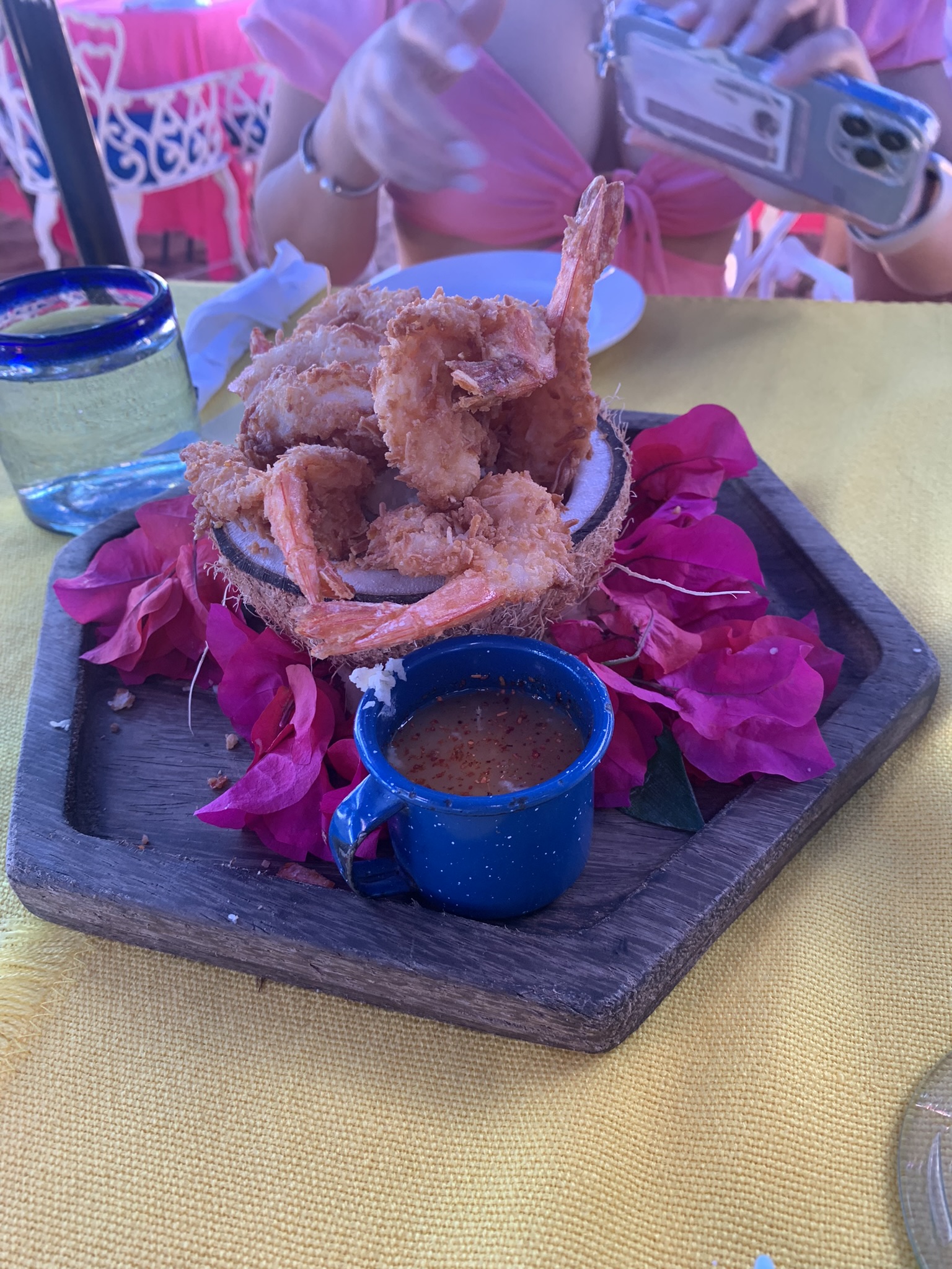 The hostess provided us with a beachside table and an additional umbrella to ensure that everyone had seating in the shade. We ordered drinks for the table – 2 bottles of water ($7.5 each) and 2 Mexican coffees ($12 each). Then, the waiter took our food order, which was tortilla soup ($10) deep fried red snapper (2 kg for $91), coconut shrimp ($45), Baja burrito ($20).